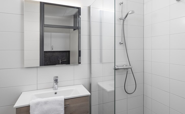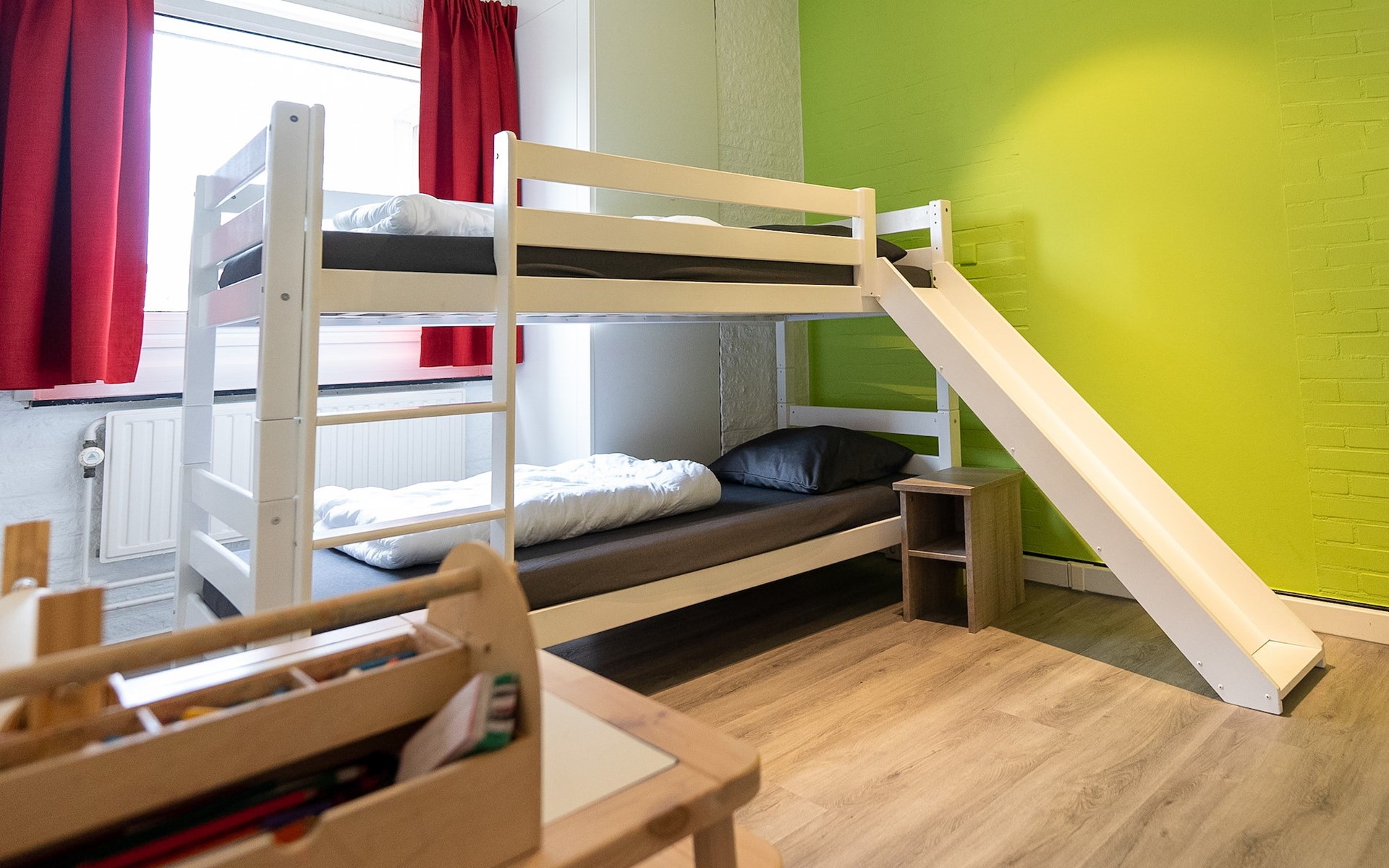 The apartment has three bedrooms, two of which have two single beds. The third bedroom is furnished as a children's room with a bunk bed with slide and various Senno-themed accessories. The bathroom has a walk-in shower, washbasin and a toilet.