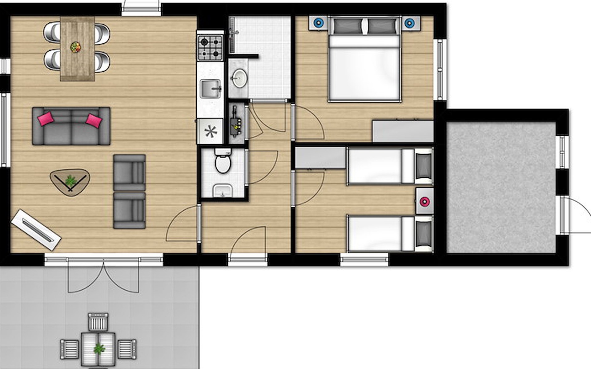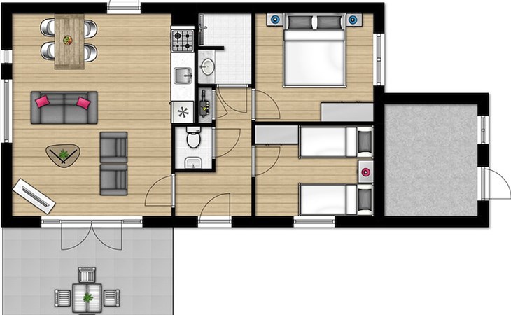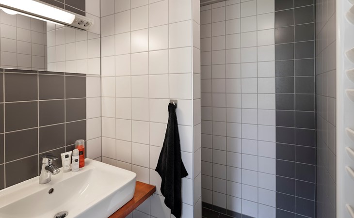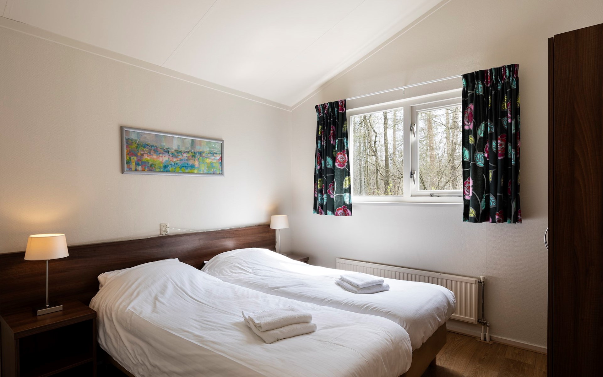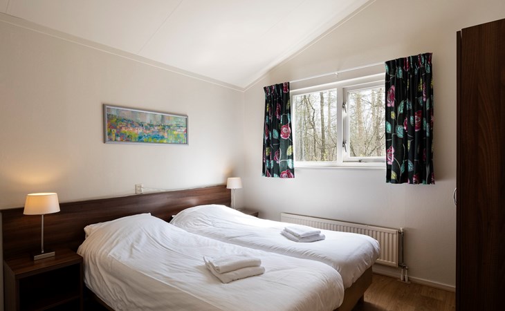 The bungalow has two bedrooms. Both bedrooms have two single box spring beds. The bathroom has a walk-in shower and washbasin. Furthermore, there is a separate toilet.