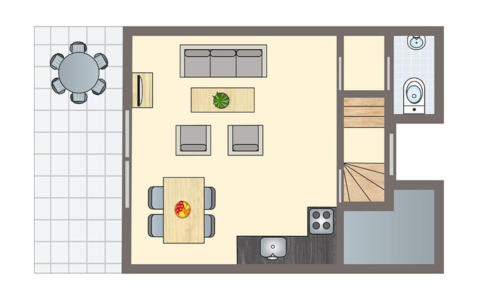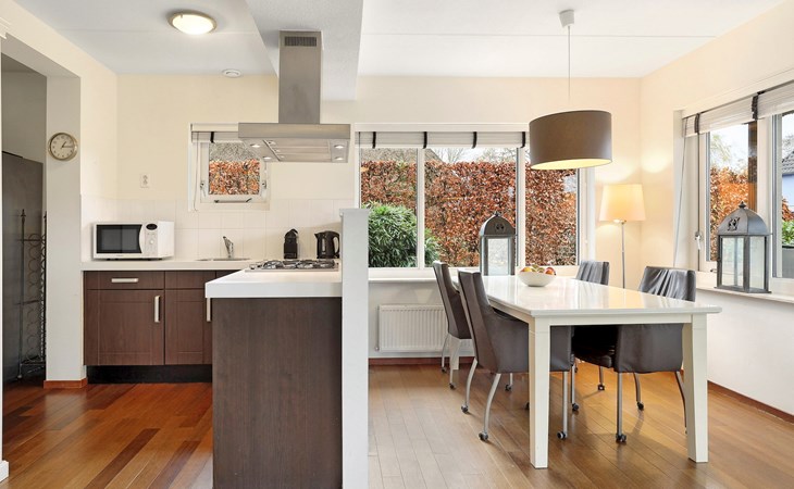 The living room is furnished with a seating area, television, CD and DVD player and a radio. The bungalow has an open kitchen with a dining area. The kitchen appliances include a fridge with freezer compartment, microwave, Nespresso coffee machine and a dishwasher. There is a separate toilet on the ground floor. In addition, the bungalow has a washing machine and dryer.