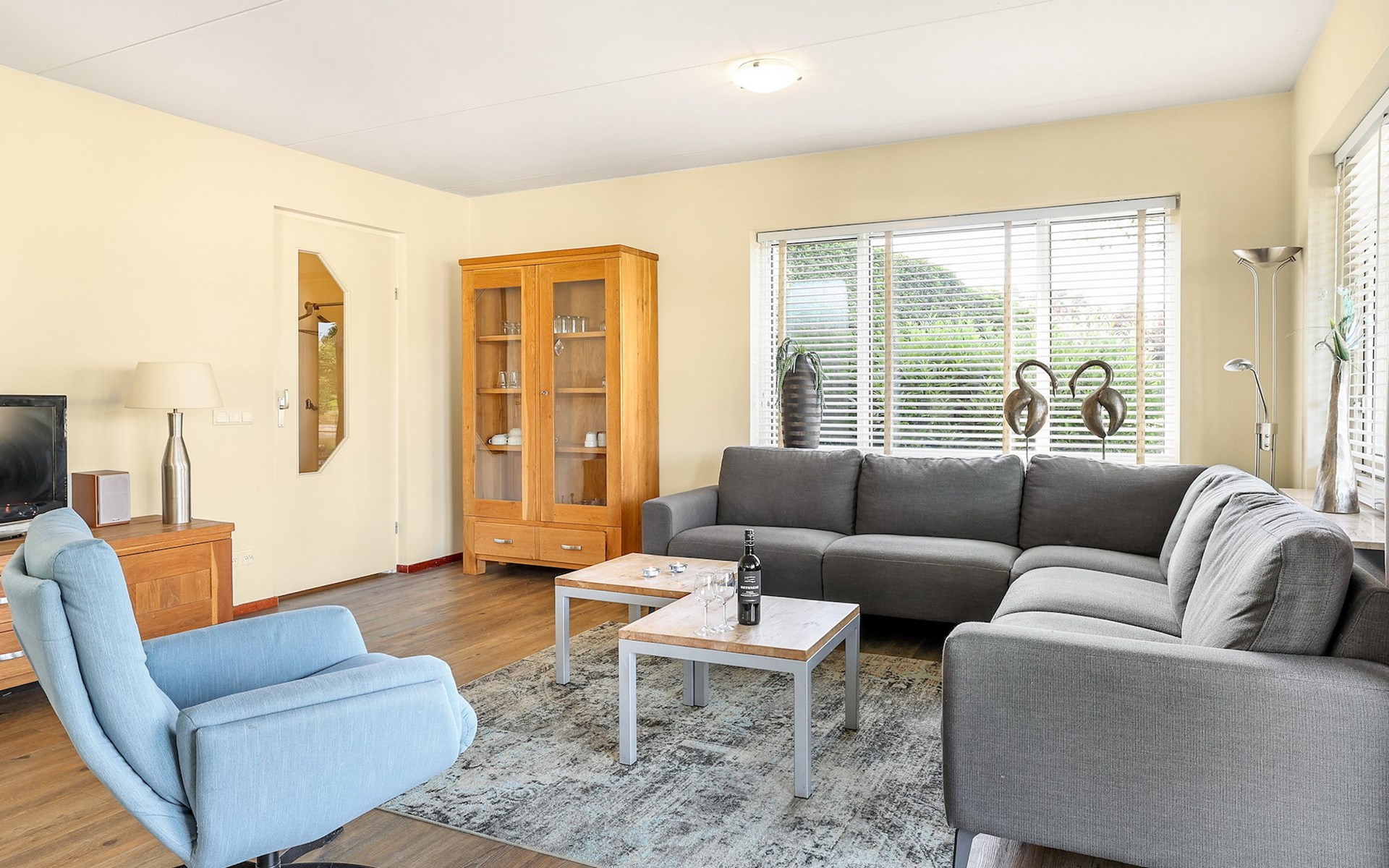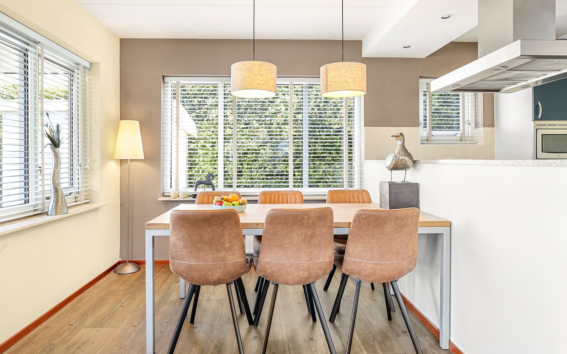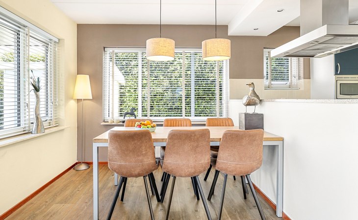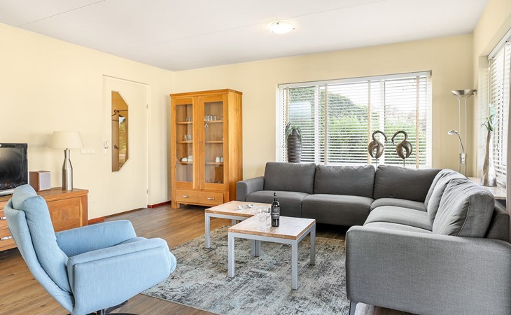 The living room is furnished with a sitting area, television, CD and DVD player and a radio. The bungalow has an open kitchen with a dining area. The kitchen appliances include a fridge with freezer compartment, combination microwave, Nespresso coffee machine and a dishwasher. Furthermore, there is a separate toilet on the ground floor. The bungalow also has a separate room with washing machine and dryer.
