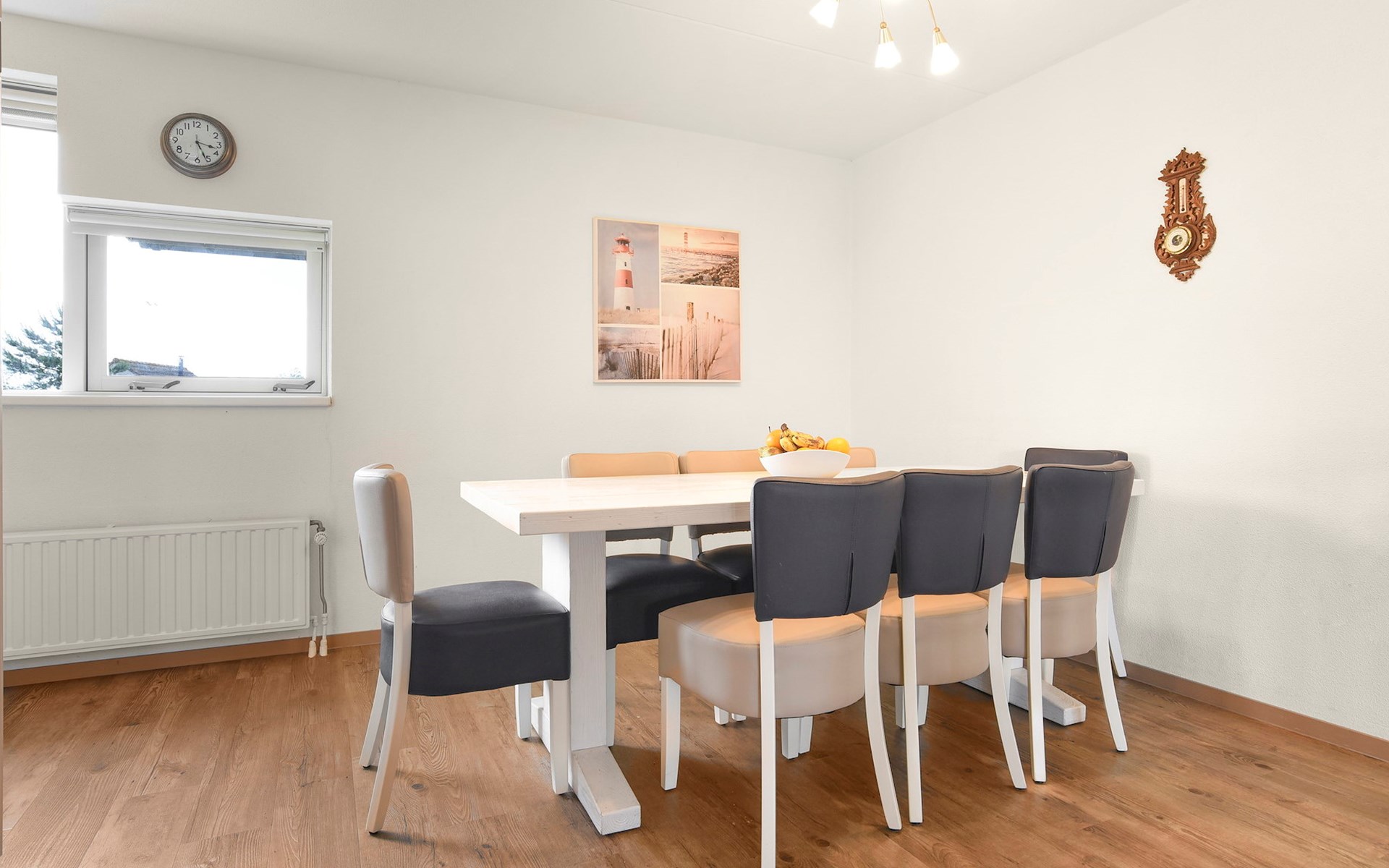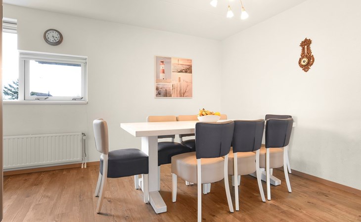 The living room is on the first floor. It is furnished with a seating area, television with built-in Chromecast, radio, bluetooth soundbar and a game box. The bungalow has an open kitchen with a dining area. The kitchen appliances include a fridge with freezer compartment, Senseo coffee machine, filter coffee machine, combination microwave and a dishwasher. The first floor also has a separate toilet and a washing machine.
