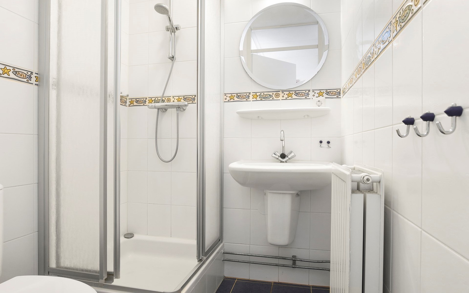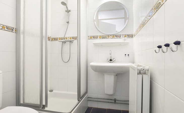 On the ground floor there are three bedrooms and the bathroom. In one of the bedrooms there are two single beds with a soft topper. The other bedrooms have two single box spring beds. The bathroom has a bath, double washbasin and a toilet.