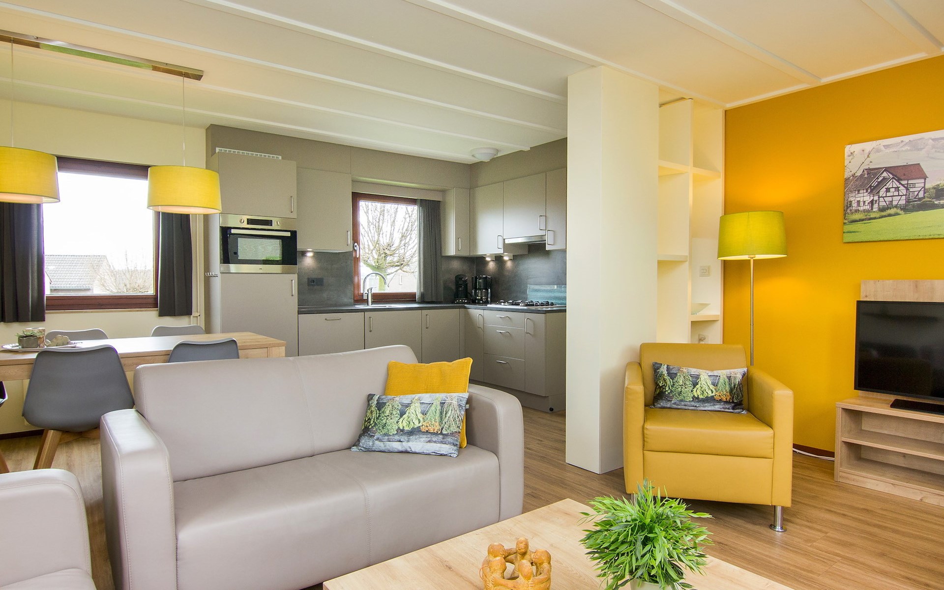 The living room is furnished with a sitting area and television. The bungalow has an open kitchen with dining area. The kitchen appliances include a fridge with freezer compartment, Senseo coffee machine, combination microwave and dishwasher.
