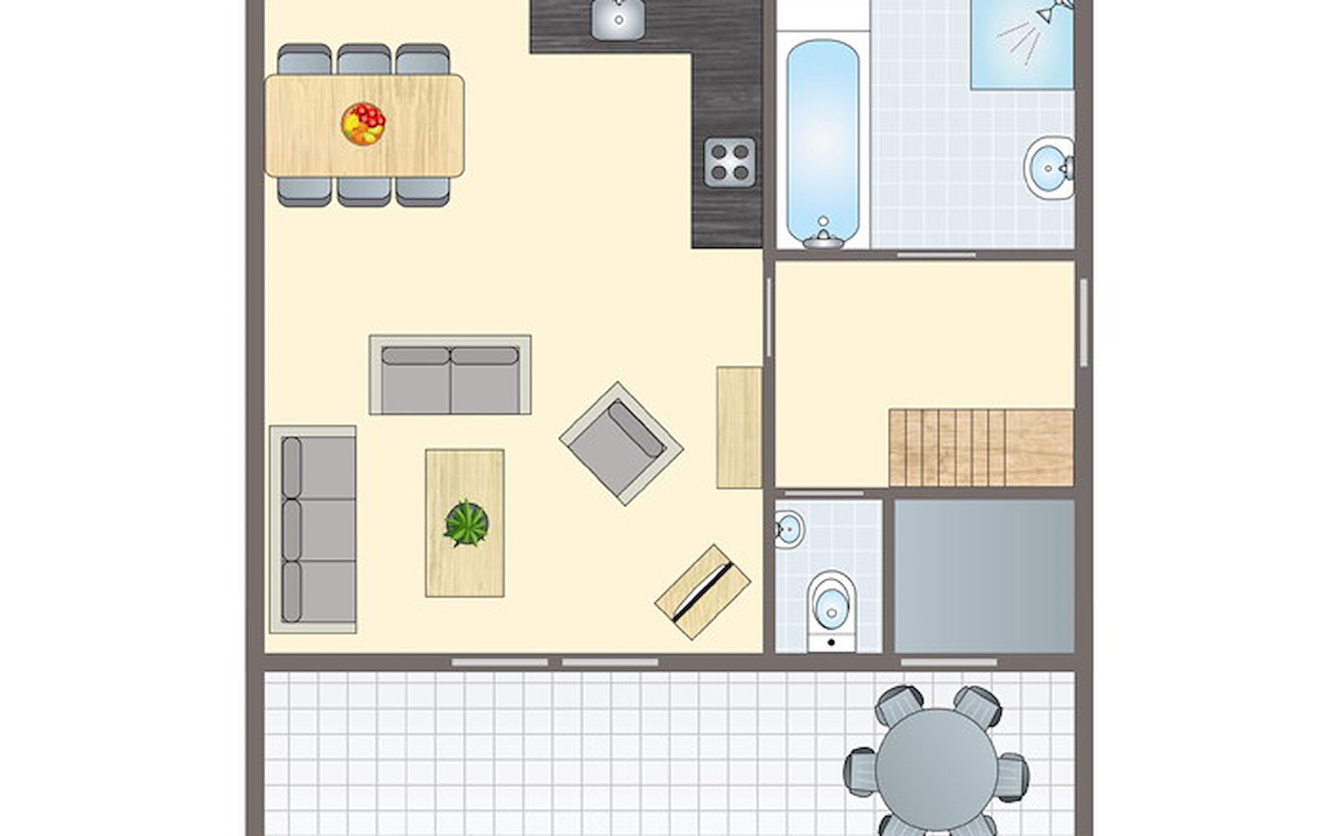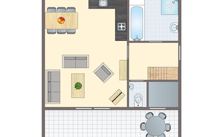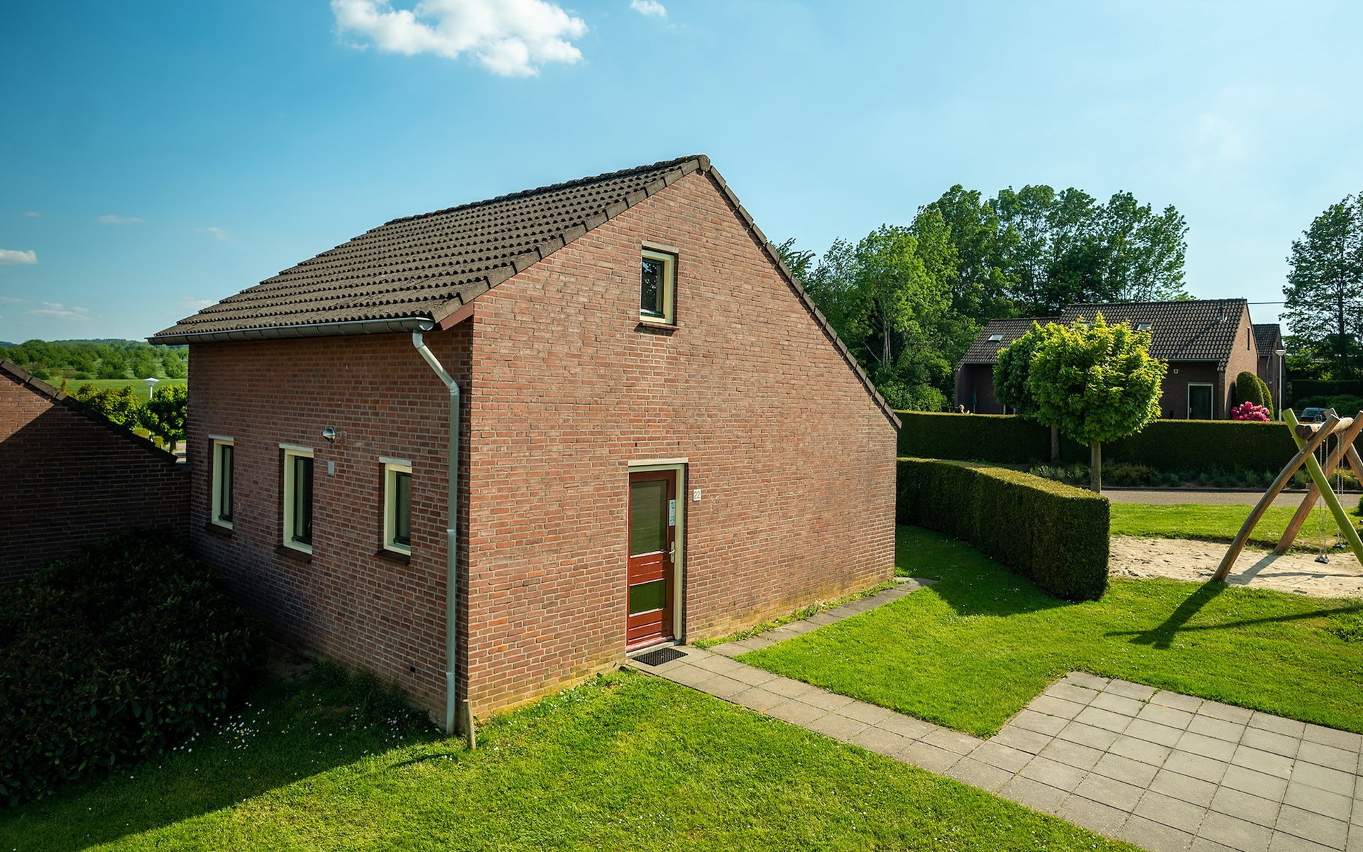 The bungalow has a furnished patio with a parasol. The bungalow has an internal storage room, which is not suitable for bicycles.