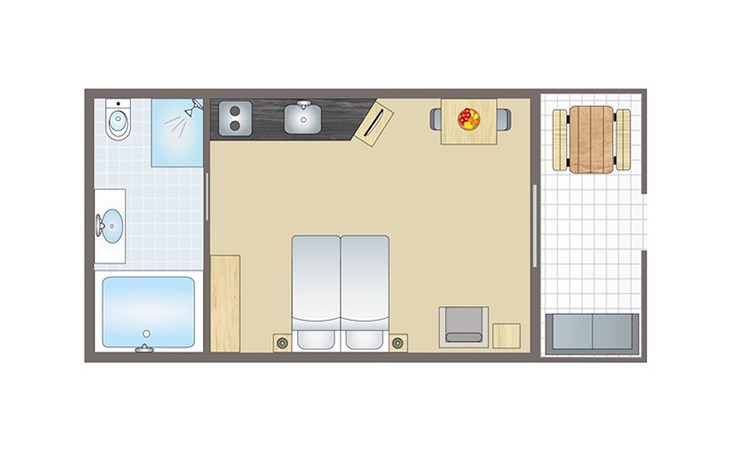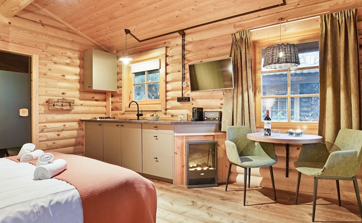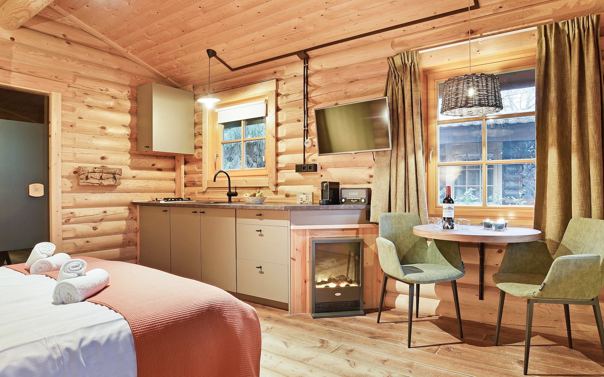 Loghome 2B at Summio Parc Duc de Brabant is suitable for up to 2 people. This detached log cabin is situated at the edge of the park and has a living room/bedroom and one bathroom.
