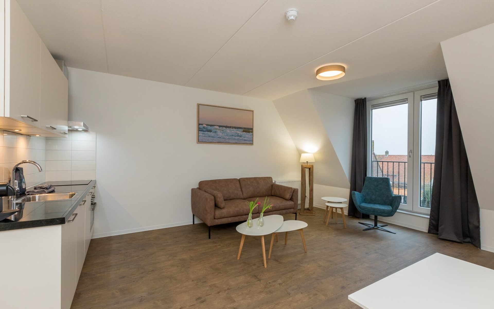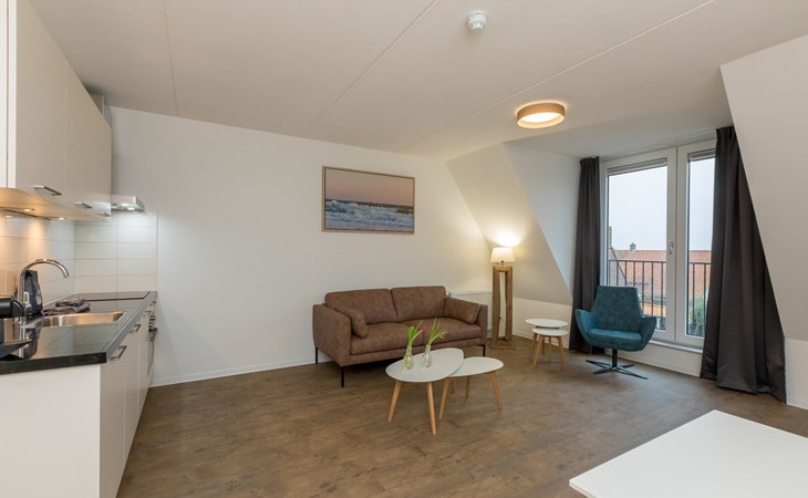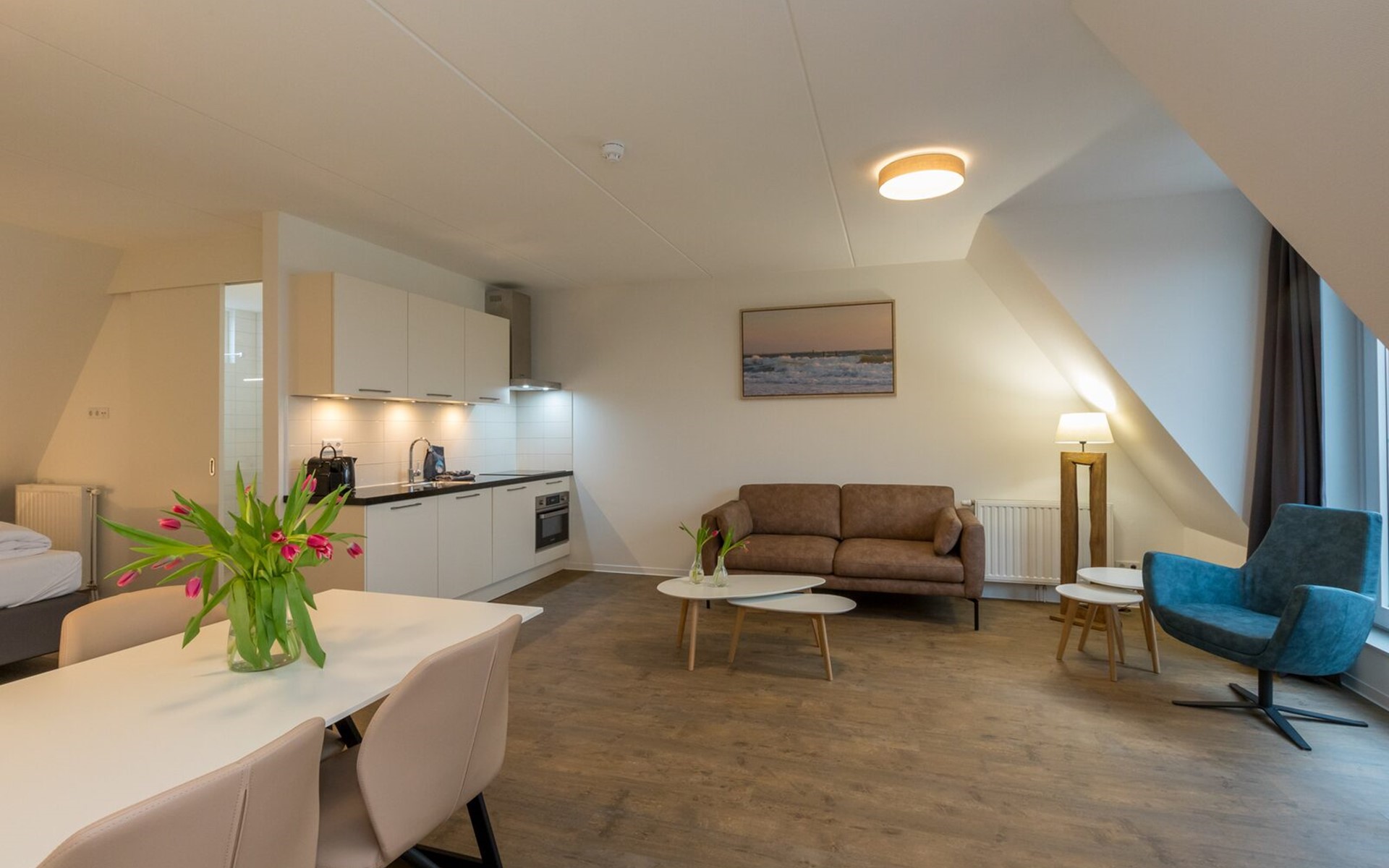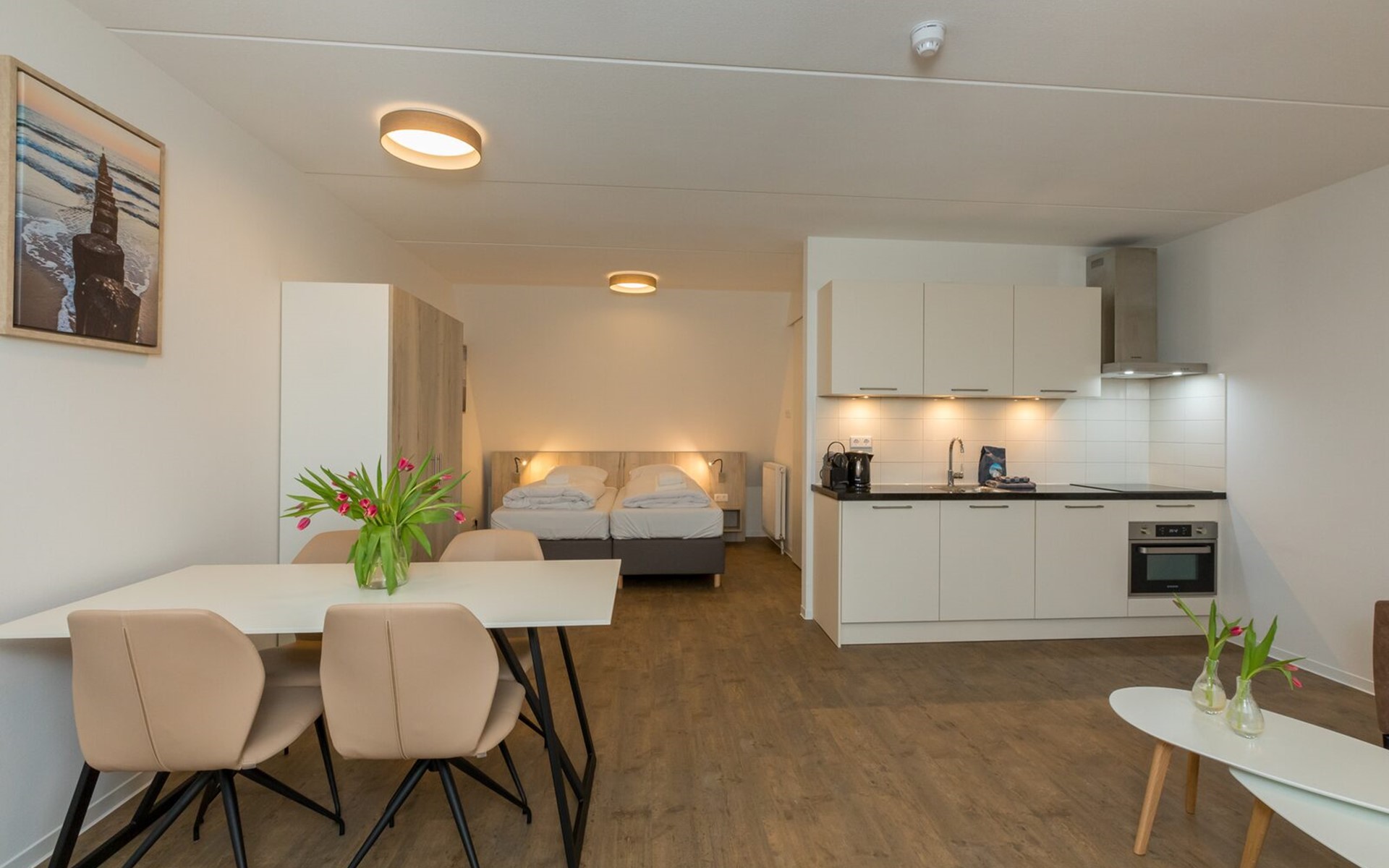 Celebrate holidays in luxury and comfort. The luxury studios have the comfort of a hotel room with the convenience of a studio. A comfortable double box spring bed to snuggle in after a long vacation day. Each studio has a seating area and a kitchen. This is furnished with a kettle, fridge, dishwasher, oven, filter coffeemachine and espresso. There is also a spacious bathroom with a double sink, shower, hairdryer and toilet. Es gibt kein Aufzug.