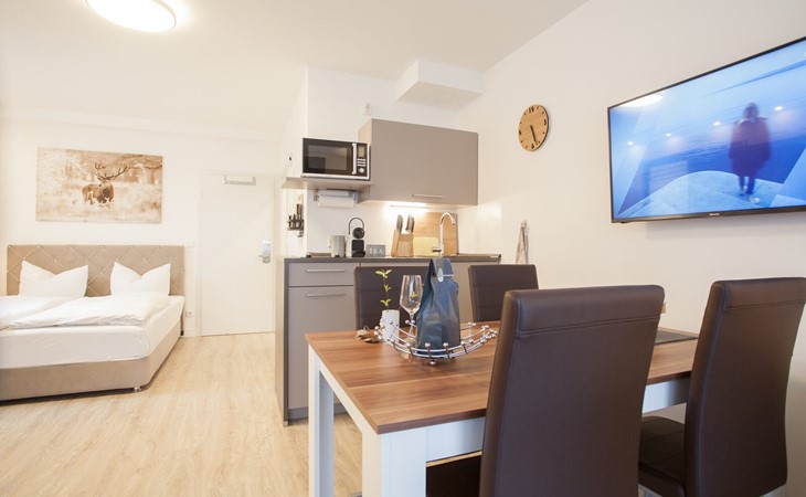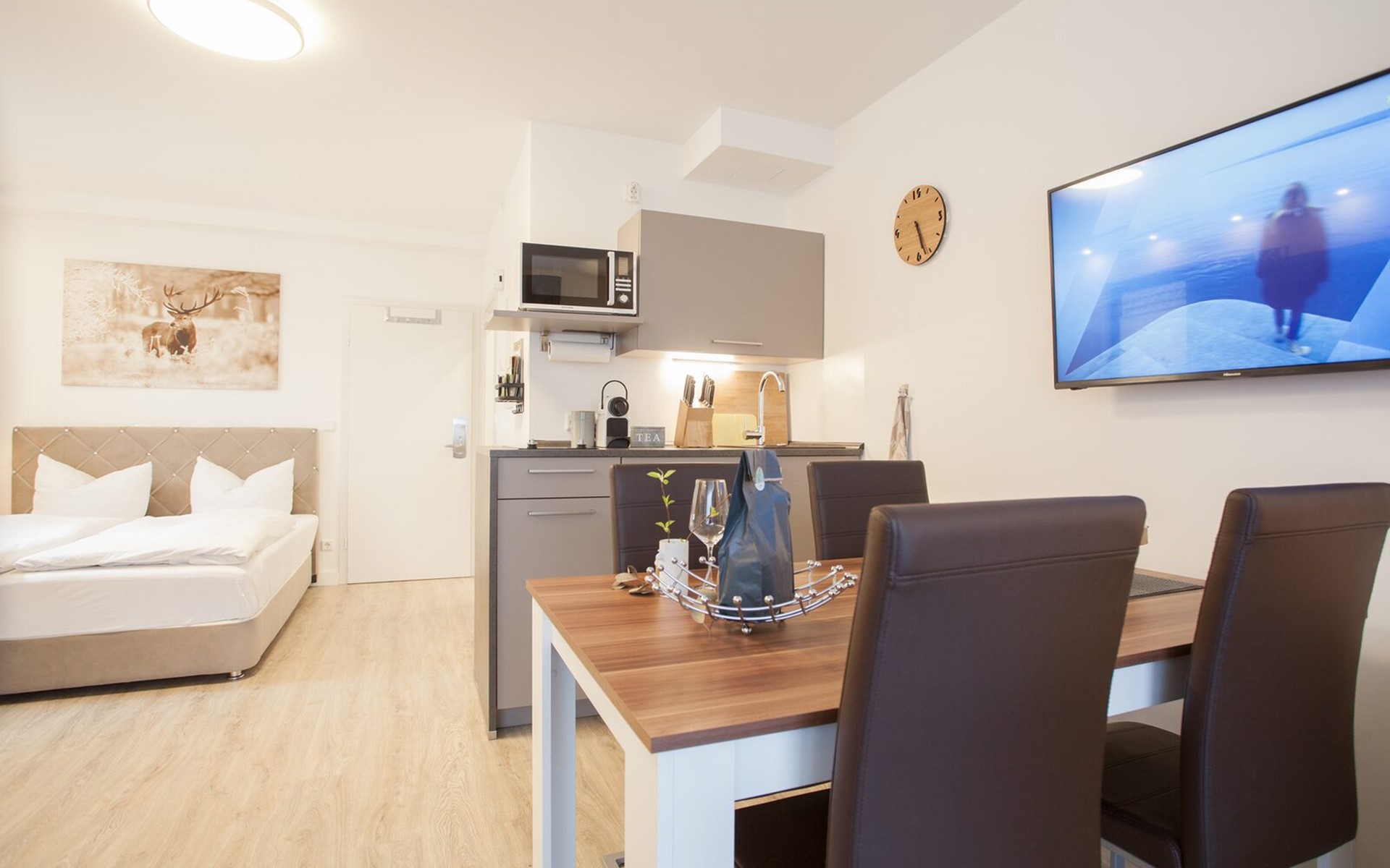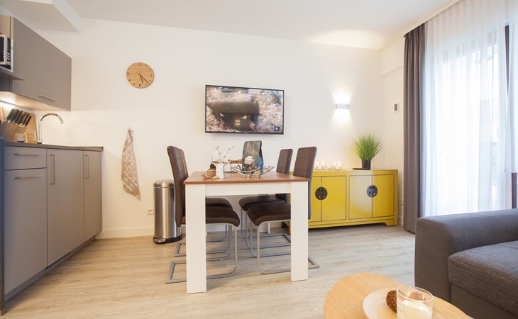 Onlangs gerenoveerd, licht en modern: deze studio is een heerlijke verblijfplaats voor een actieve vakantie. Er is ruimte voor maximaal drie personen en de woning beschikt over gratis wifi. De volledig uitgeruste keuken bevat een fornuis met twee keramische platen, magnetron, toaster, vaatwasser, waterkoker, koelkast met vriesvakje en Nespresso-koffiezetapparaat. De comfortabele hoekbank in de woonkamer is tevens een slaapbank, tevens is er een tweepersoonsboxspringbed van 160 centimeter breed. Er is een afzonderlijke badkamer met douche, föhn, toilet en wastafel. De eethoek biedt ruimte voor vier personen. Ook buiten kunt u heerlijk zitten: het terras met barbecue grenst aan de gemeenschappelijke tuin. Daar vindt u een schommel voor de kleine bezoekers. Geniet hier van het prachtige uitzicht.