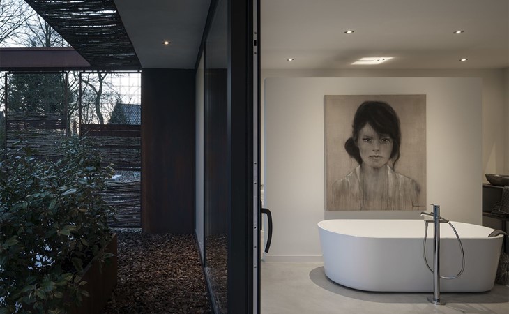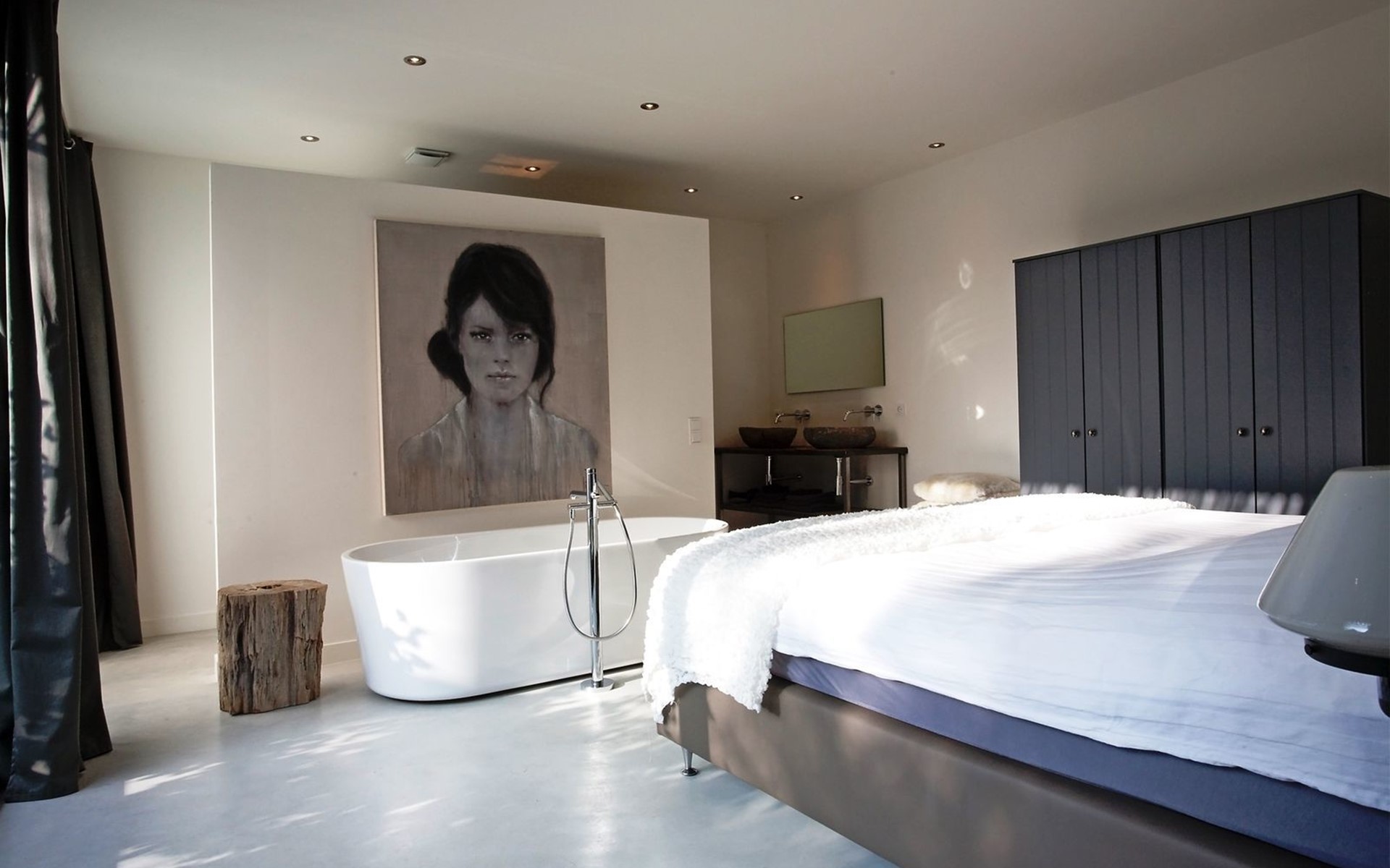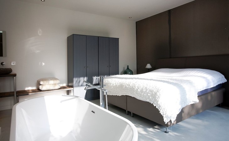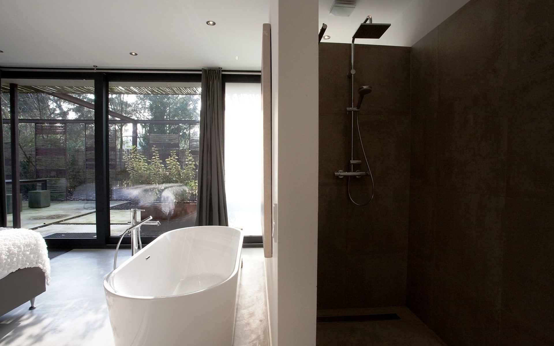 In de slaapkamer staat een ligbad, om de hoek is een ruimte met inloop (regen)douche en dubbele wastafel.