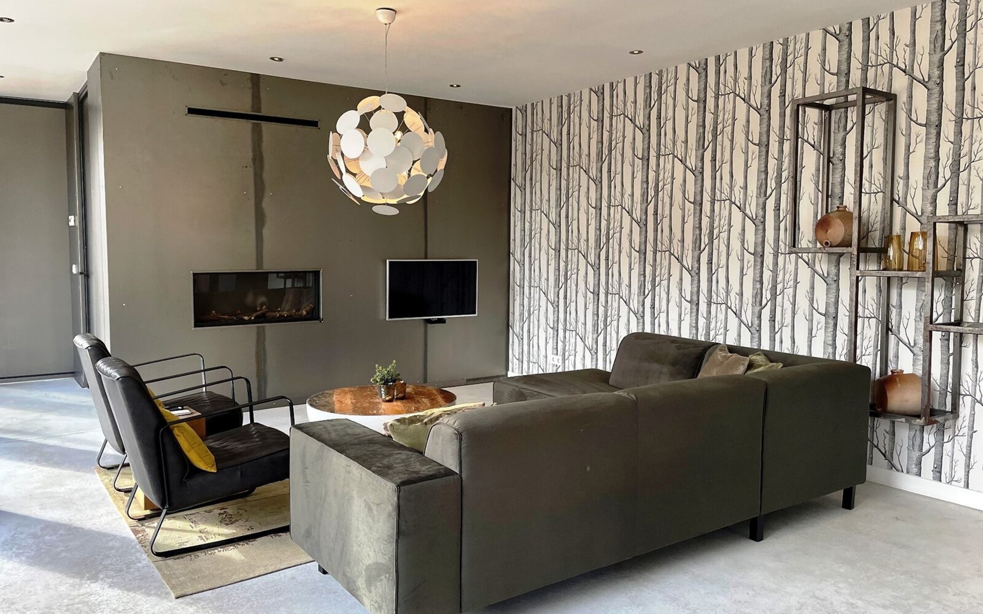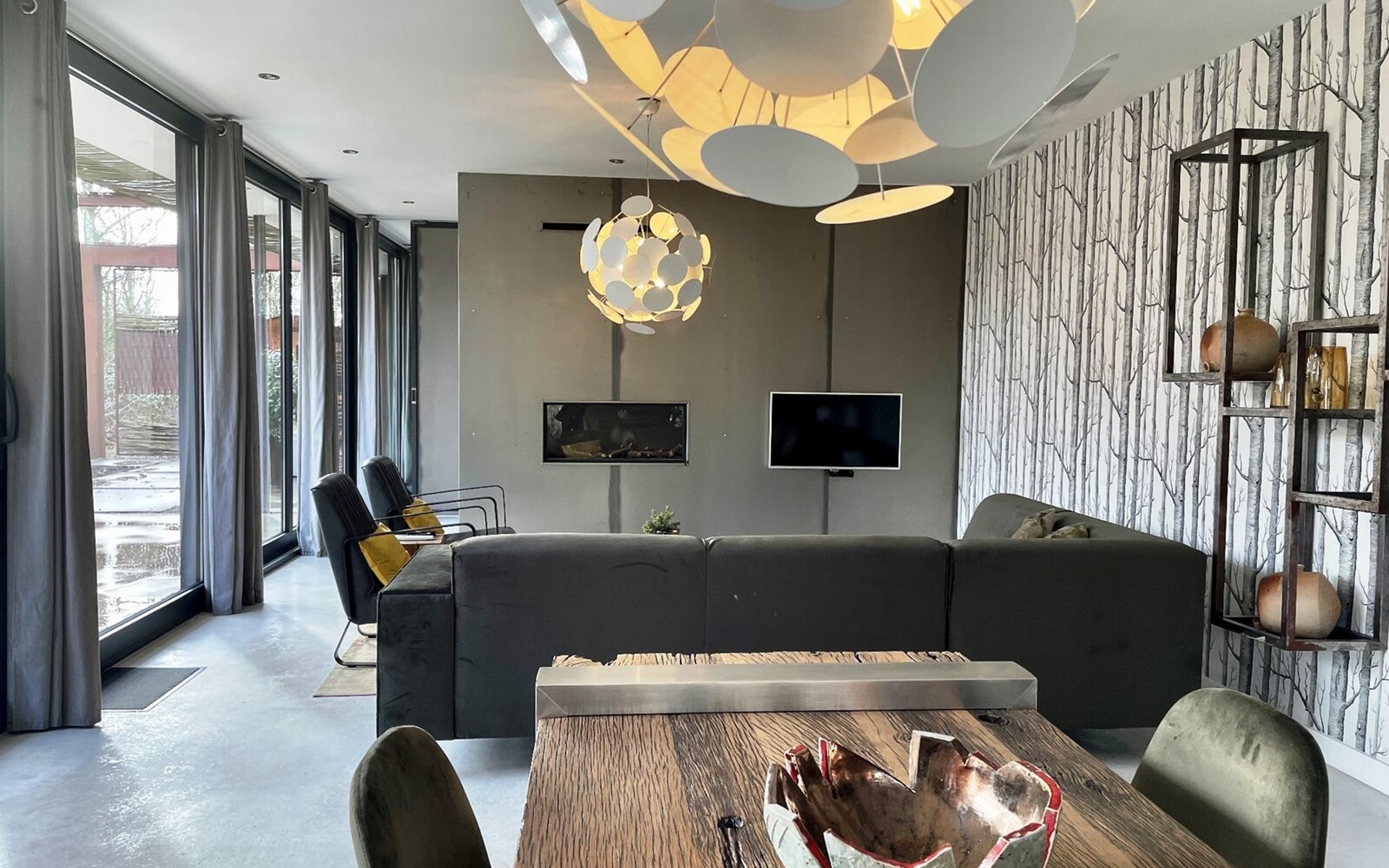 De woonkamer heeft een moderne inrichting met moderne meubels zoals een loungebank, gashaard, breedbeeld TV, muziekinstallatie (muziekzenders en afspelen via smartphone). Over de hele lengte is een glazen pui en is de living heerlijk licht. Bij mooi weer kunnen de deuren geopend worden.