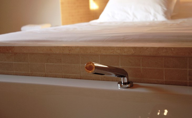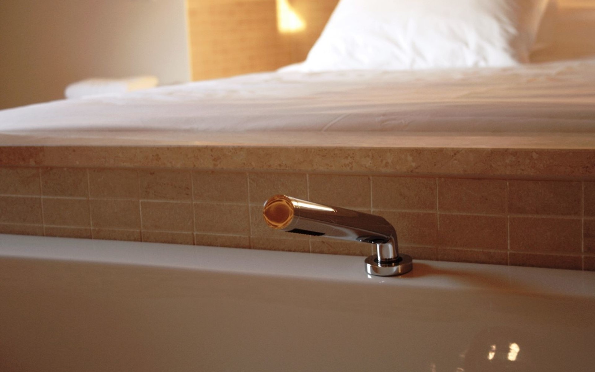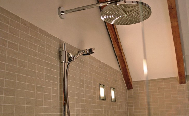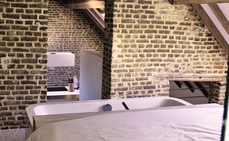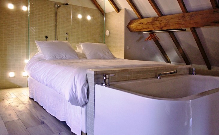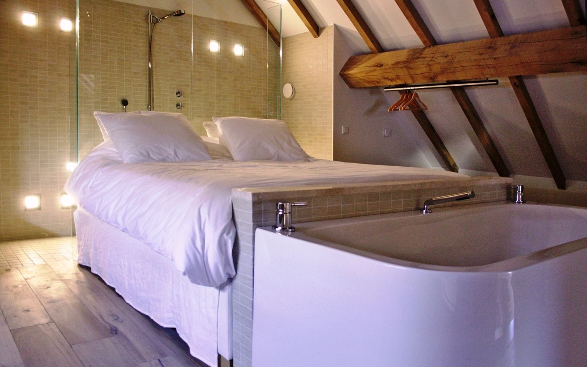 Via stalen traptreden bereikt u het slaap- en badgedeelte met in het midden het tweepersoonsbed (lits jumeaux). Het bad staat letterlijk aan je voeten, de douche met glazen wand (handdouche en regendouche) achter het bed maakt badderen tot een feest. Apart toilet. De houten vloer heeft vloerverwarming.