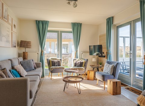 Open leef-/slaapruimte met loungebank en tv en eettafel voor 6 personen.