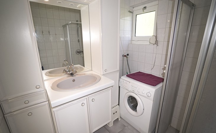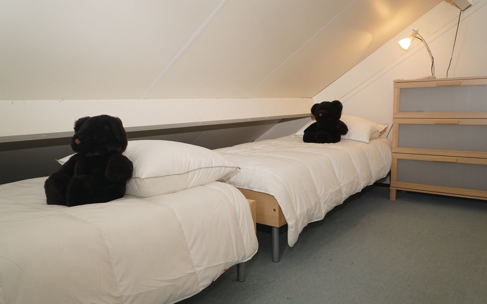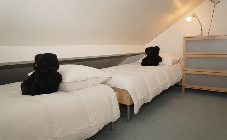 Op de zolder, die te bereiken is via een vlizotrap, is nog een slaapkamer met een tweepersoonsbed en een kamer met 2 enkele bedden. Matrassen 6 x 80 x 200. Aan de hal grenst de badkamer met wasmeubel en douchecabine. Het toilet is apart. De woning heeft rolluiken zodat het tijdens de warme maanden aangenaam koel blijft.