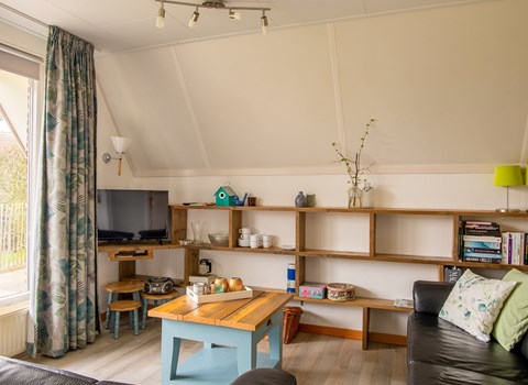 Je komt direct binnen in de woon/eetkamer. Een gezellige zithoek nodigt uit om te ontspannen. In de aangrenzende open keuken, die van alles is voorzien, kun je op elk moment heerlijke maaltijden bereiden en er samen van genieten aan de gezellige eettafel. Vanuit het keukengedeelte kom je via een schuifdeur in de badkamer, uitgerust met douche, toilet en wastafel. In de slaapkamer, grenzend aan de woonkamer, vind je een welverdiende nachtrust in een tweepersoonsbed van 160 x 200 cm. Eveneens vanuit het woongedeelte leidt een steile trap naar de open verbouwde zolder, waar twee op de vloer gelegde lattenbodems met hoge matrassen het tweepersoonsbed 160 x 200 cm vormen, waardoor het meer geschikt is voor tieners.