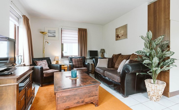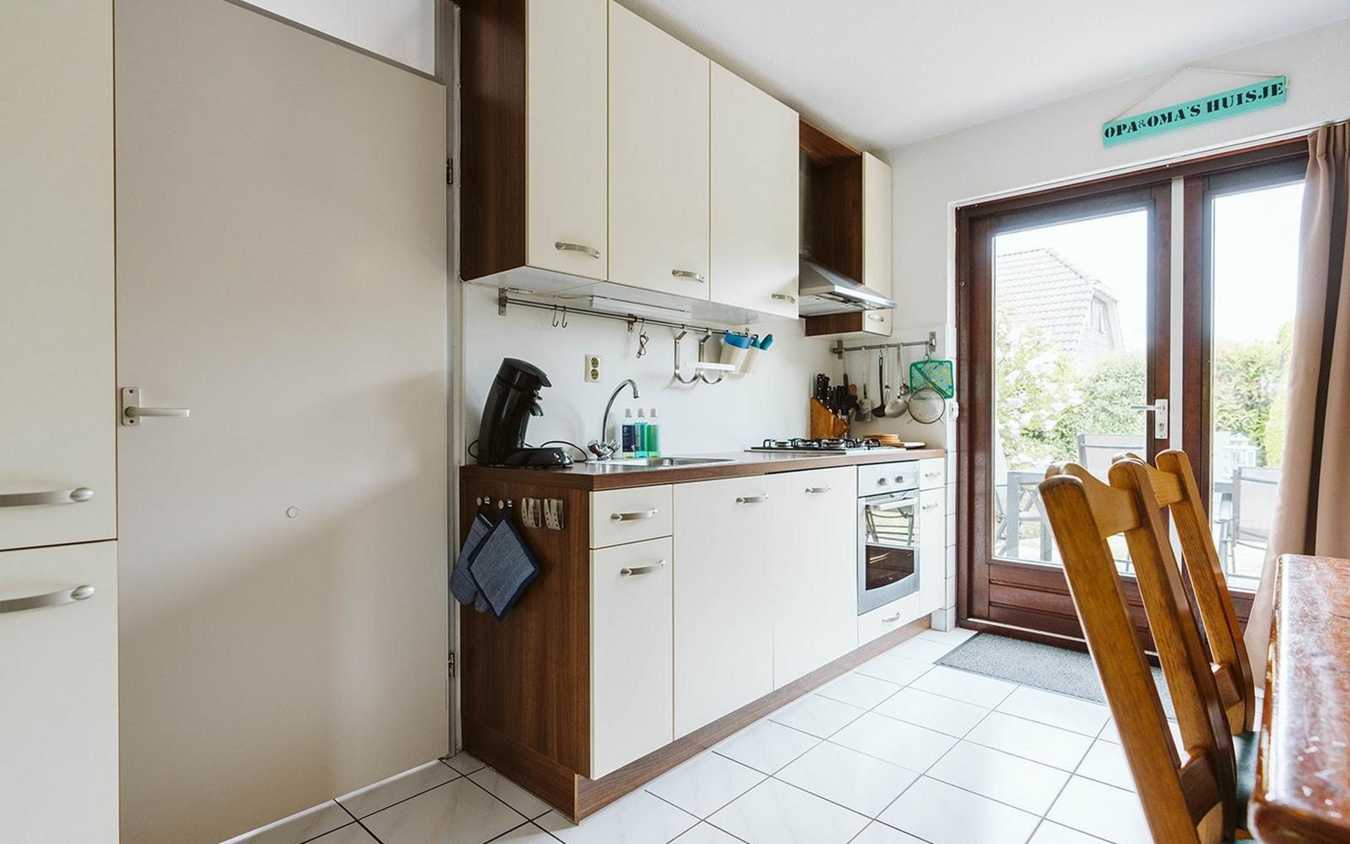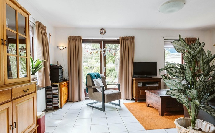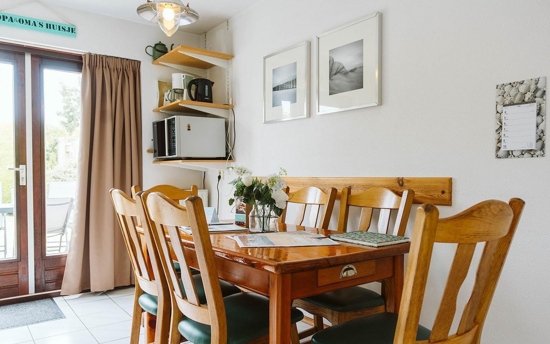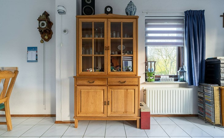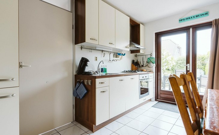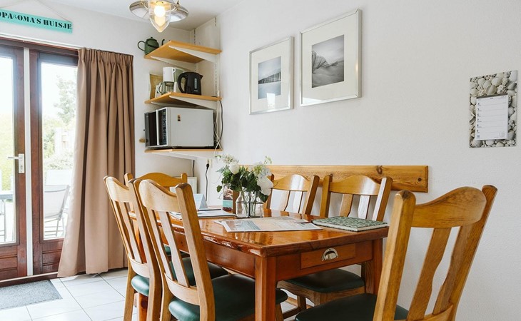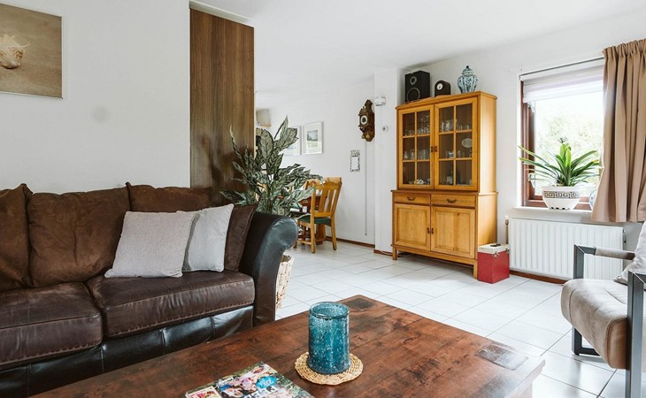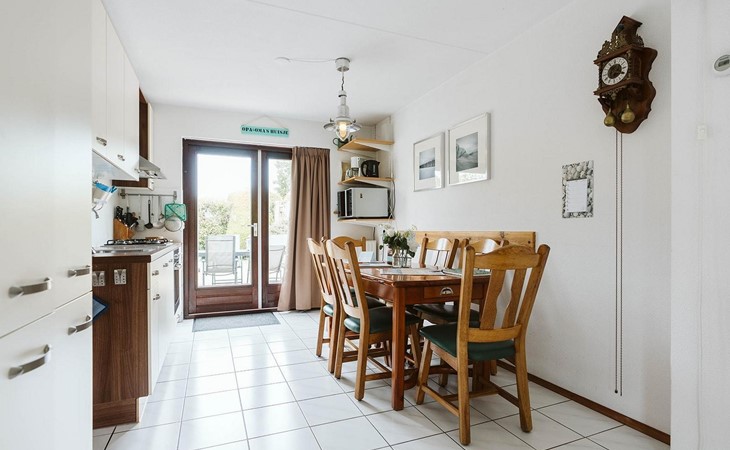 Vanuit de gang komt u in de badkamer met gelijkvloerse douche en wastafel en het aparte toilet met fonteintje. Een derde deur leidt naar de woon/eetkamer. Geniet van een maaltijd uit de volledig uitgeruste open keuken aan de rustieke eettafel. De woonkamer, ingericht met stijlvolle en deels nostalgische stoelen, heeft een gezellige uitstraling.