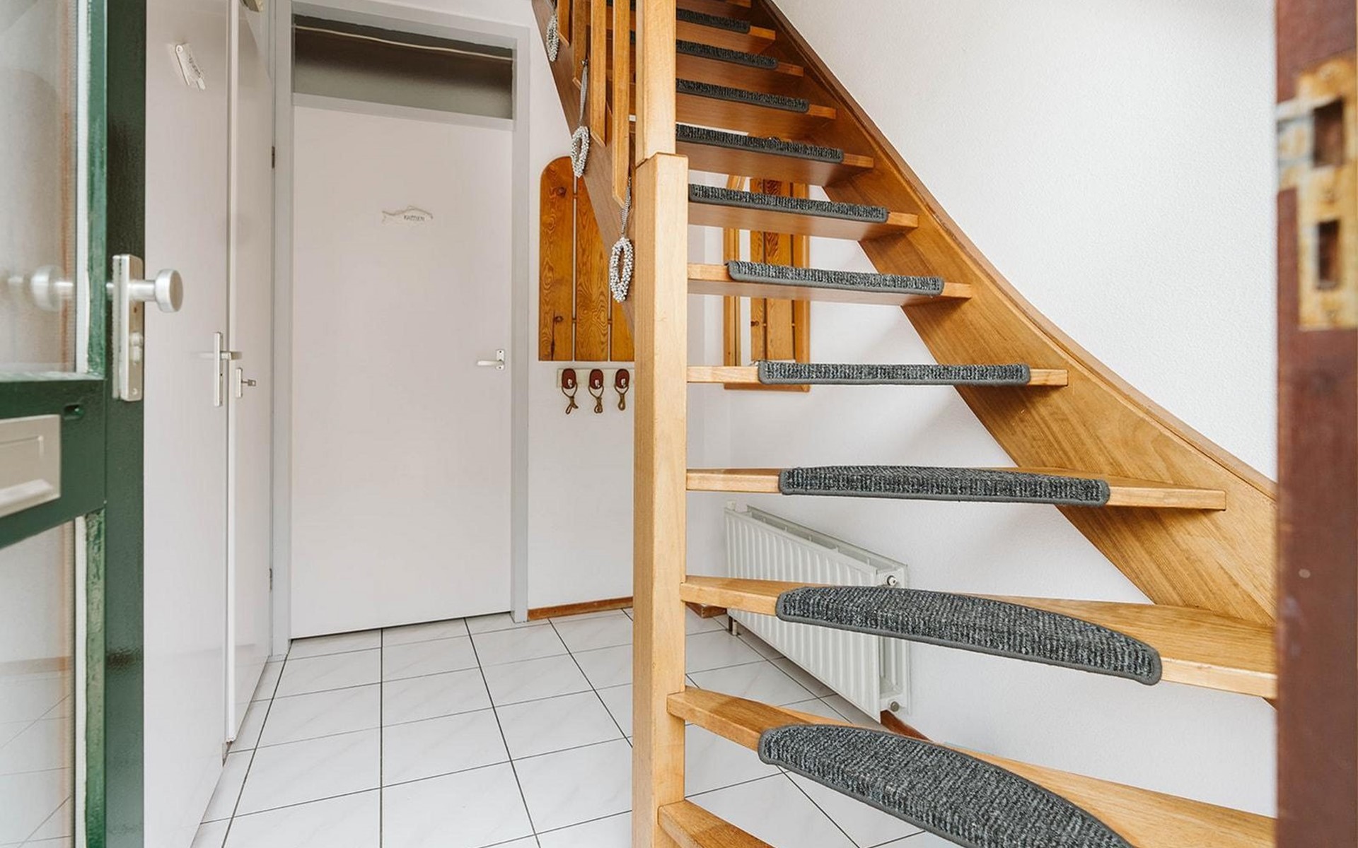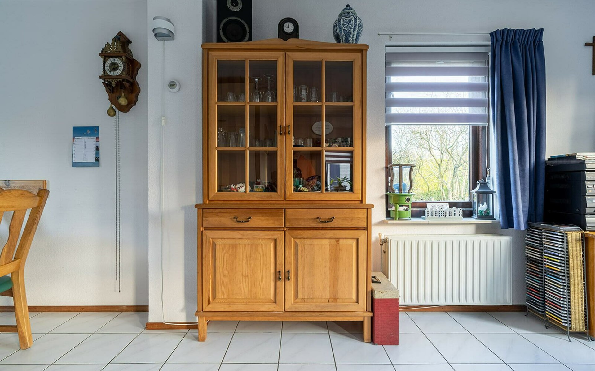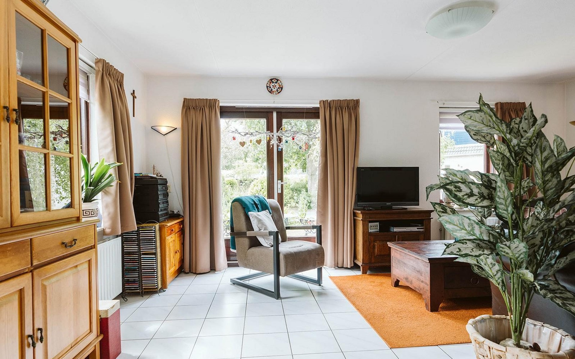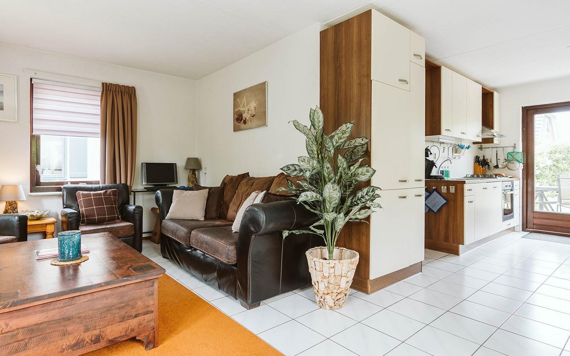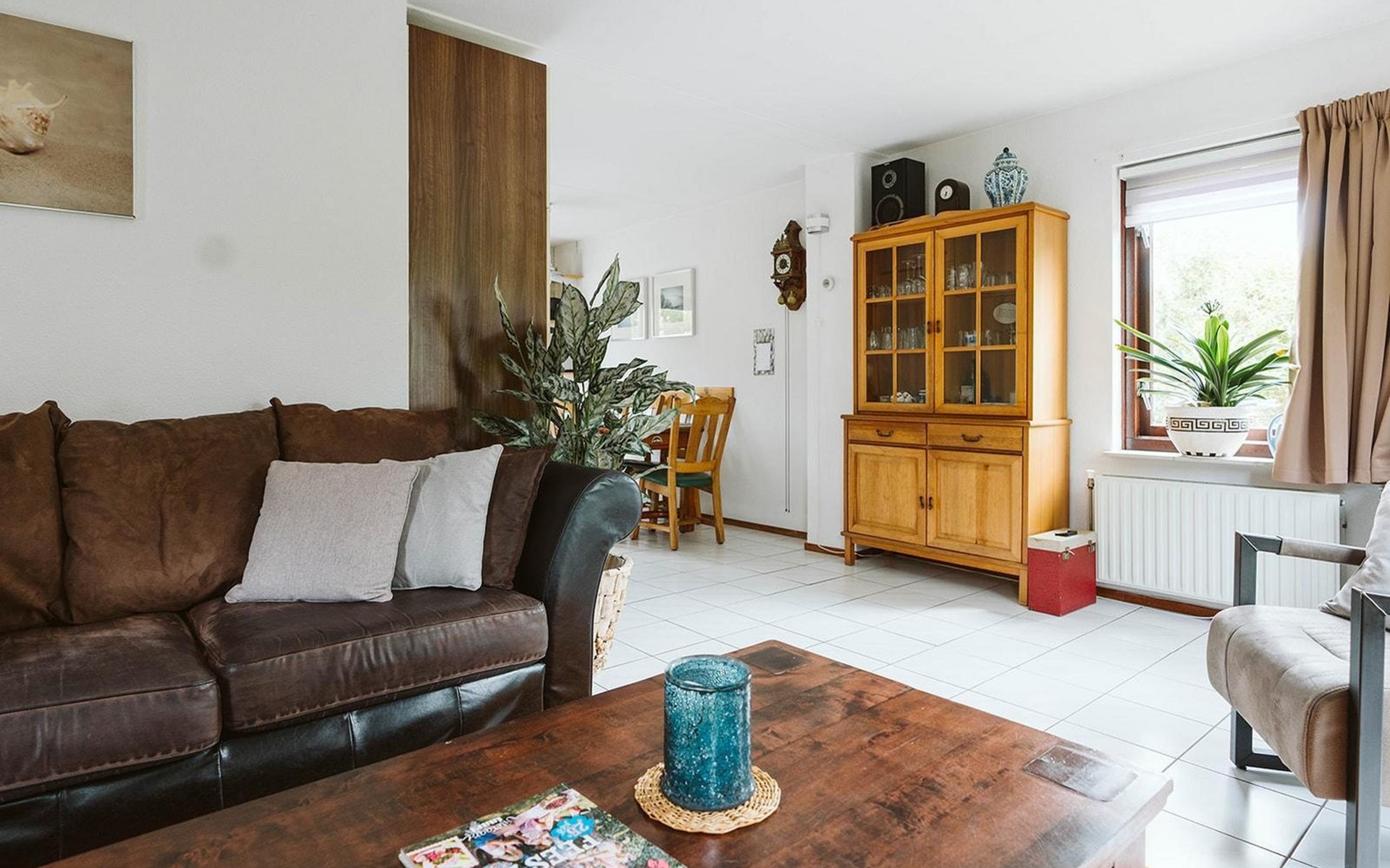 Vanuit de gang komt u in de badkamer met gelijkvloerse douche en wastafel en het aparte toilet met fonteintje. Een derde deur leidt naar de woon/eetkamer. Geniet van een maaltijd uit de volledig uitgeruste open keuken aan de rustieke eettafel. De woonkamer, ingericht met stijlvolle en deels nostalgische stoelen, heeft een gezellige uitstraling.