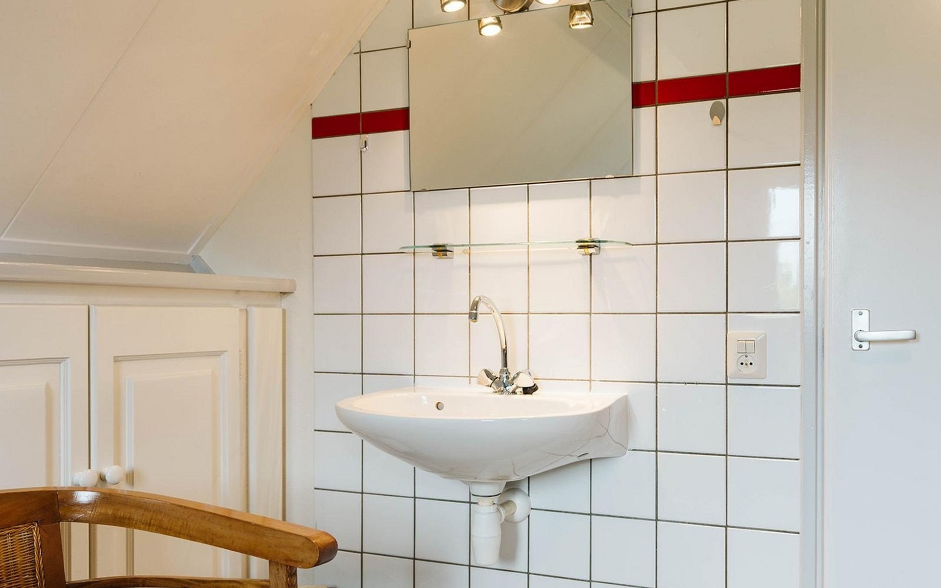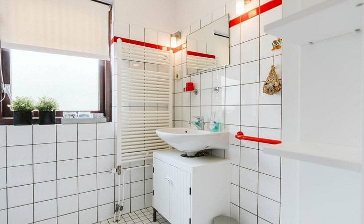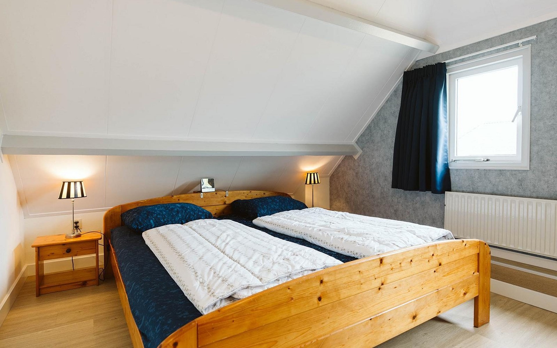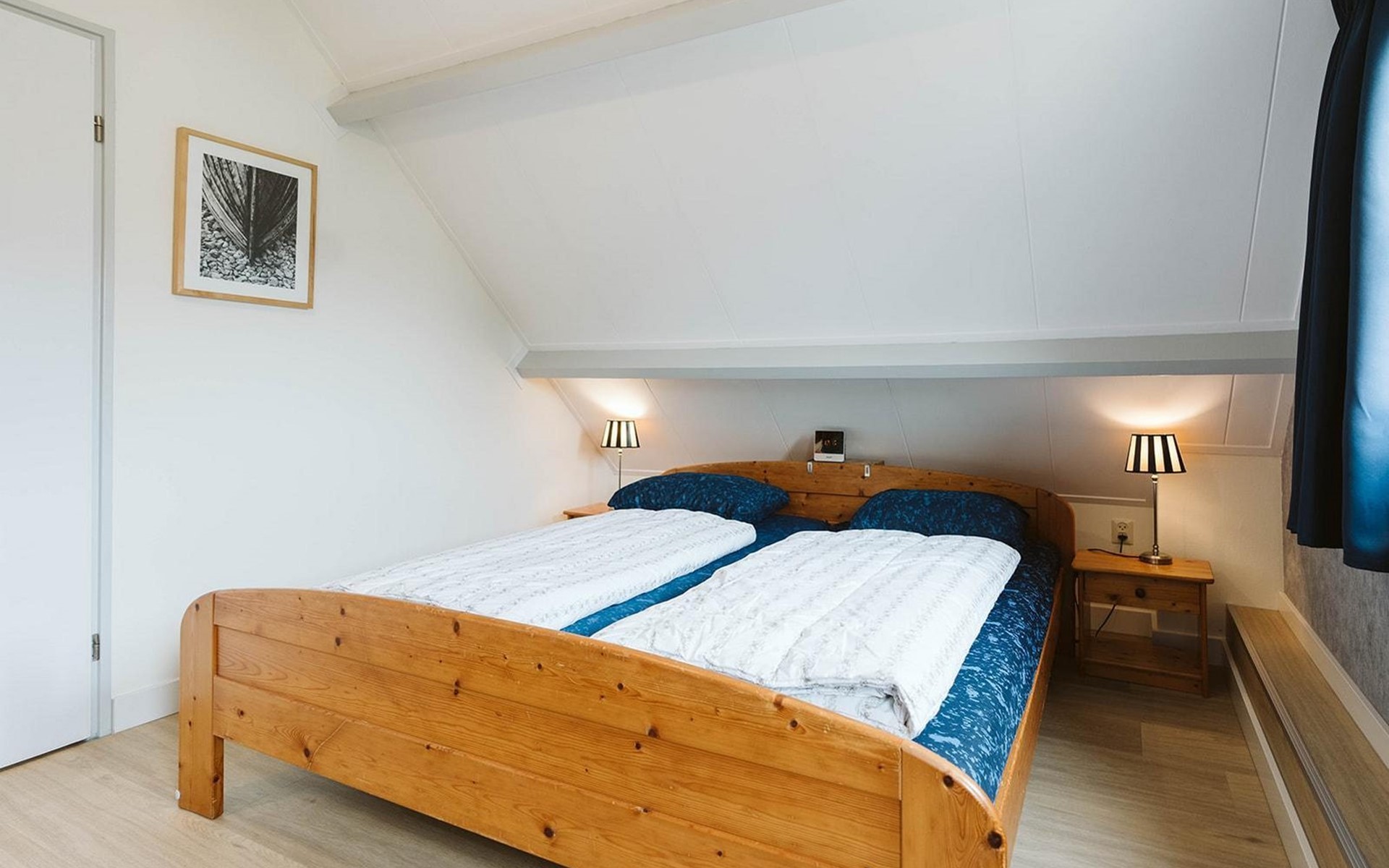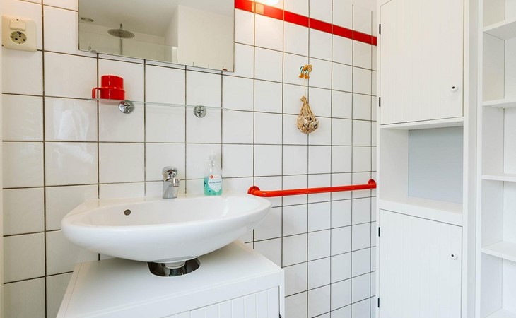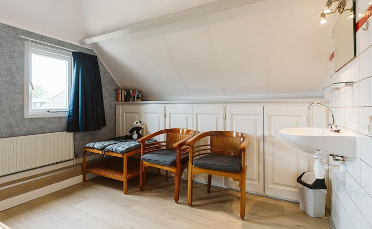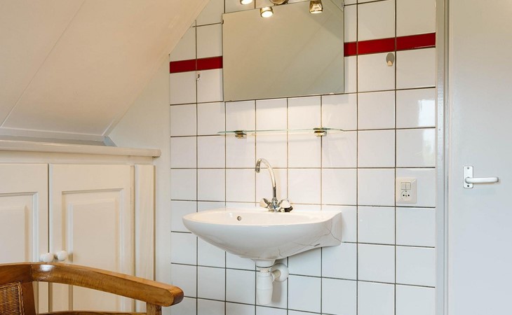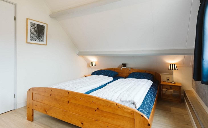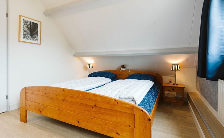 U vindt deze in een van de drie slaapkamers op de eerste verdieping. De grote slaapkamer biedt plaats aan een tweepersoonsbed van 180 x 200 cm en een wastafel en wandkast. De twee andere kamers hebben elk twee eenpersoonsbedden van 90 x 200 cm. Een apart toilet met een kleine wastafel completeert de inrichting.