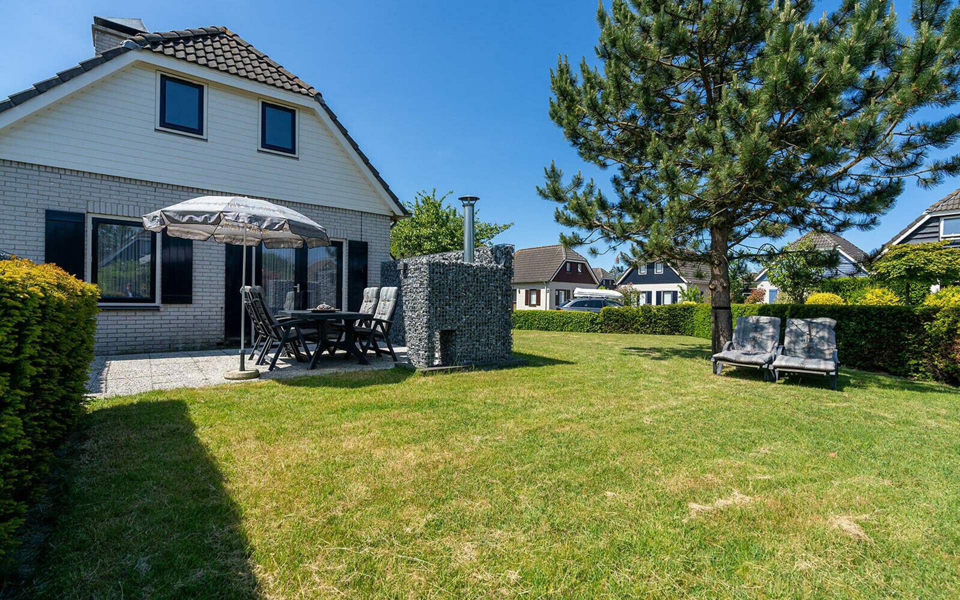 Deze nette ingerichte vakantiewoning bevindt zich op korte afstand van de stranden in het voorste gedeelte van het groene Noordzeepark. Er is een ruime omheinde tuin met diverse terrassen. Aan de voorkant van de woning is een terras met hier een tafel voor 4 tot 6 personen voorzien van stoelen met kussens en parasol en een mooie ingebouwde barbecue. Er zijn ook twee ligbedden beiden voorzien van kussens. Achter de woning is nog een heel privé gedeelte en hier ook een terras met tafel en diverse stoelen. Hier is ook de ingang naar de schuur.