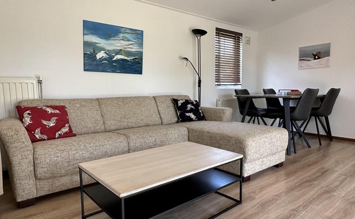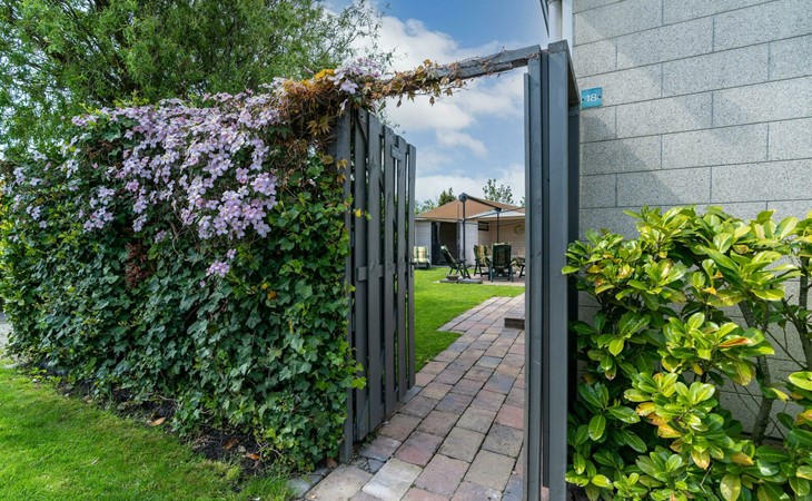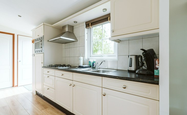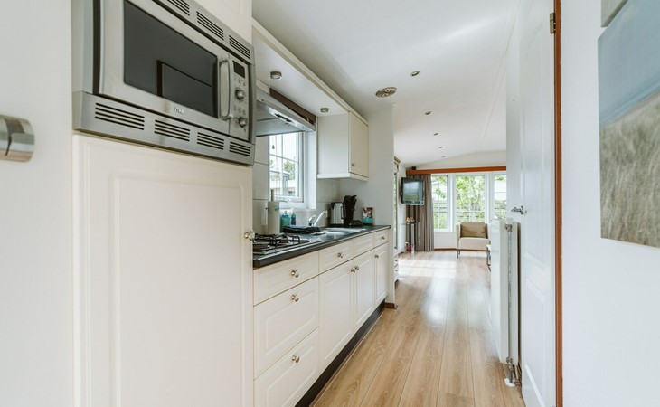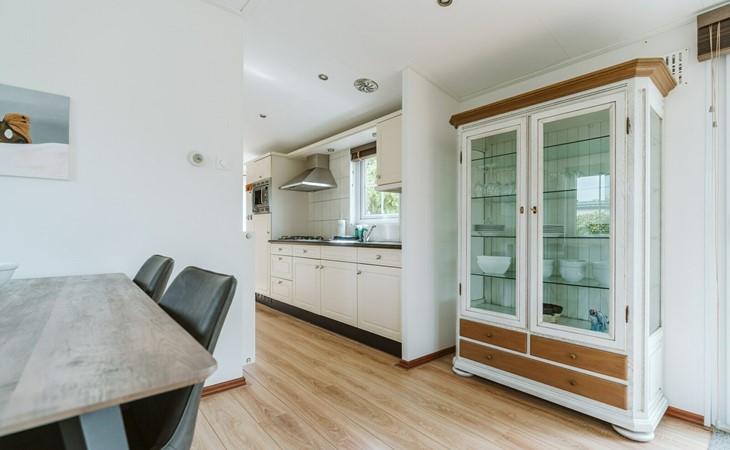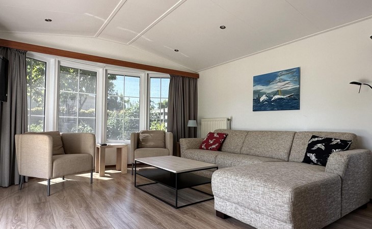 Dit smaakvol ingerichte chalet met heerlijk uitzicht op de grote tuin is voorzien van een laminaatvloer, een luxe bank en 2 comfortabele fauteuils en een mooie eethoek. Vanuit de lichte woonkamer kunt u via de schuifpui de grote tuin bereiken.