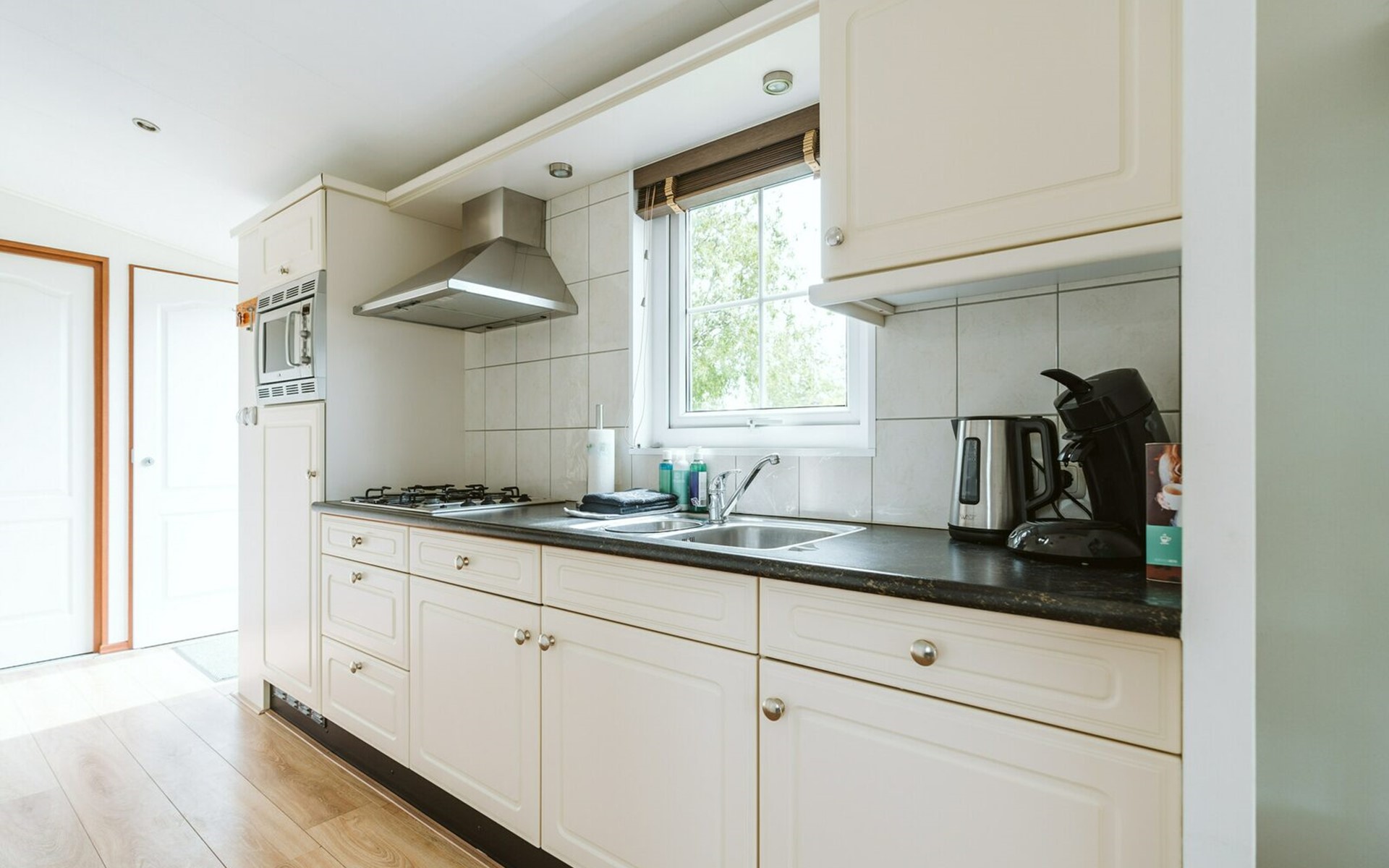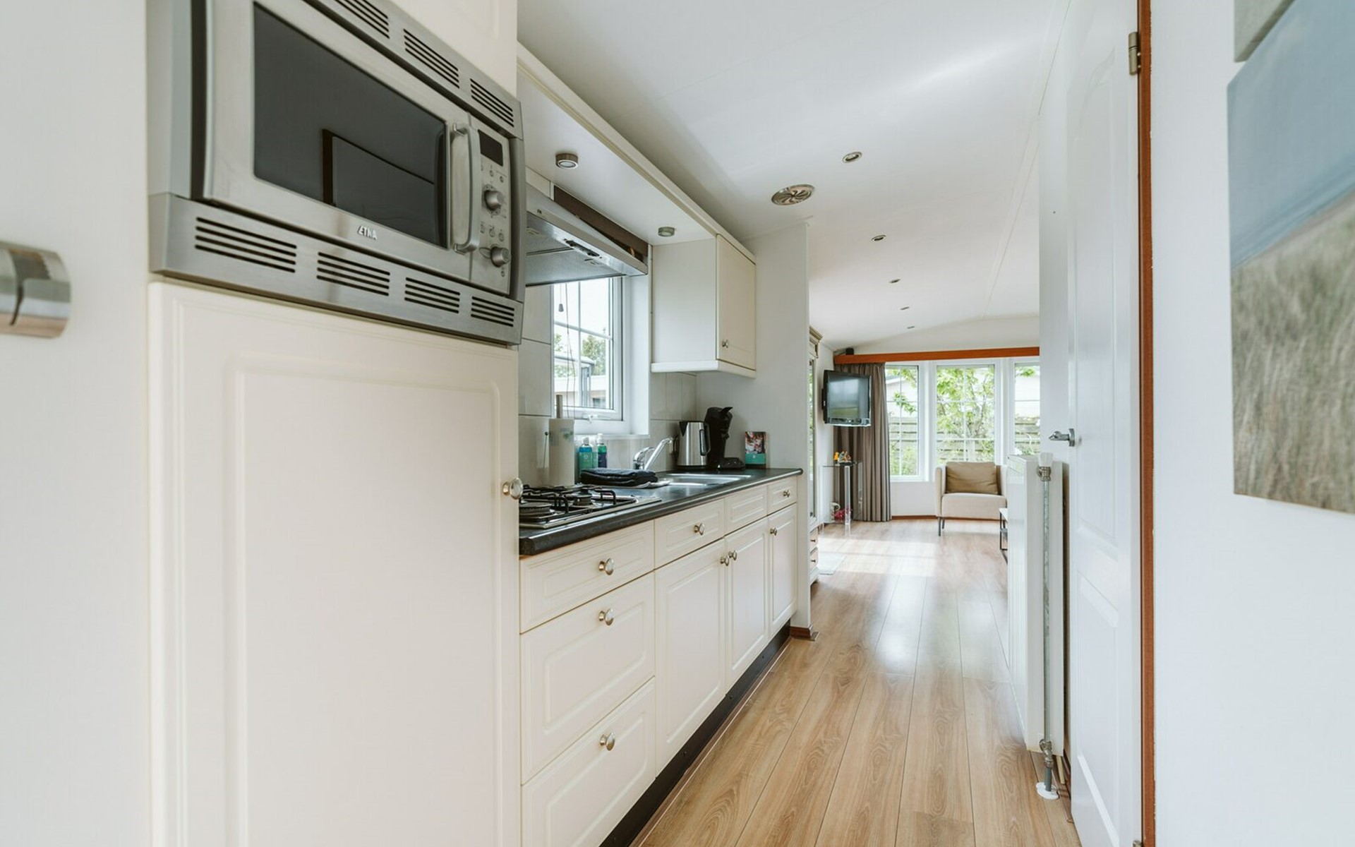 De aangrenzende open keuken is van alle gemakken voorzien om een heerlijke maaltijd te koken. Geen vaatwasser, maar samen weer gezellig afwassen.