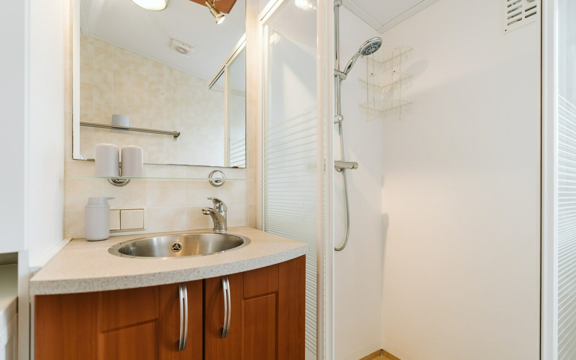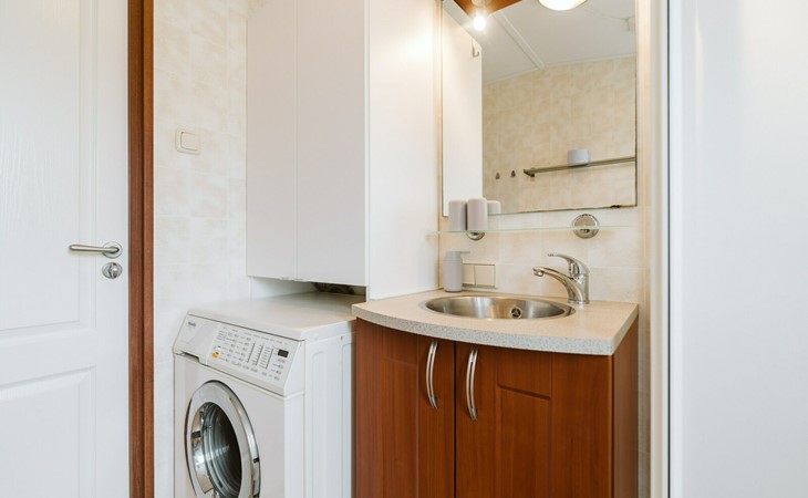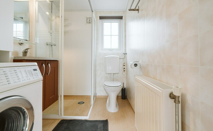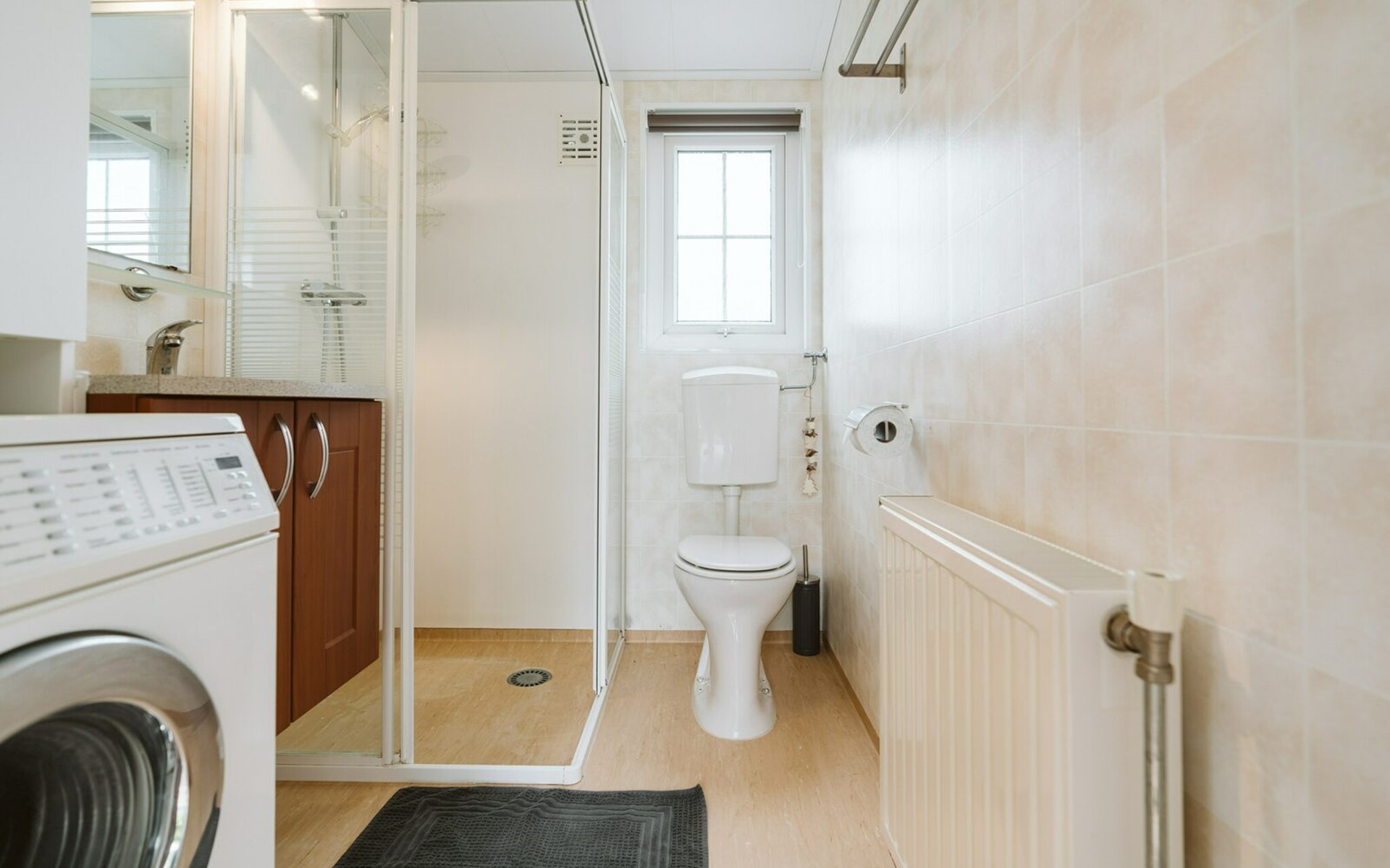 Er is een badkamer met douchecabine en wasmeubel, wasmachine en toilet.