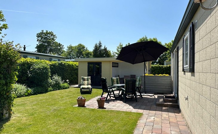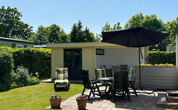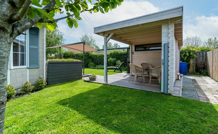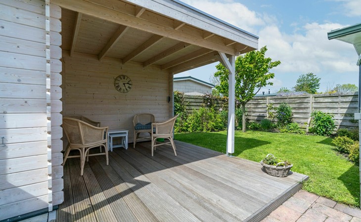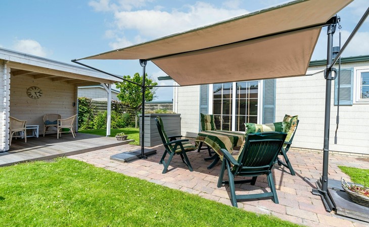 In de tuin staat een tuinhuis met overkapping. U kunt een gedeelte afsluiten voor de wind, door het windscherm uit te trekken.