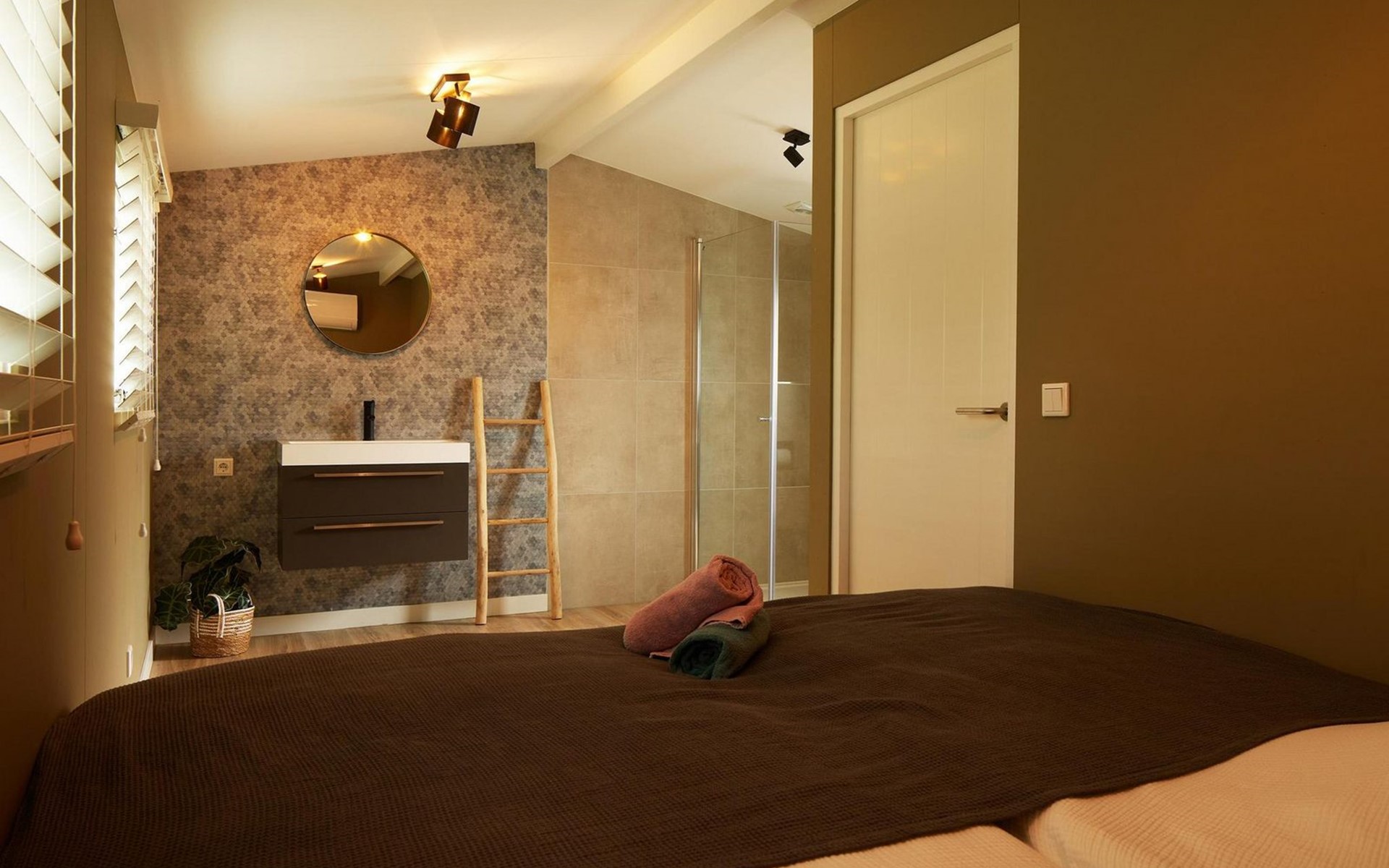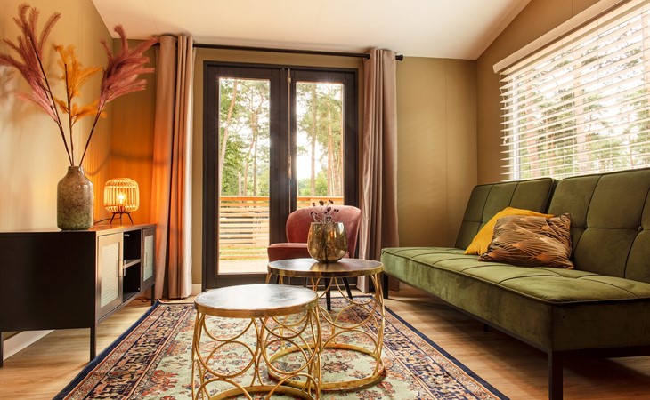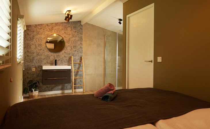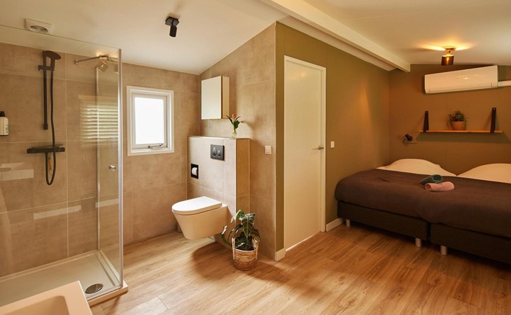 's Avonds schuif je gezellig aan de eettafel met bank en stoelen om nog een drankje te drinken. Afwassen doen we natuurlijk niet in de vakantie dus de keuken is voorzien van een vaatwasser. Verder kan natuurlijk een koelkast, inductiekookplaat, dolce gusto en waterkoker niet ontbreken. De echte keukenprinsen en prinsessen kunnen hier een heerlijke maaltijd koken. De lodge is voorzien van airco zodat je de hete zomeravonden doorkomt, maar dat kan natuurlijk ook op het heerlijke terras met loungestoelen. De badkamer is ensuite aan de slaapkamer.