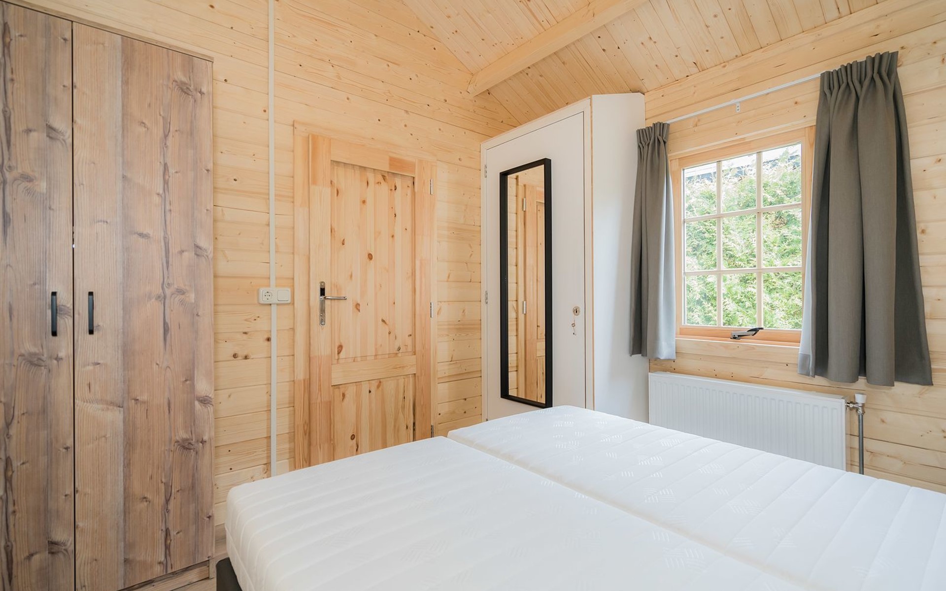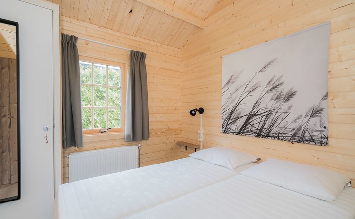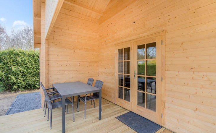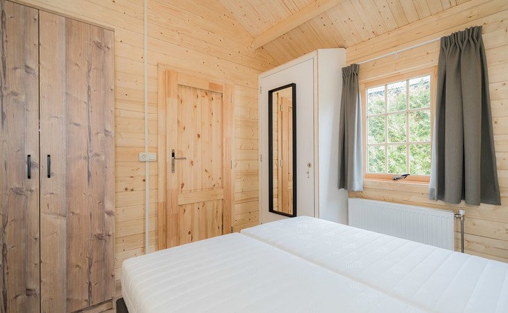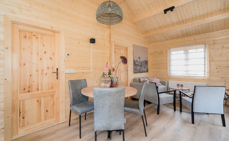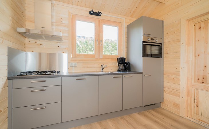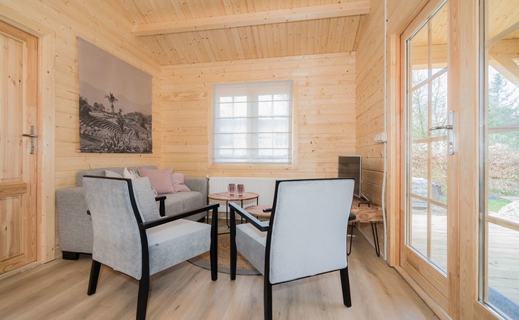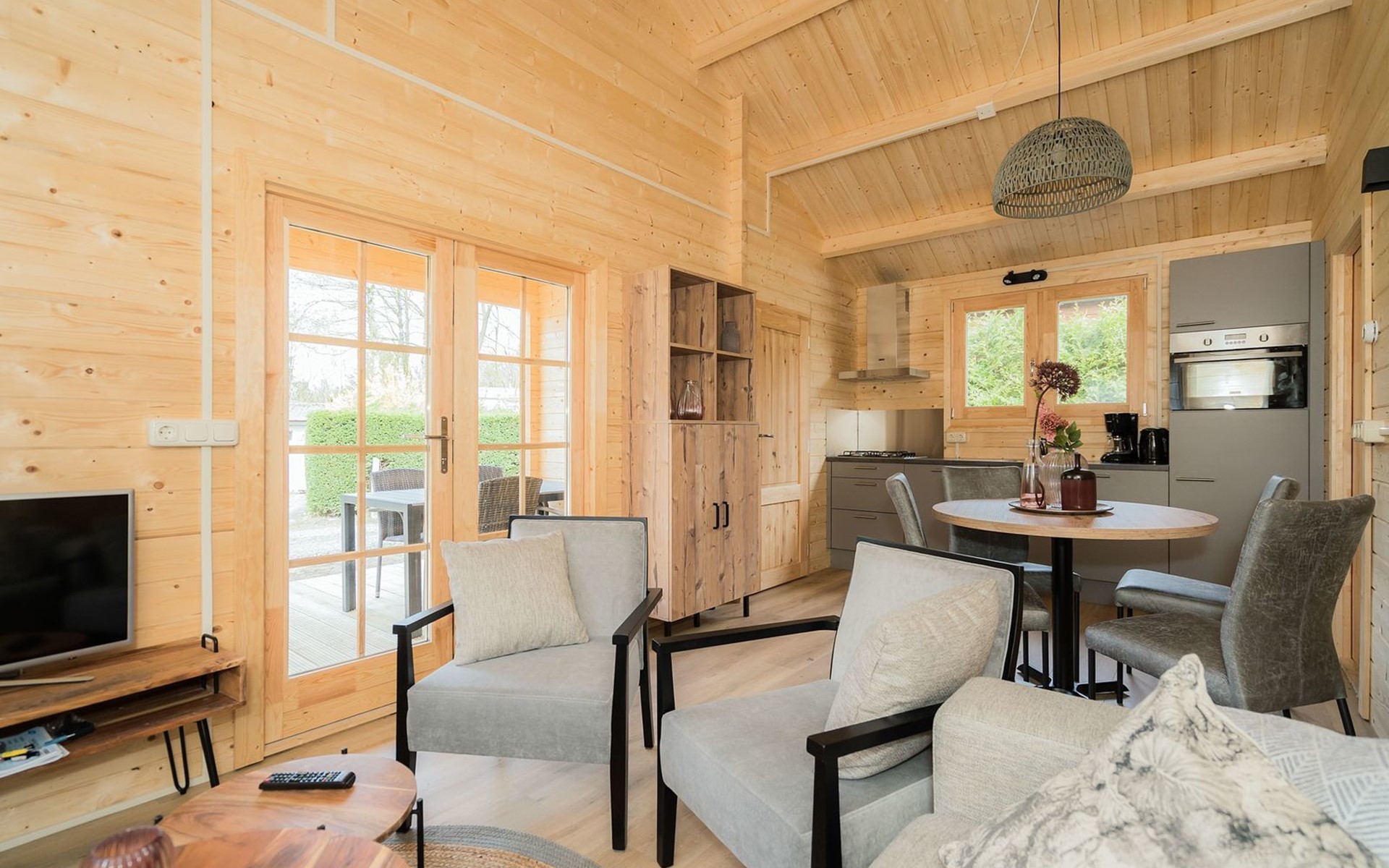 Huckle Berry Fin Lodge is een houten lodge met 2 slaapkamers, living en een complete keuken.