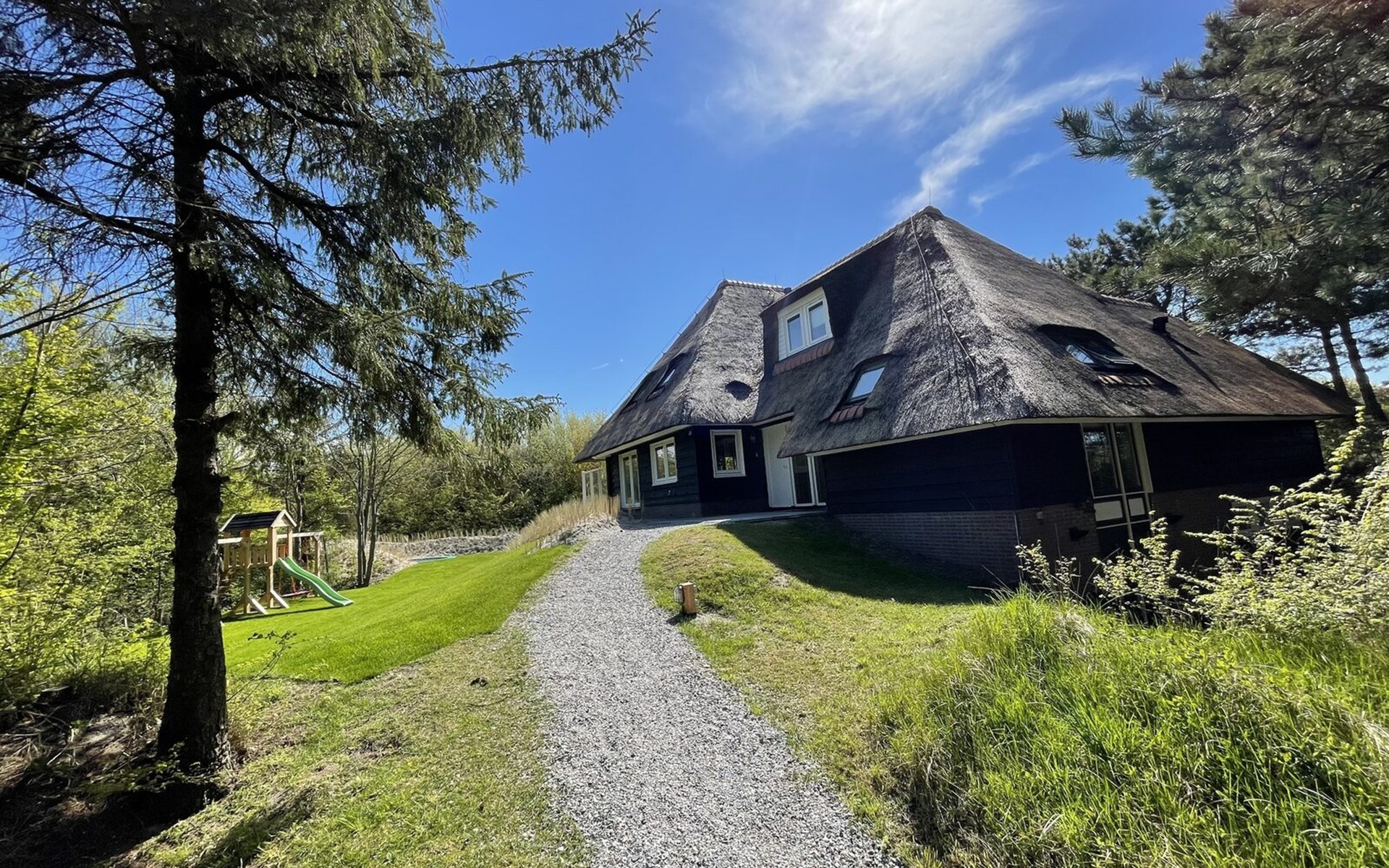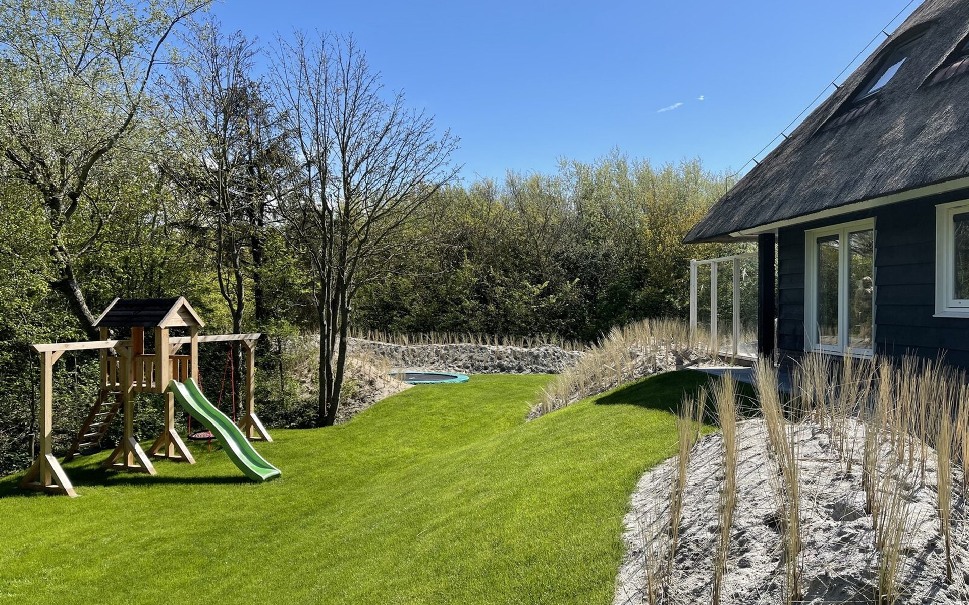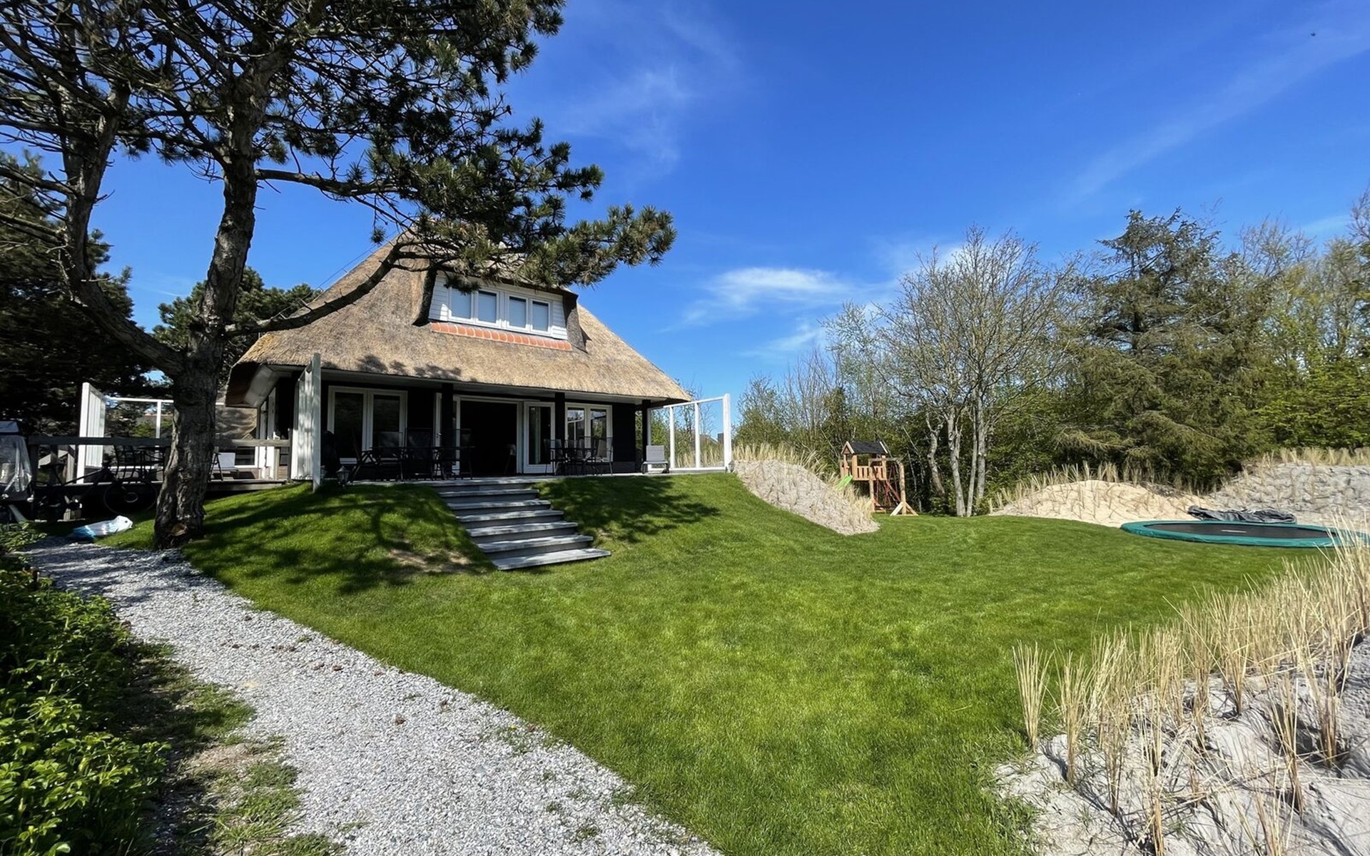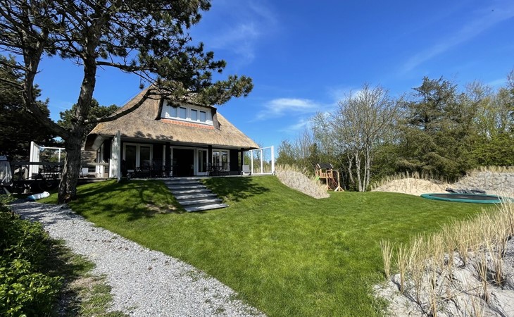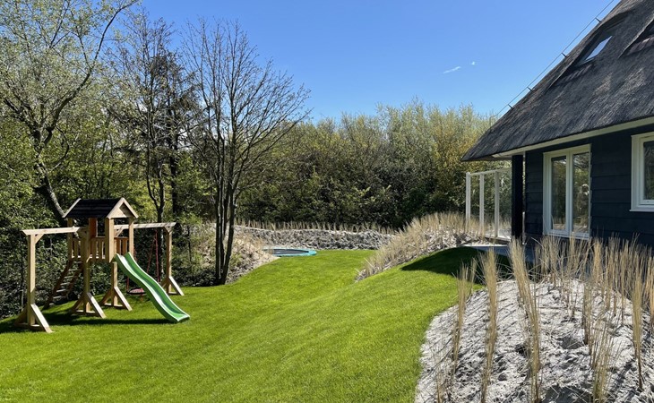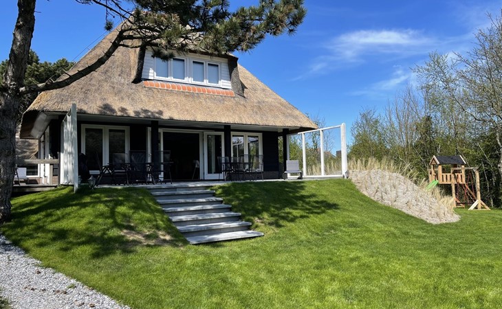 Direct toegankelijk vanuit de woonkamer bereik je de veranda met diverse zonnebedden, tuinmeubilair en een elektrische barbecue. Op het terrein rondom de villa vindt u een beschutte duinvallei waar u heerlijk en met privacy kunt zonnen. Aan de kinderen is ook gedacht, er is een trampoline en speeltoestel met schommels en glijbaan!