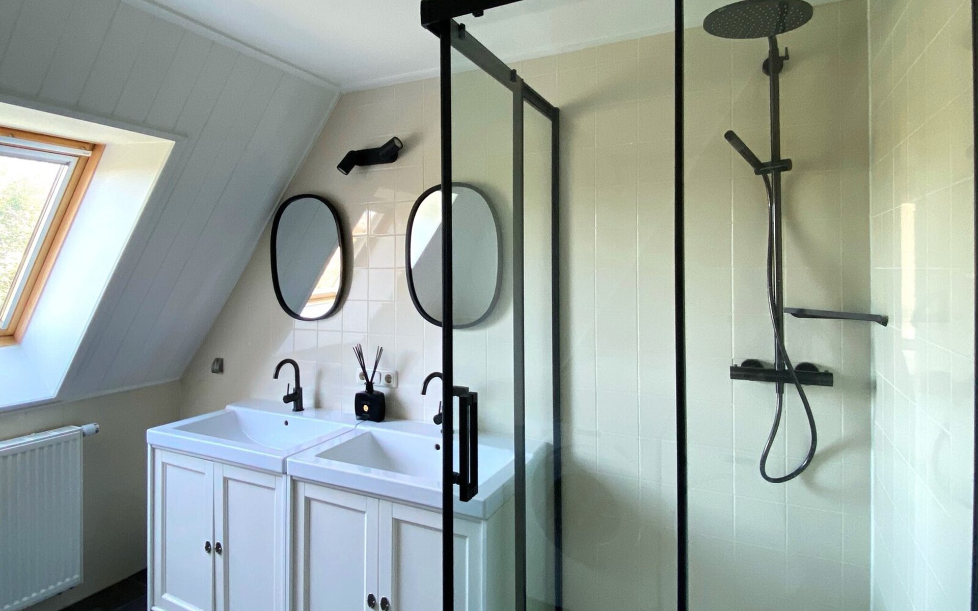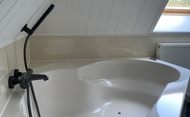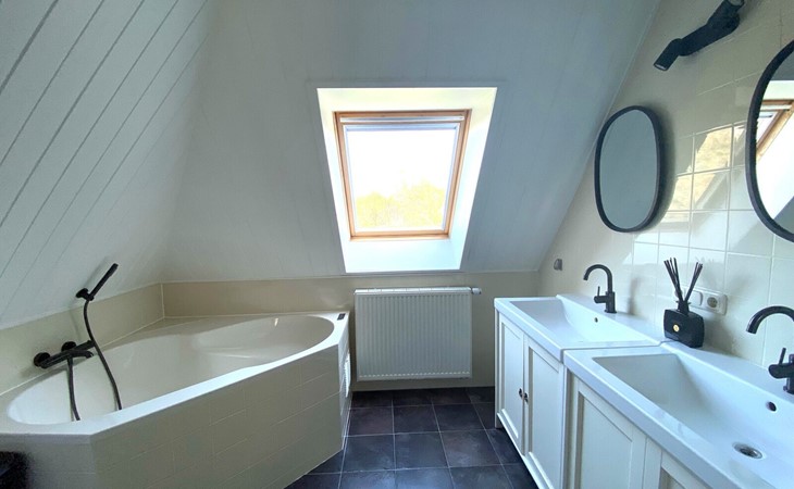 Op de eerste verdieping is een grote badkamer met ligbad (whirlpool), aparte douche, dubbele wastafel, wasmachine en droger. Tevens bevindt zich op deze verdieping een separaat toilet.