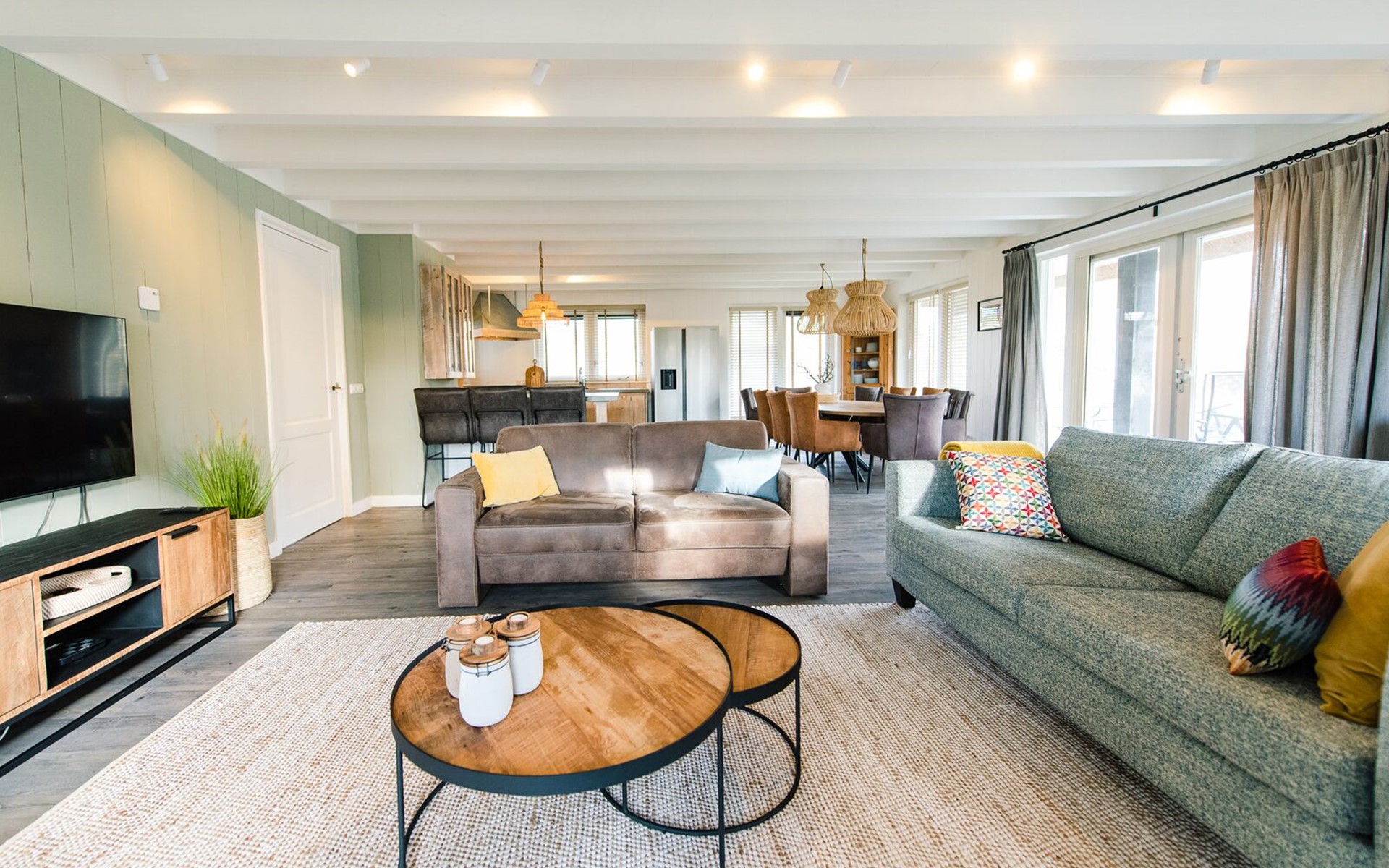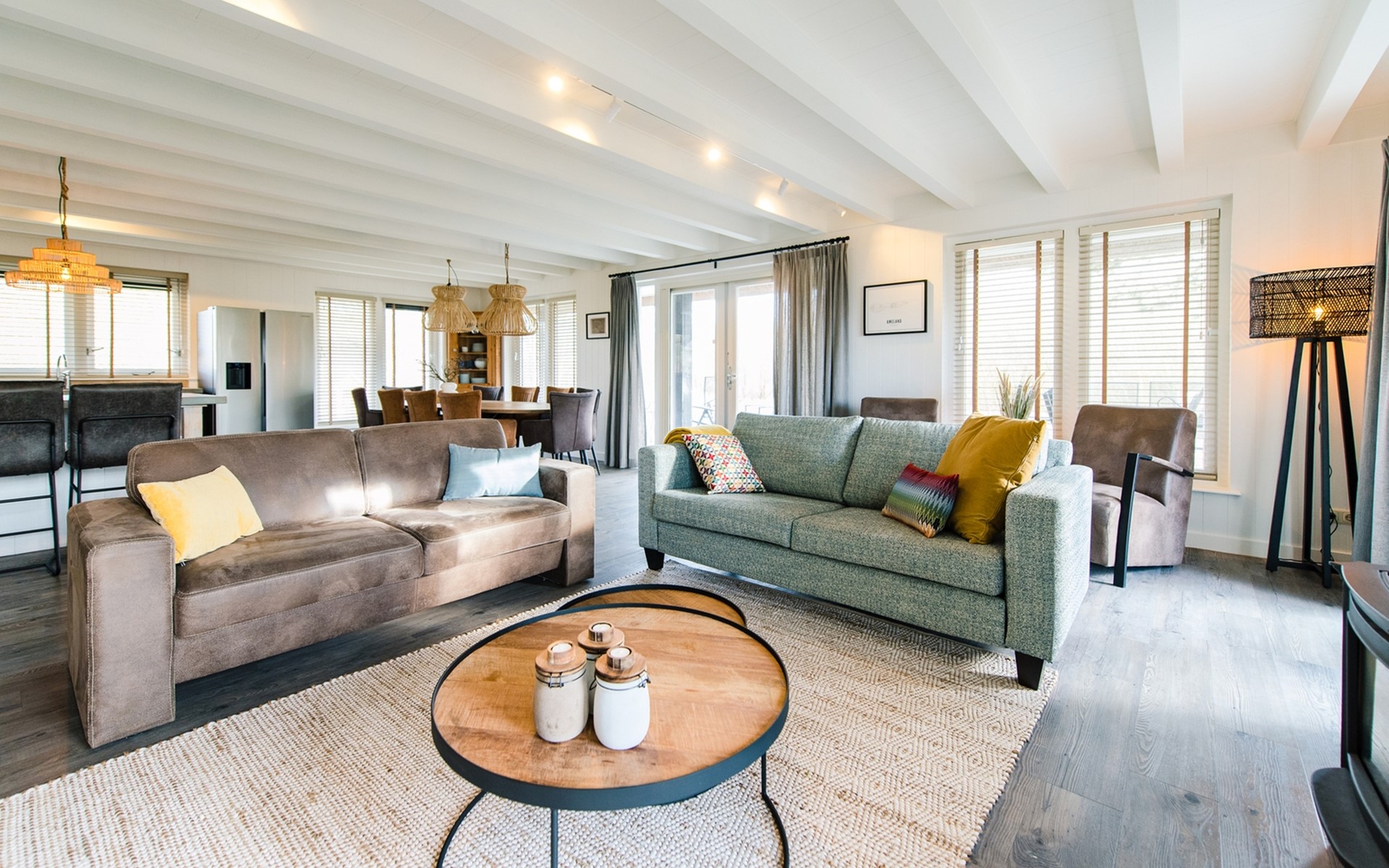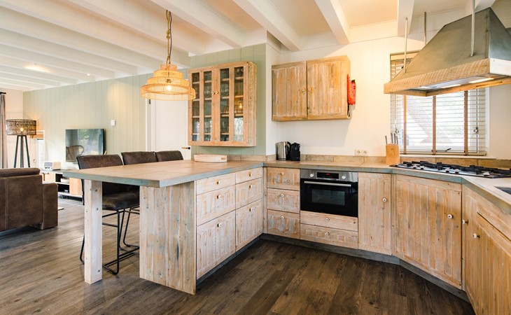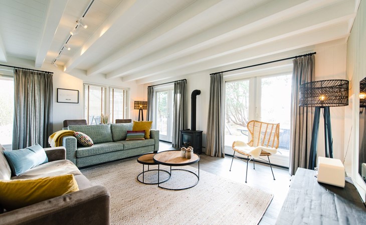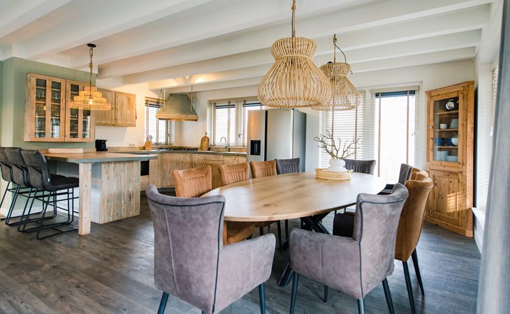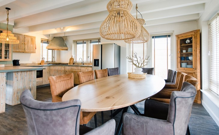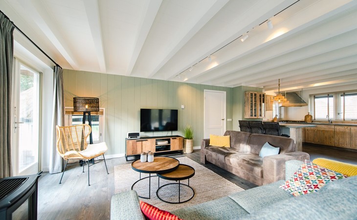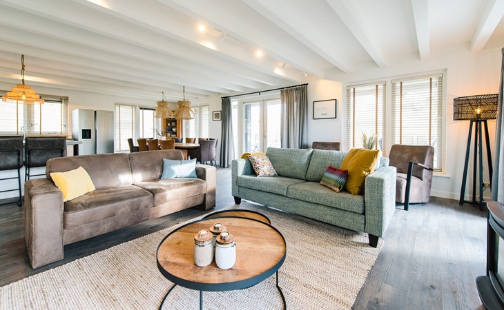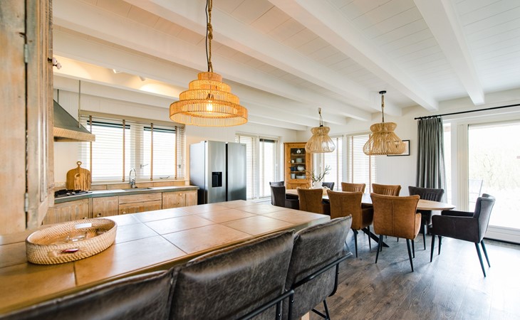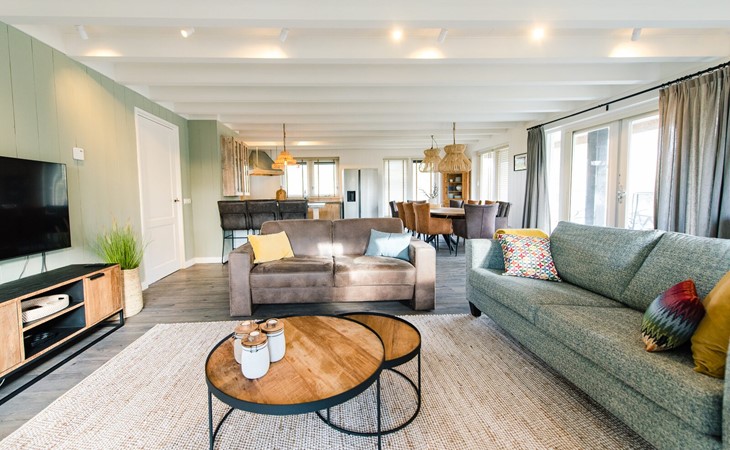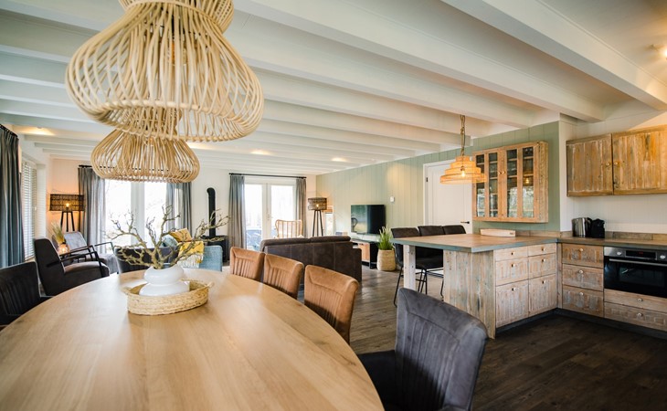 Royale living met gaskachel, flatscreen smart tv (met o.a. Netflix) en ruime zithoek. De open keuken is volledig ingericht met onder andere een Nespresso apparaat, vaatwasser, Amerikaanse koelkast met vriesgedeelte en ijsblokjesmachine, 6-pits gasfornuis en combi-oven. In de eethoek staat een 10-persoons eettafel. De openslaande deuren geven toegang tot het terras. De begane grond is voorzien van vloerverwarming. Hal met garderobe en separaat toilet.