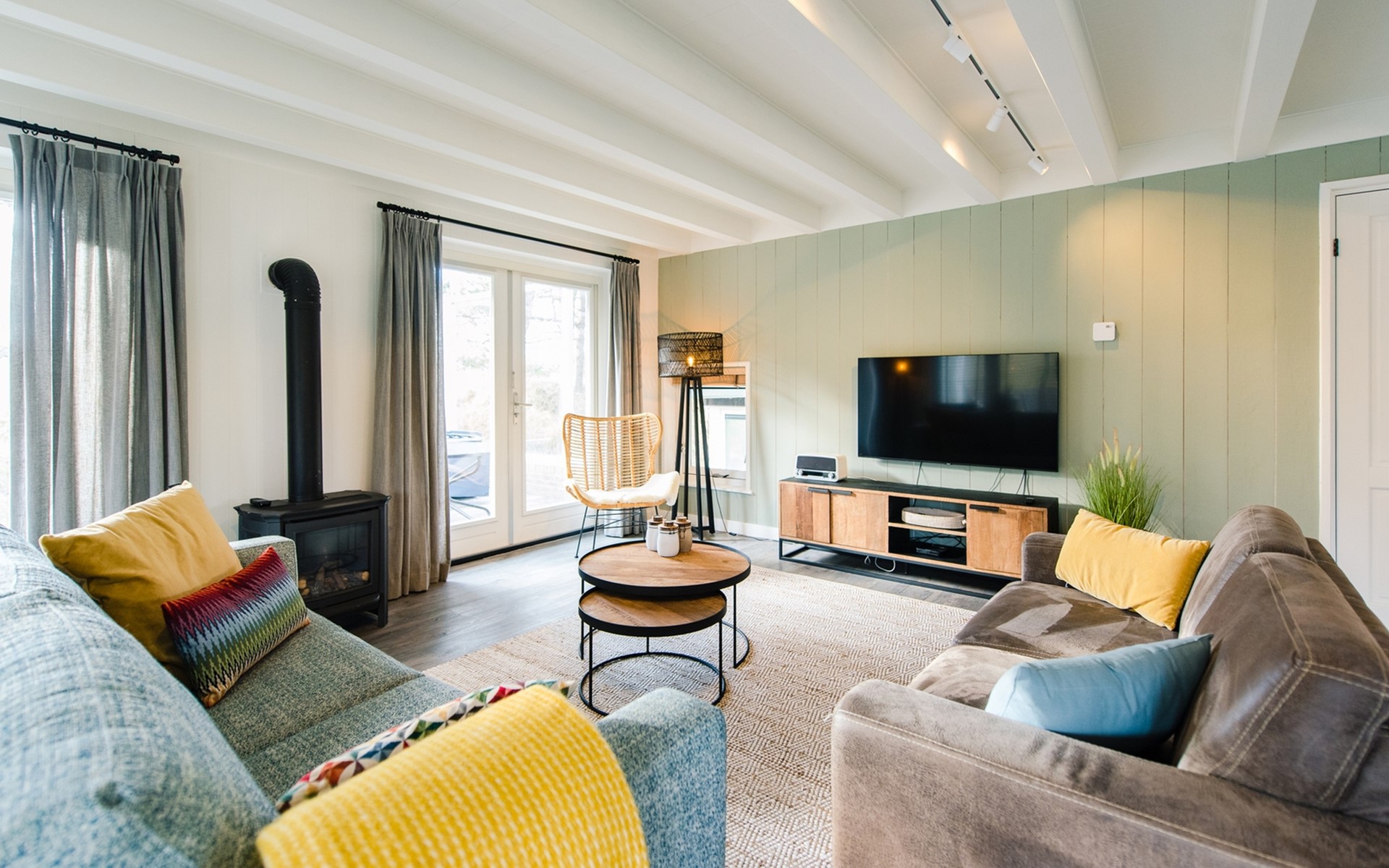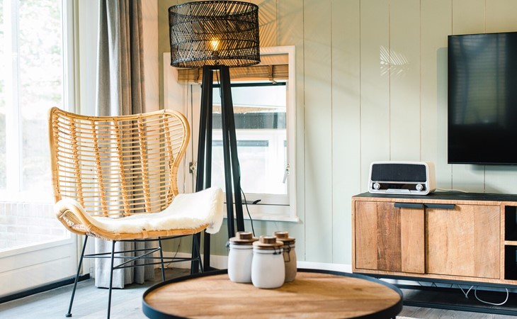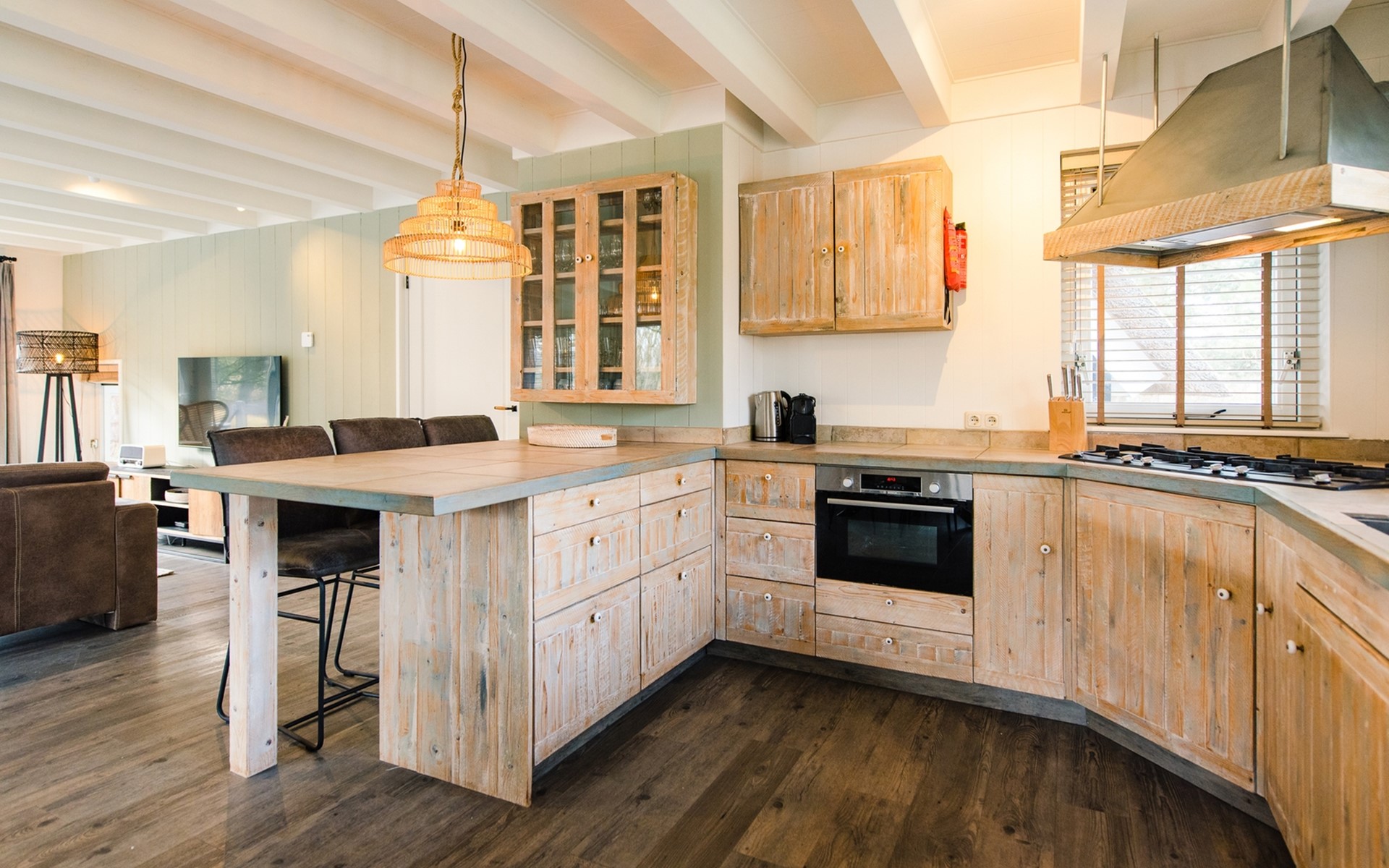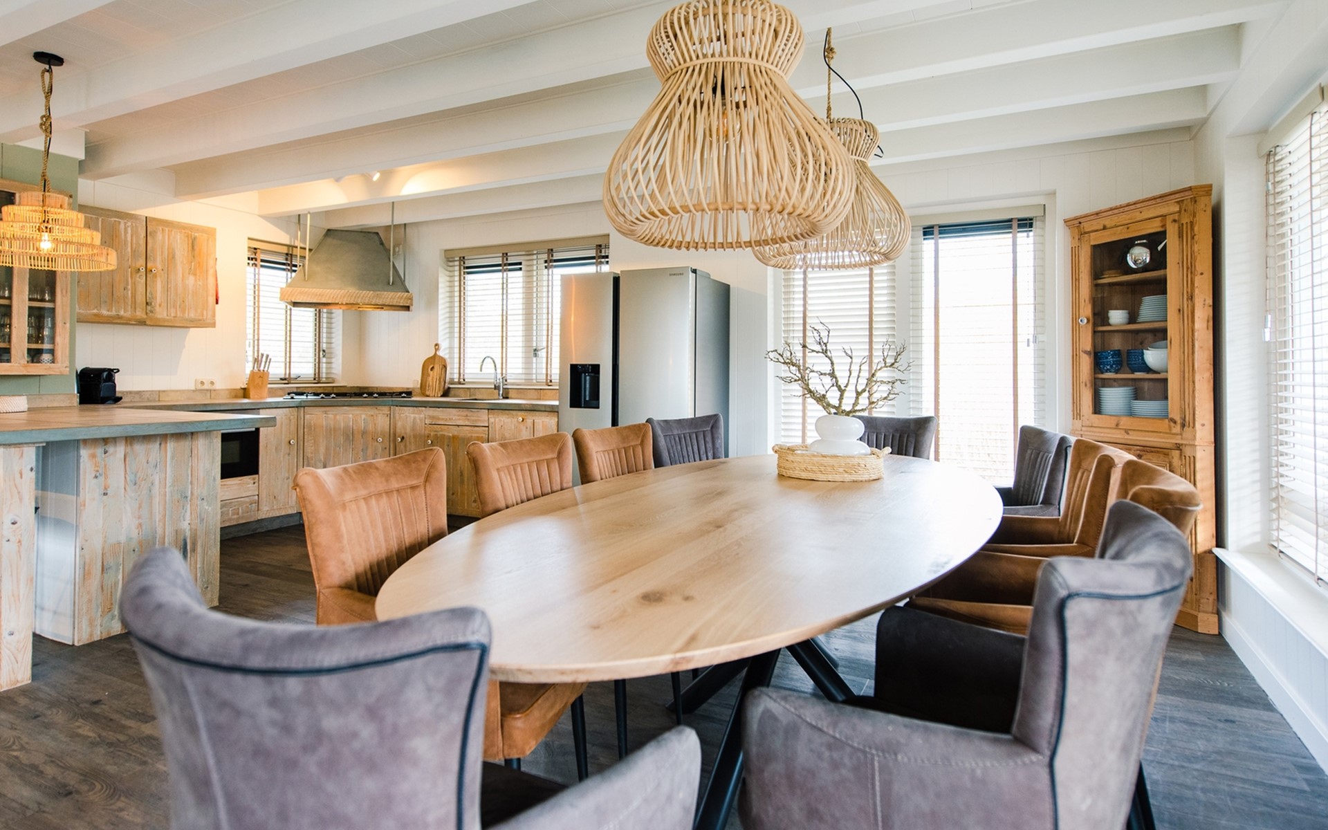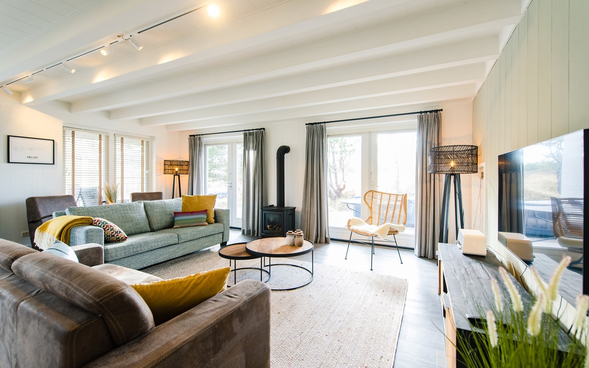 Royale living met gaskachel, flatscreen smart tv (met o.a. Netflix) en ruime zithoek. De open keuken is volledig ingericht met onder andere een Nespresso apparaat, vaatwasser, Amerikaanse koelkast met vriesgedeelte en ijsblokjesmachine, 6-pits gasfornuis en combi-oven. In de eethoek staat een 10-persoons eettafel. De openslaande deuren geven toegang tot het terras. De begane grond is voorzien van vloerverwarming. Hal met garderobe en separaat toilet.
