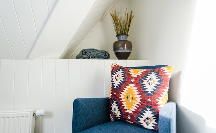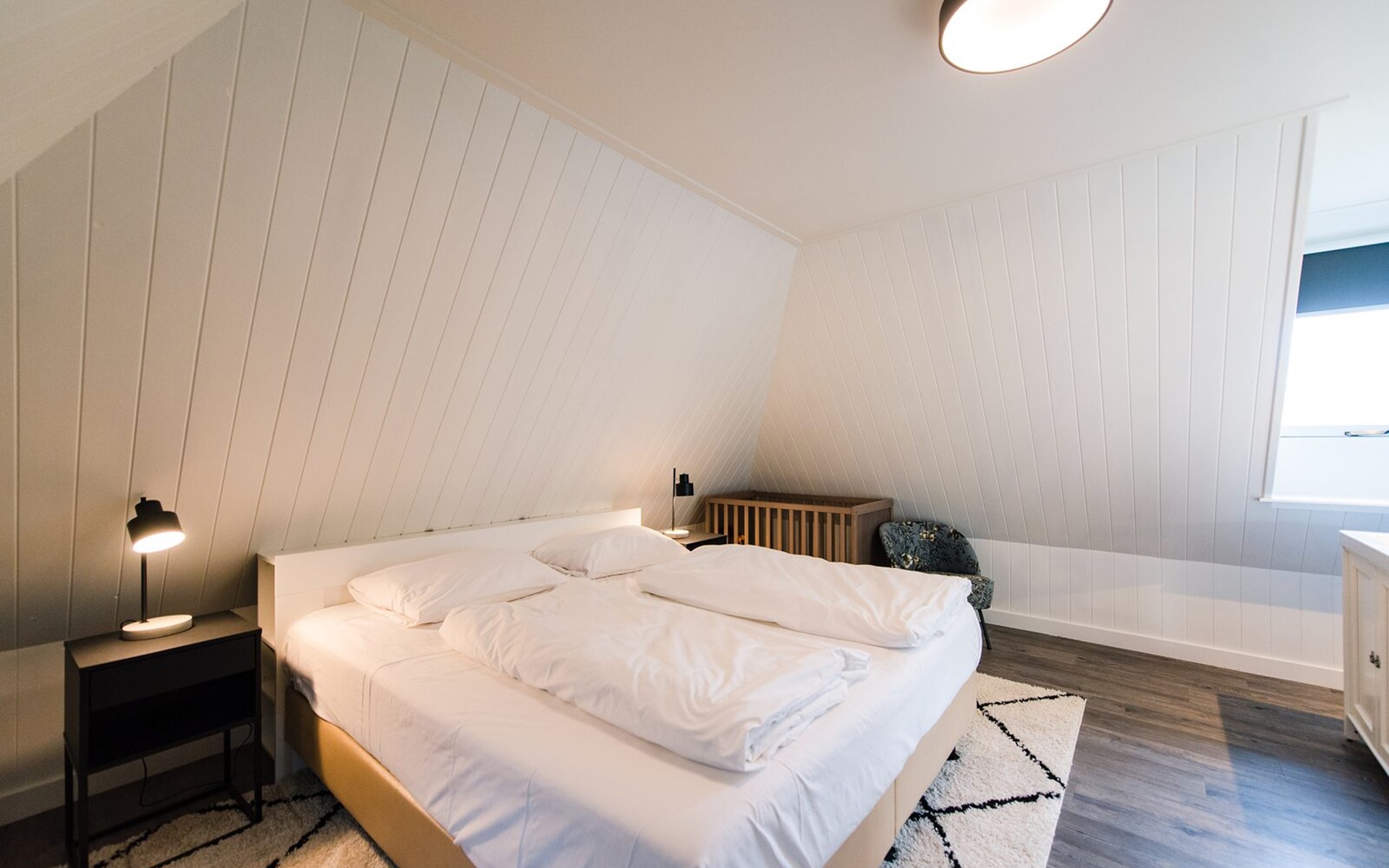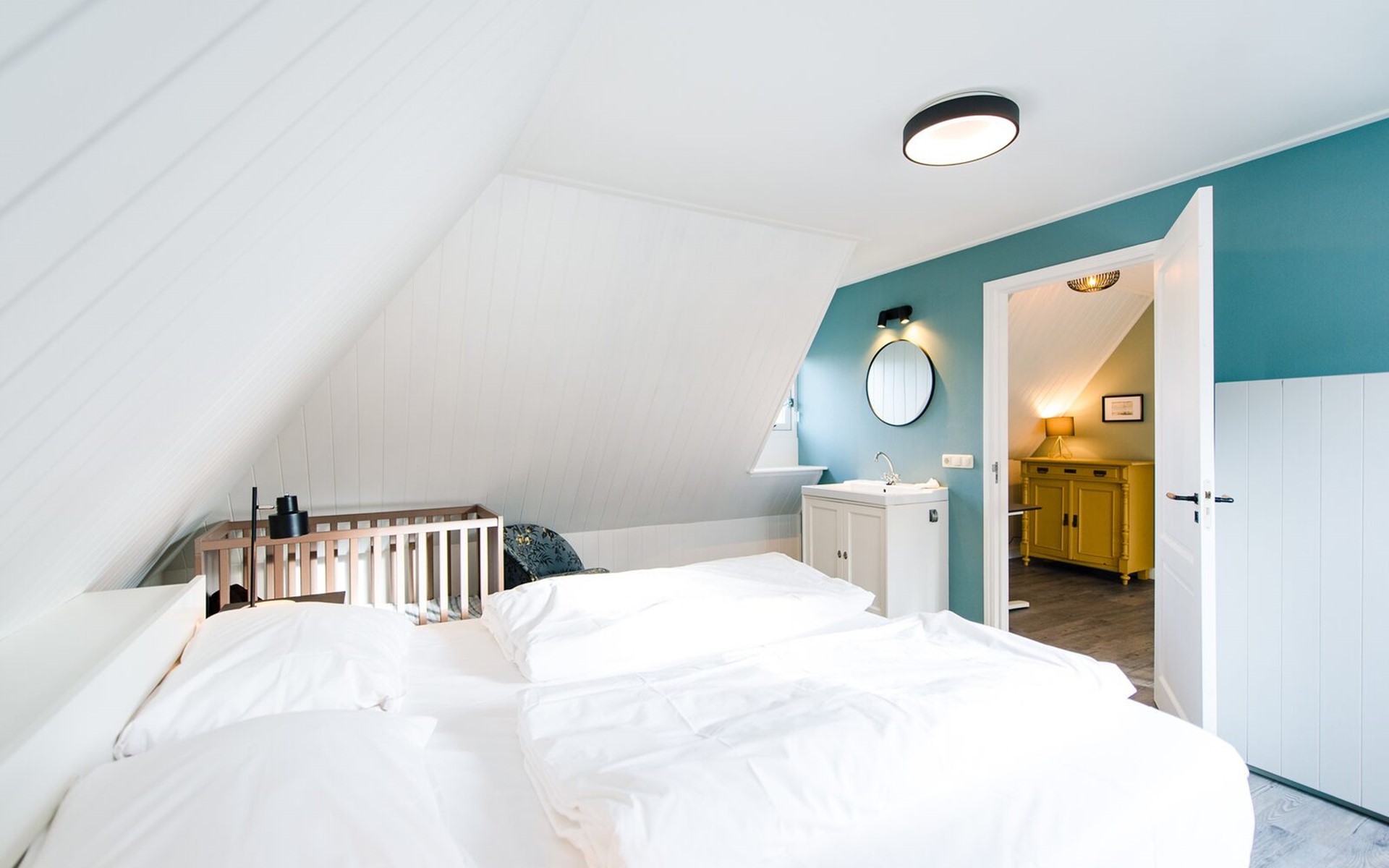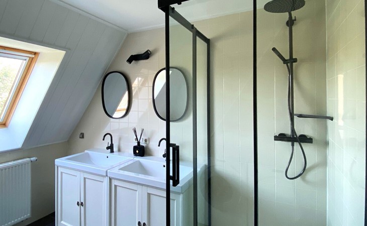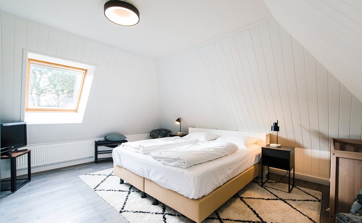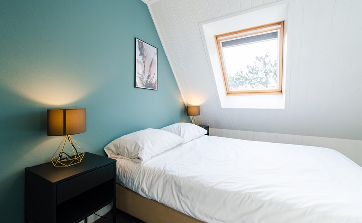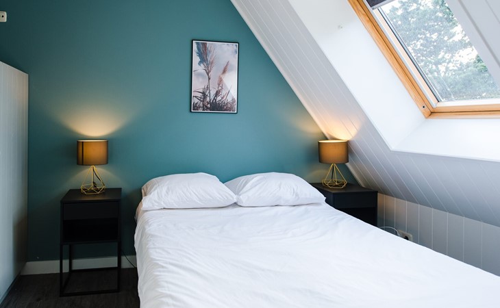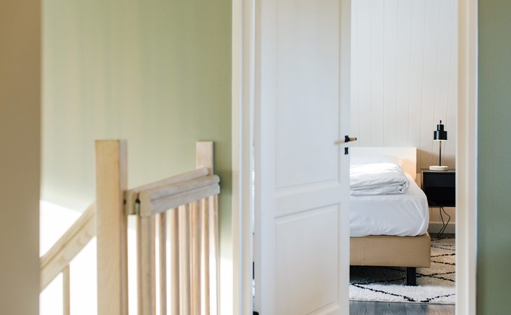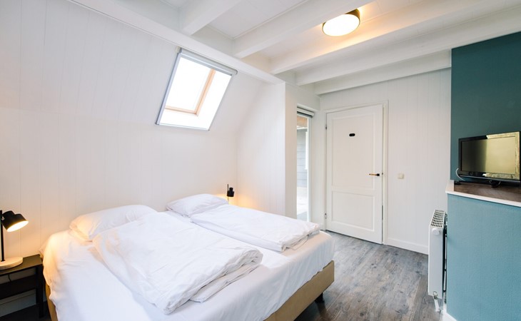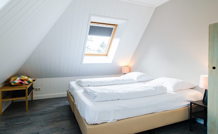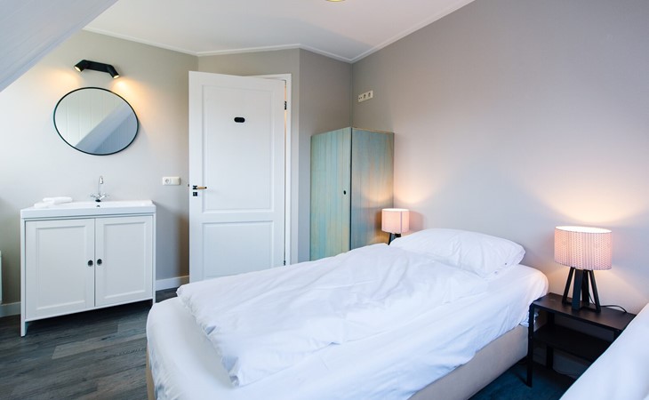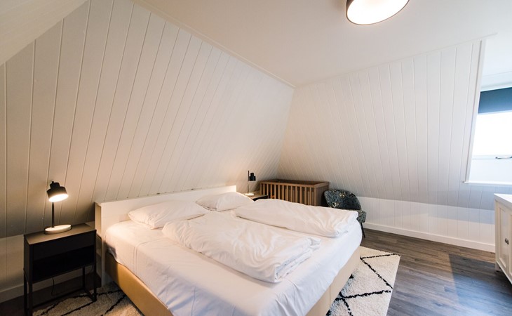Op de eerste verdiepingen zijn 4 slaapkamers. Twee met een tweepersoons boxspring (180cm) en eigen wastafel, één slaapkamer met twee enkele bedden (90cm, mogelijkheid om aan elkaar te schuiven) en wastafel en één slaapkamer met een tweepersoons boxspring (140cm).