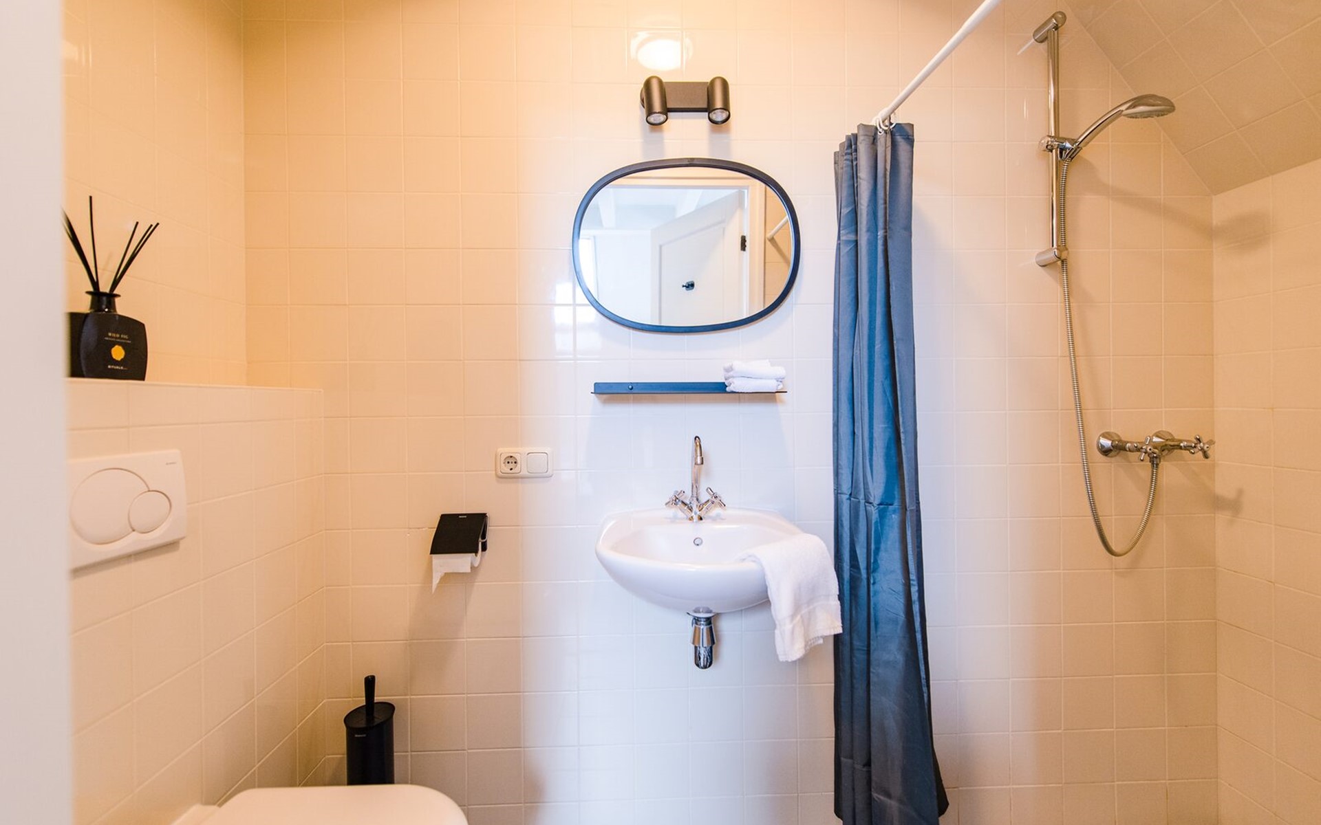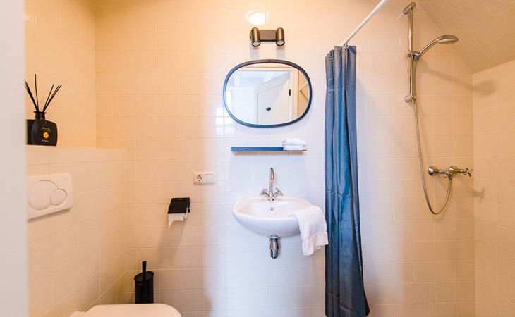 Op de begane grond bevindt zich een slaapkamer met een tweepersoons boxspring (180cm) en eigen badkamer met inloopdouche, wastafel en toilet.