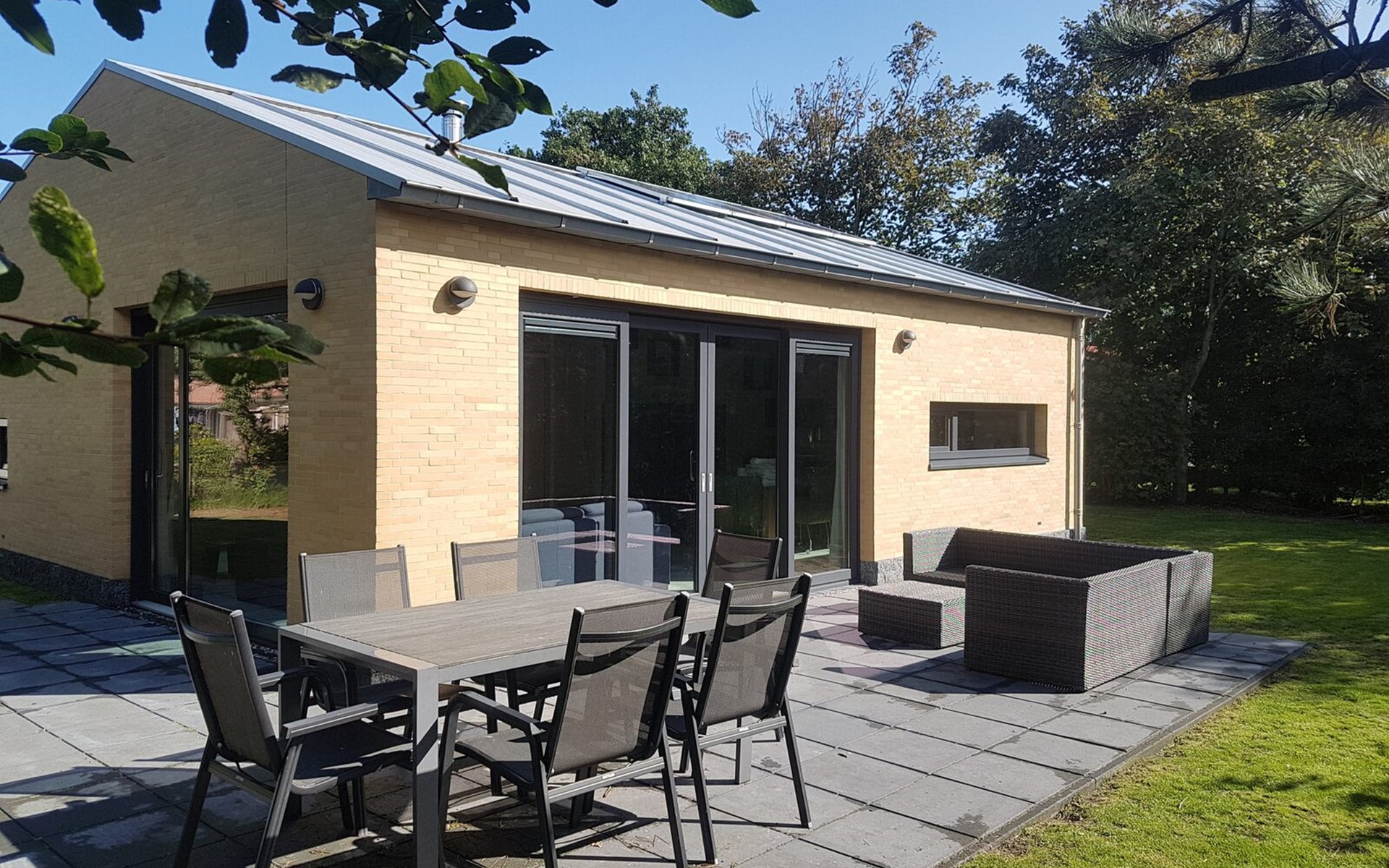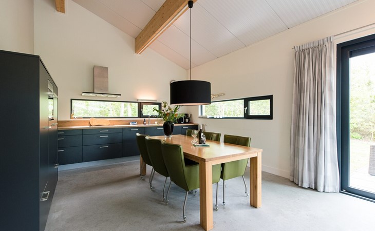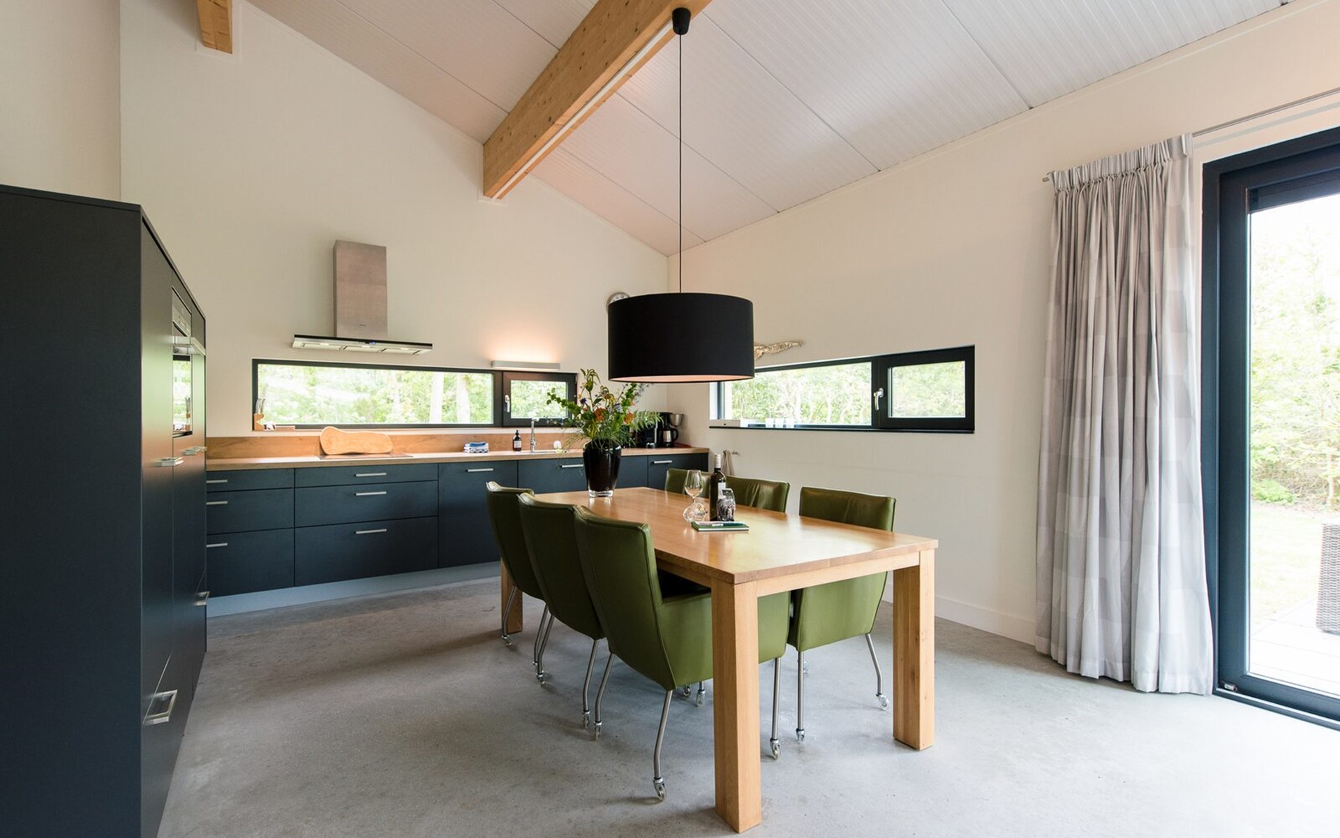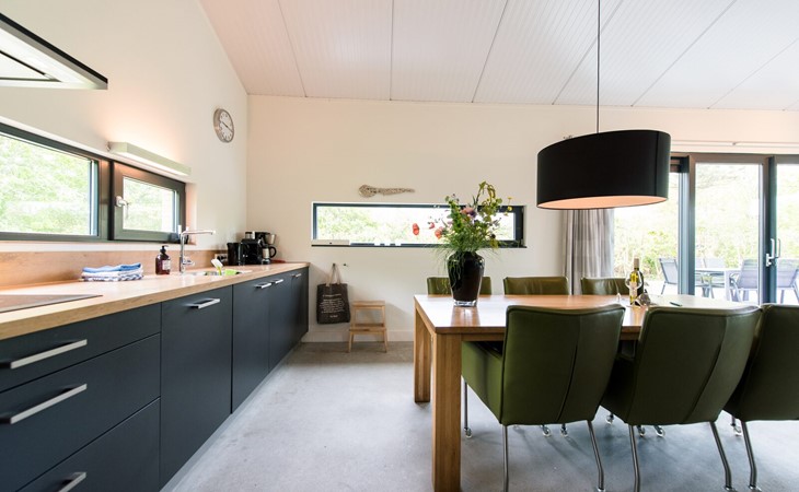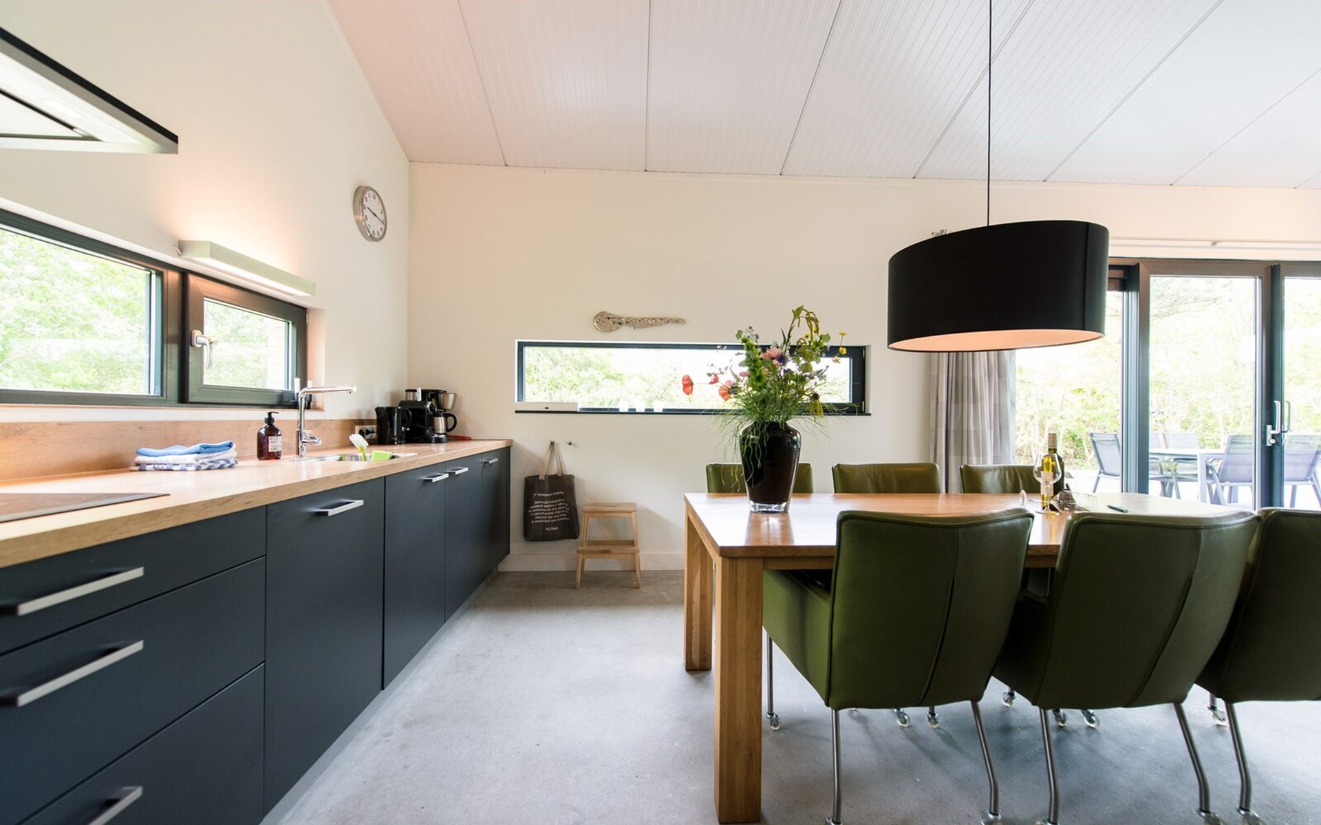 Woonkamer met zithoek, flatscreen en houtkachel. Open keuken met grote eettafel, comfortabele stoelen, vaatwasser en combi-oven. Via de schuifdeur kom je bij het terras op het zuiden met loungebank en tafel met stoelen.