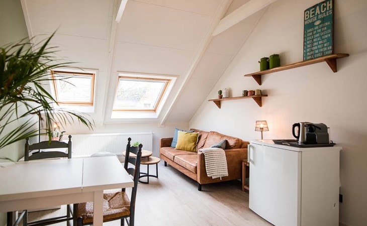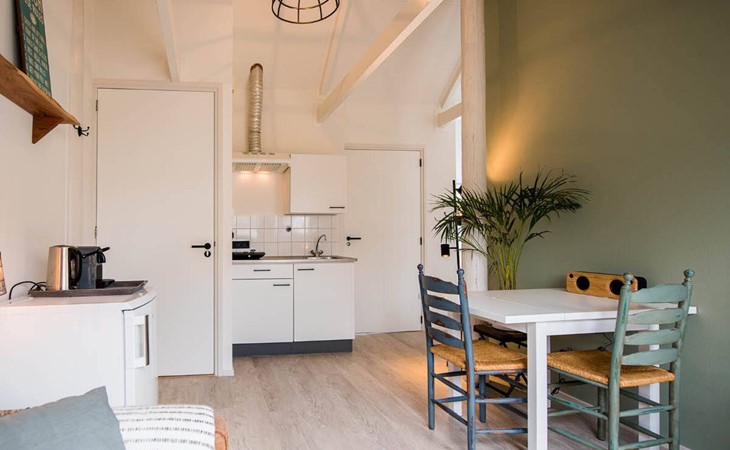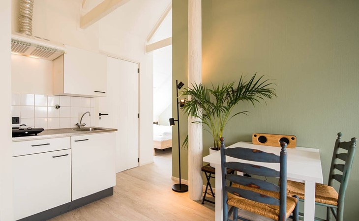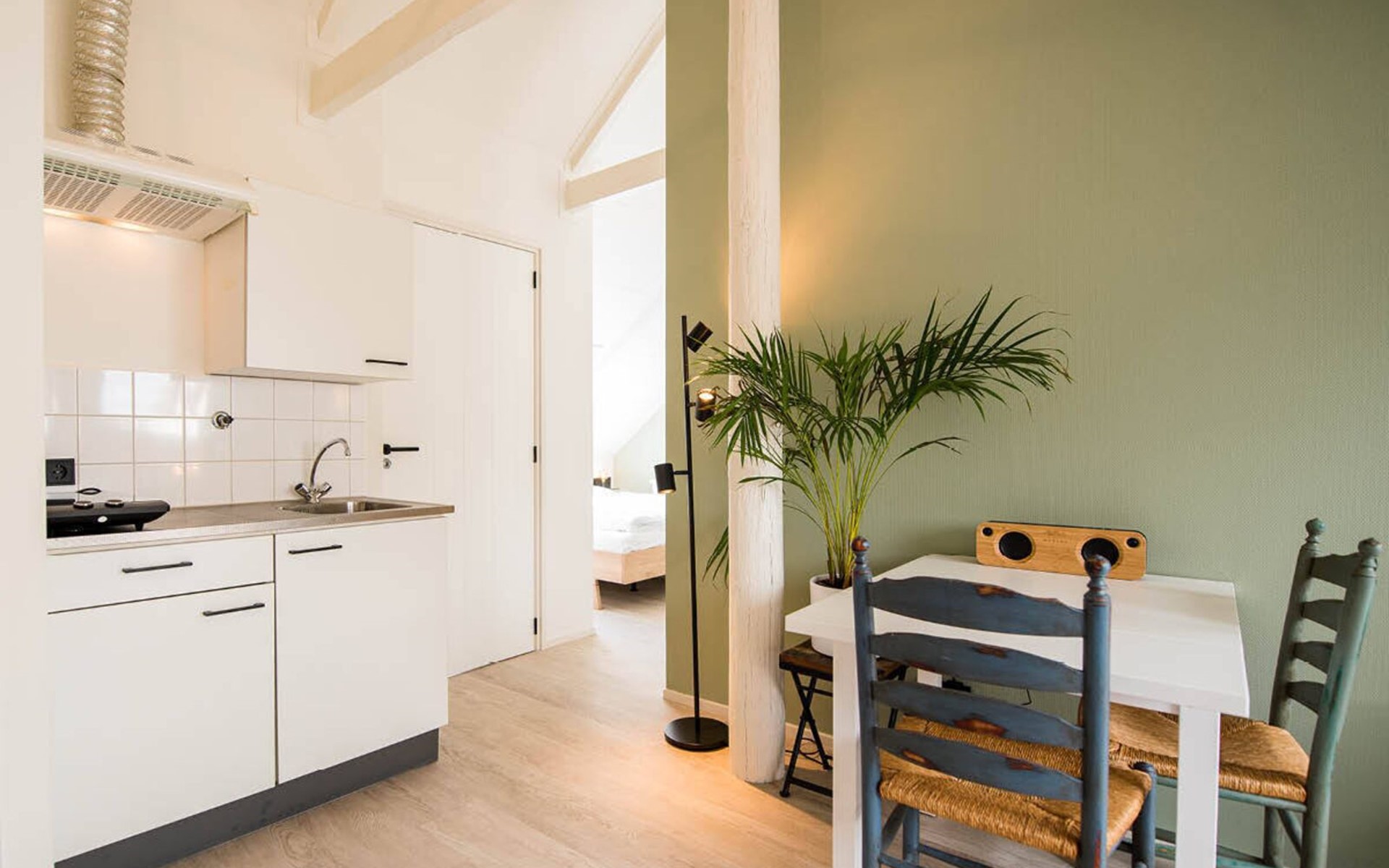 Studio 18 is een compacte studio (circa 30 m2) waar je aan niks ontbreekt! Een fijne ruimte met eettafel, flatscreen televisie, muziek speaker, kleine kitchenette met 2-pits kookplaat, koelkast (met vriesvak), Nespresso apparaat en waterkoker.