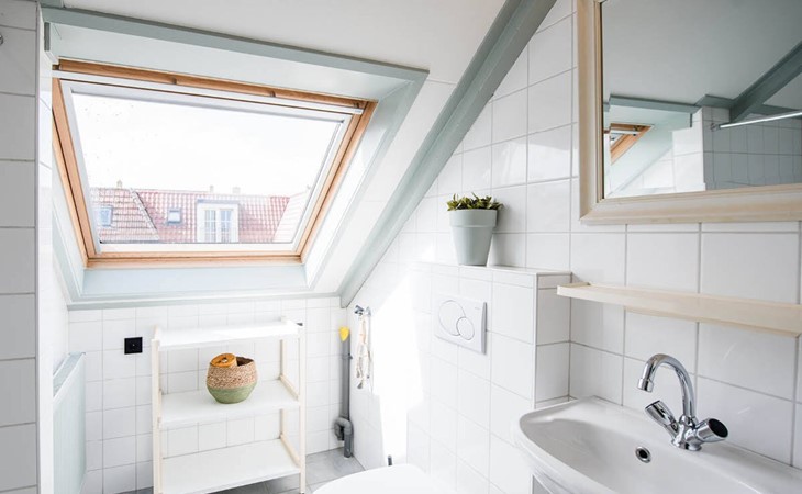 De badkamer heeft een eenvoudige douche, wastafel en toilet.
