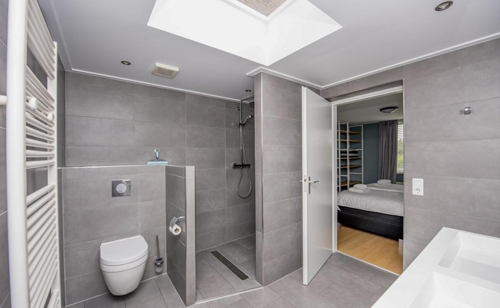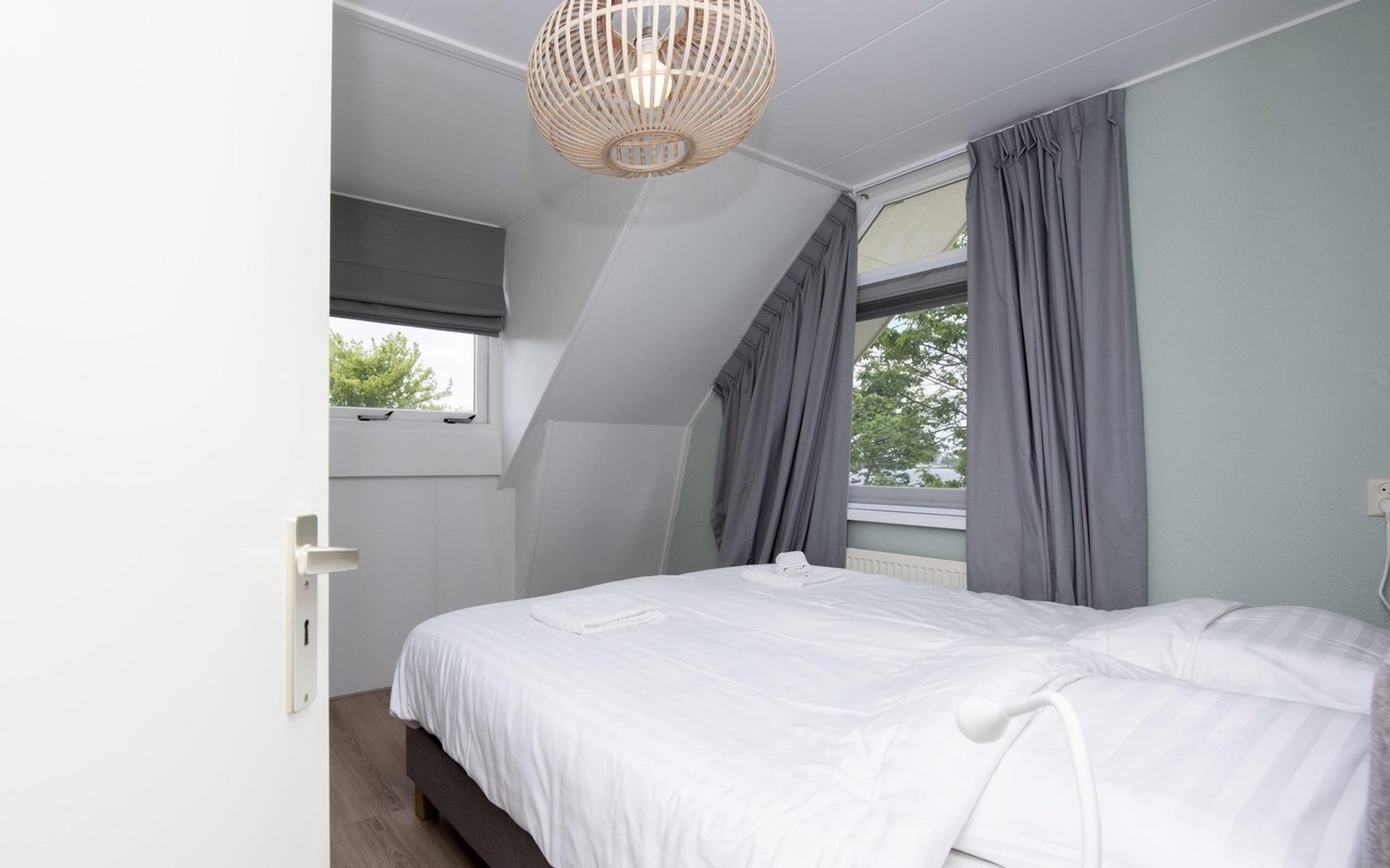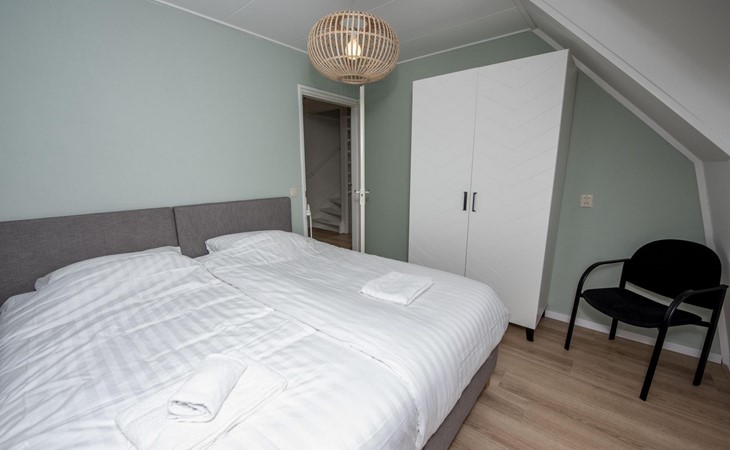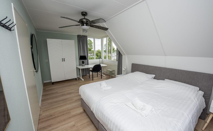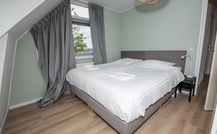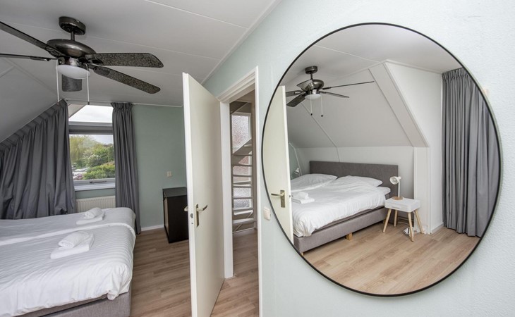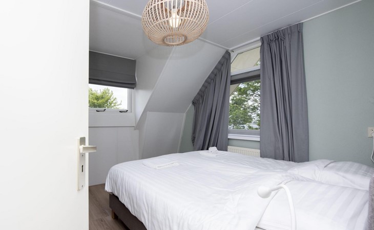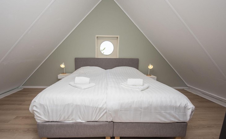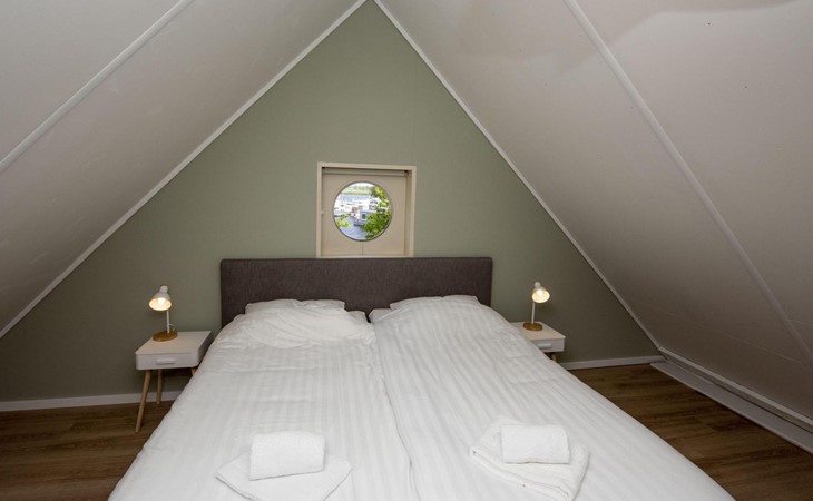 In de accommodatie zijn 4 slaapkamers met ruimte voor 8 personen. De eerste slaapkamer is gelegen op de begane grond. Door middel van een aanbouw is een ruime slaapkamer gecreëerd met hieraan een ensuite badkamer. De slaapkamer is voorzien van een boxspring tweepersoonsbed (180x200cm) en compleet ingericht met nachtkastjes, bedlampjes en een ruime kast om kleding op te bergen. De aangrenzende badkamer (7,5m2) is ingericht met een wastafelmeubel met dubbele kraan, inloopdouche met regendouche, een extra toilet en een designradiator. Via de woonkamer kom je via een deur bij de trap naar de eerste etage, hier is tevens het toilet te vinden. Op de eerste etage zijn nog eens 2 slaapkamers en een badkamer te vinden. Alle slaapkamers zijn voorzien van een tweepersoons boxspring met ieder twee nachtkastjes, bedlampjes en een kledingkast. Een van de slaapkamers op de eerste verdieping heeft zelfs een fijn bureau waardoor je in deze vakantiewoning ook heerlijk rustig kan werken en dit met vakantie kan combineren. De tweede badkamer (6m2) met een royaal hoekbad, wastafelmeubel en losse douchecabine bevat ook nog een extra toilet. Via de open trap kom je bij de derde slaapkamer op de zolder van de woning met wederom een tweepersoons boxspring, nachtkastjes en bedverlichting, hier is het heerlijk slapen onder het puntdak en het bijzondere ronde raam geeft een uniek doorkijkje op het Sneekermeer.
