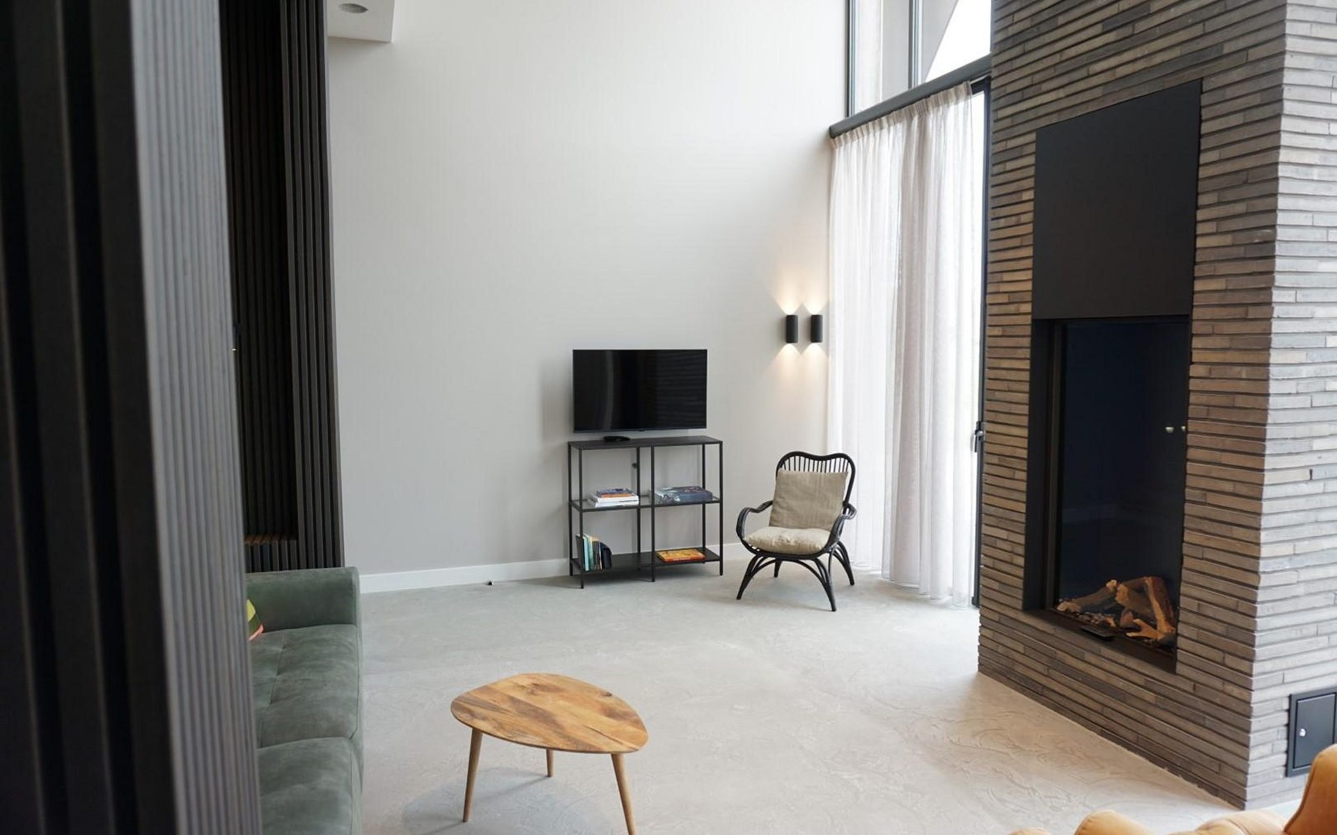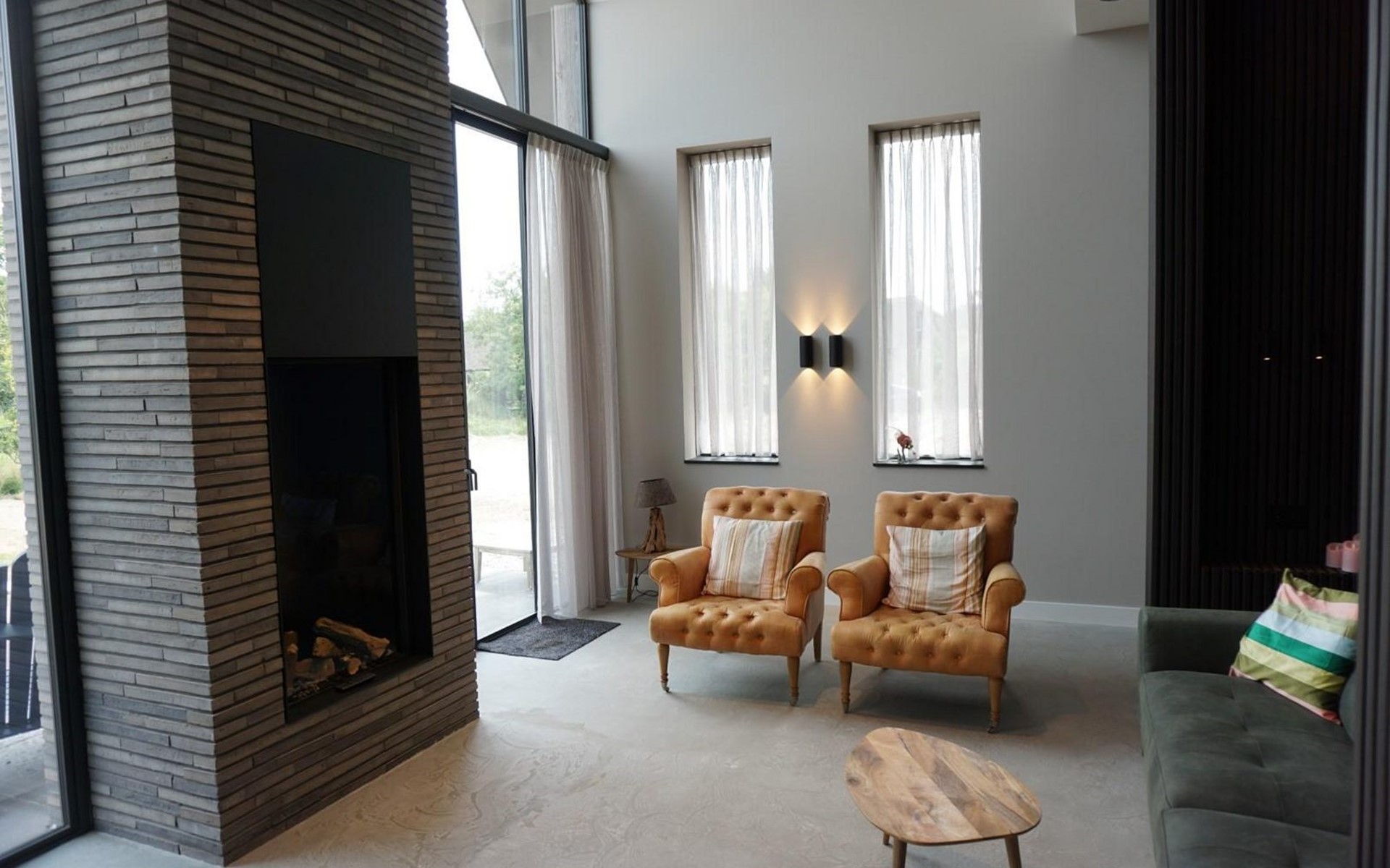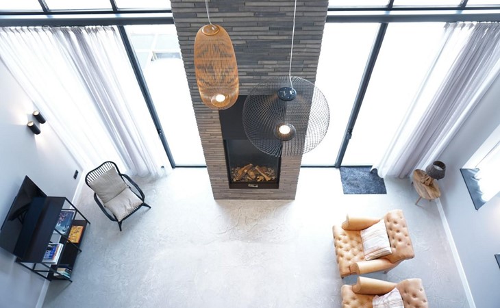 Op de begane grond is een entree met garderobe en wasmachine. Er is een luxe open keuken, zeer compleet en voorzien van alle gemakken. De living met hoogplafond heeft een heerlijke bank met zicht op de gashaard.