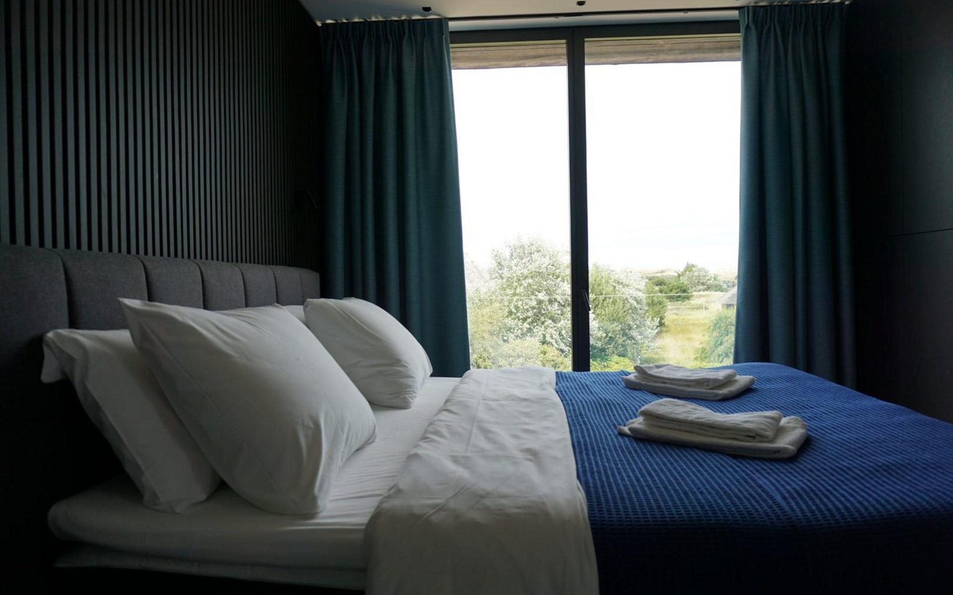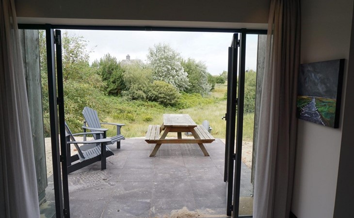 Via de trap in het midden van het huis bereik je de vide met zicht op de woonkamer. Hier bevindt zich de ‘master bedroom' met Emma Deluxe 2 persoons Boxspring (180x200cm) en eigen sanitair. En wat deze kamer echt uniek maakt is het uitzicht over de duinen!