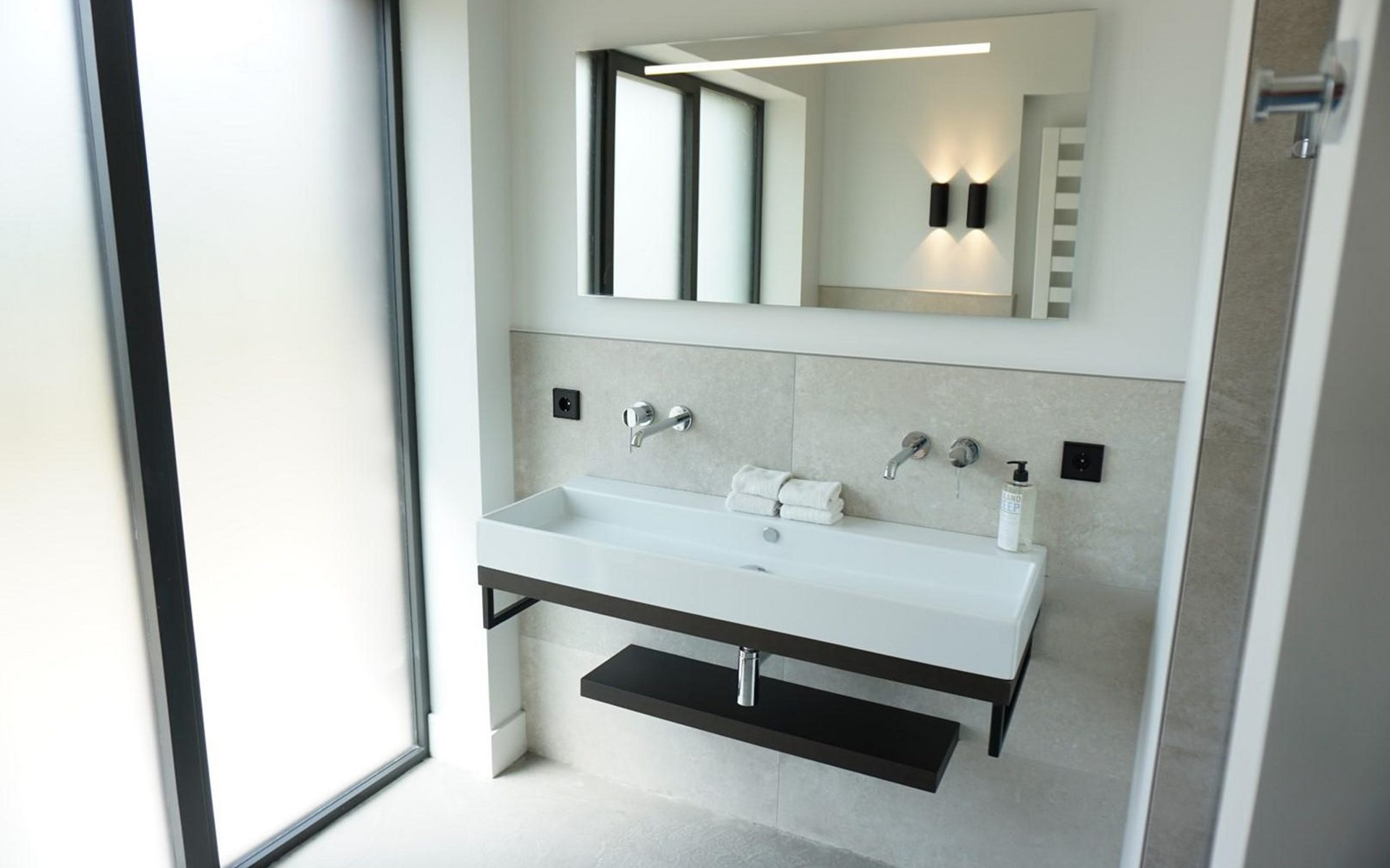 Op de begane grond is een badkamer met inloopdouche, dubbele wastafel en toilet. Er is een gastentoilet in de hal. In de slaapkamer op de verdieping is een 2e badkamer ensuite (in de slaapkamer een douche, toilet en wastafel).