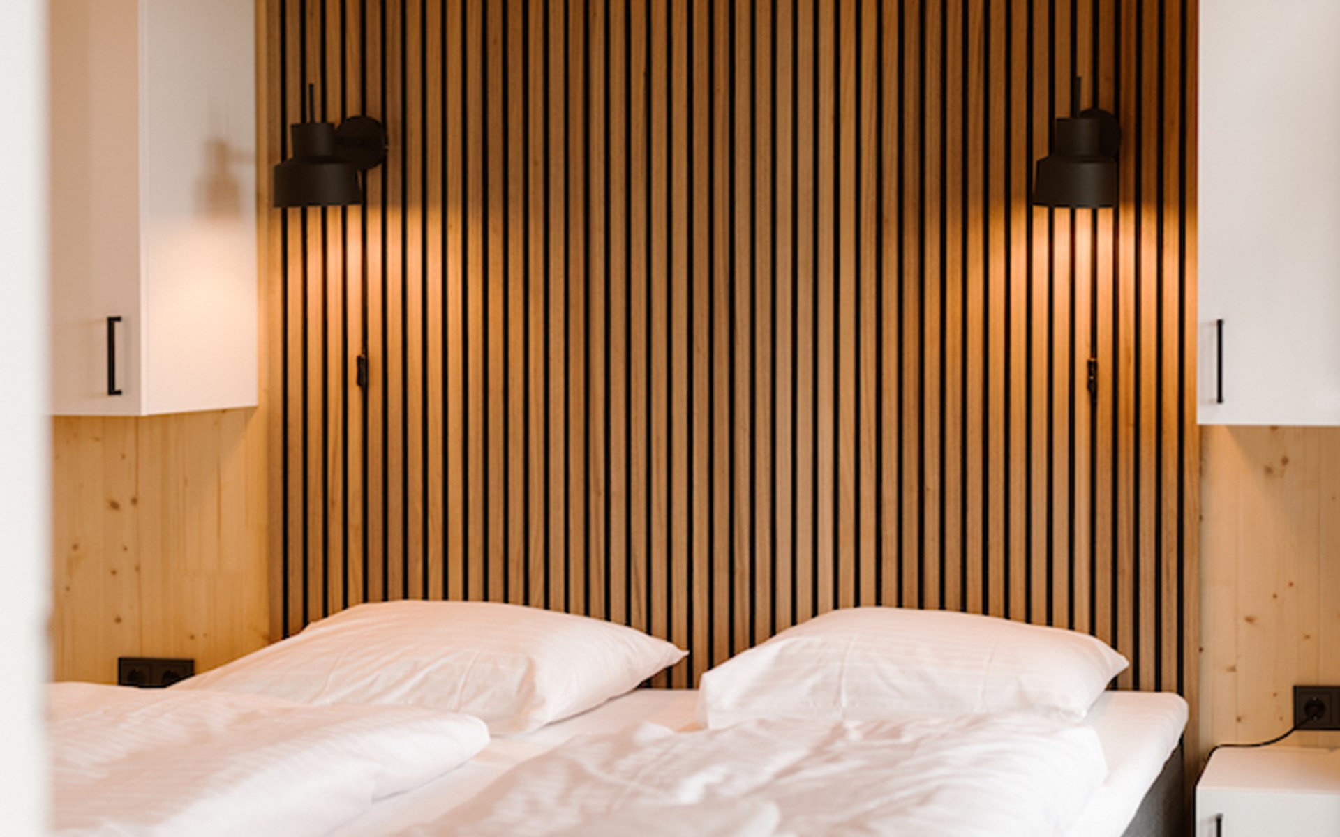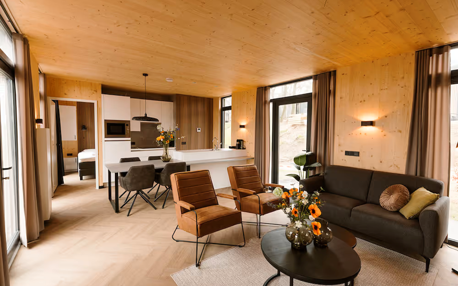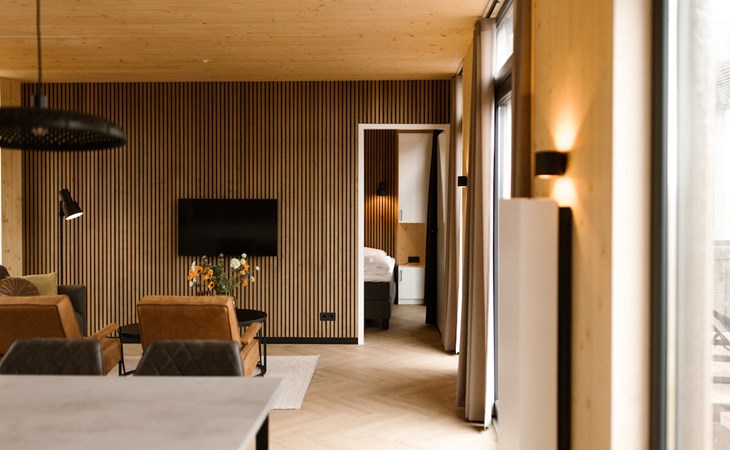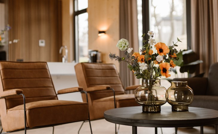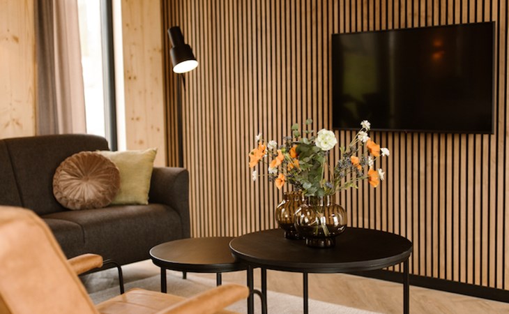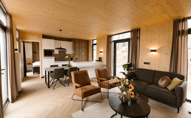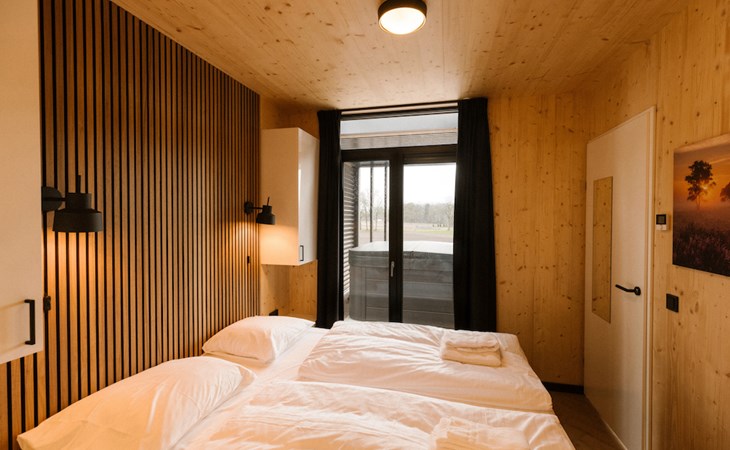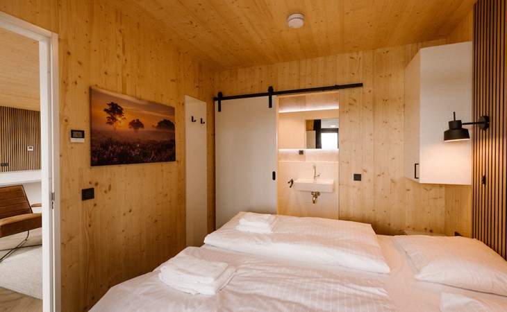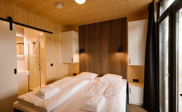 Ontspannen na een drukke (werk)dag lukt zonder moeite in het moderne interieur van onze lodges. De twee slaapkamers zijn beide voorzien van badkamer en suite. I.v.m. de indeling past het kinderbed niet in de slaapkamers. Deze zetten wij voor u klaar in de woonkamer.