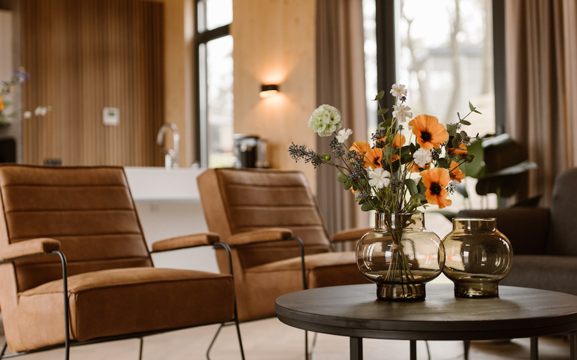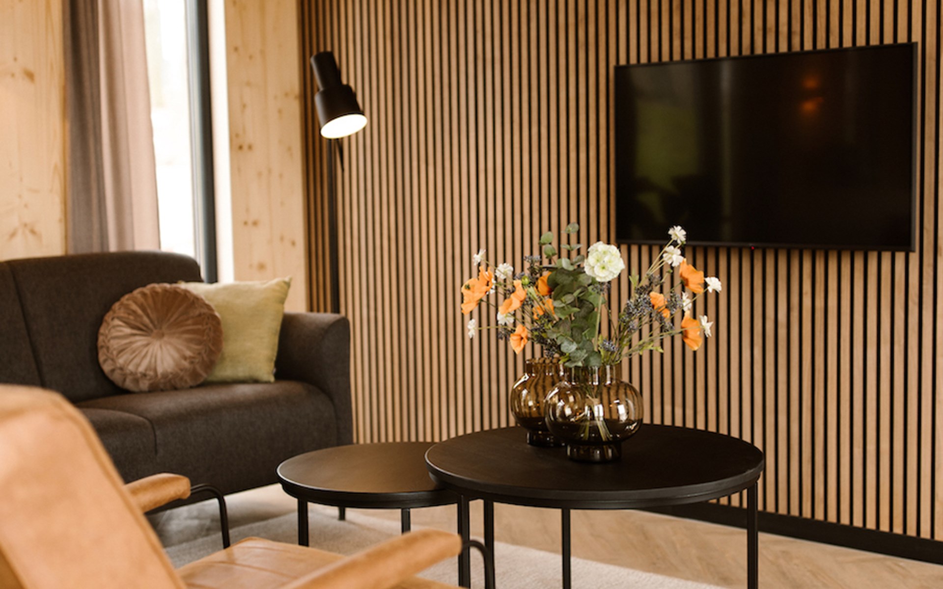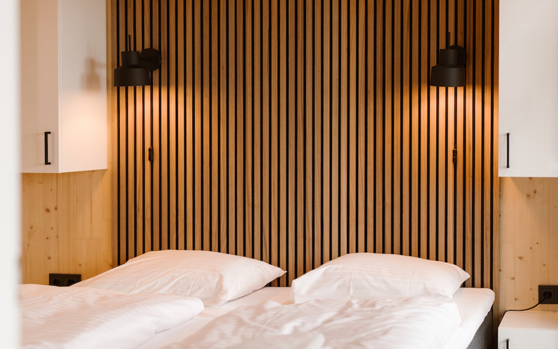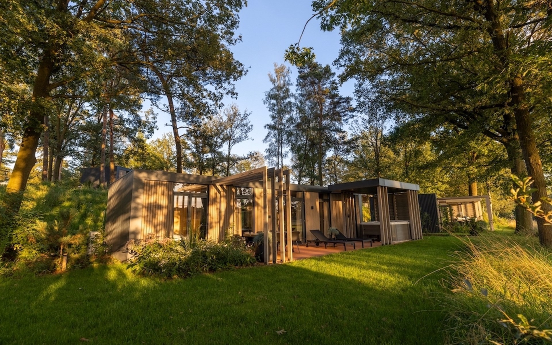 Ontspannen na een drukke (werk)dag lukt zonder moeite in het moderne interieur van onze lodges. De twee slaapkamers zijn beide voorzien van badkamer en suite. I.v.m. de indeling past het kinderbed niet in de slaapkamers. Deze zetten wij voor u klaar in de woonkamer.
