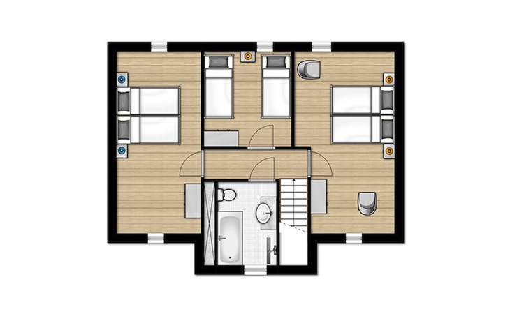Op de eerste verdieping zijn er 3 slaapkamers met elk 2 éénpersoons boxsprings. Ook is er 1 badkamer met een ligbad, wastafel en toilet.