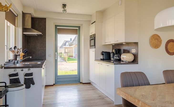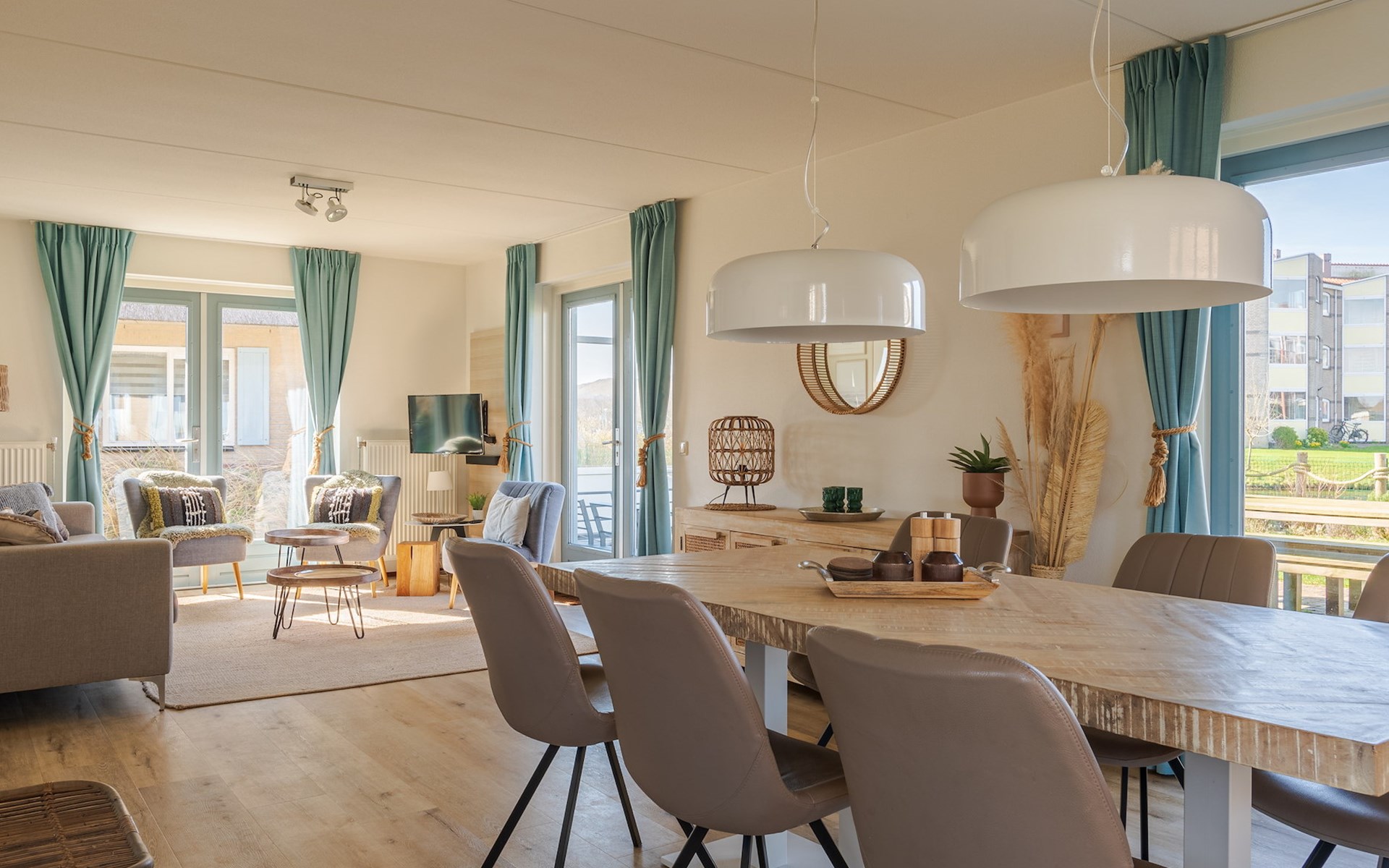 De sfeervolle woonkamer beschikt over een zithoek met een smart-tv. De open keuken is van alle gemakken voorzien met onder andere een combi-oven, filter koffiezetapparaat, Senseo apparaat, vaatwasser en een koelkast met vriesvak. Naast de open keuken bevindt zich de eethoek.