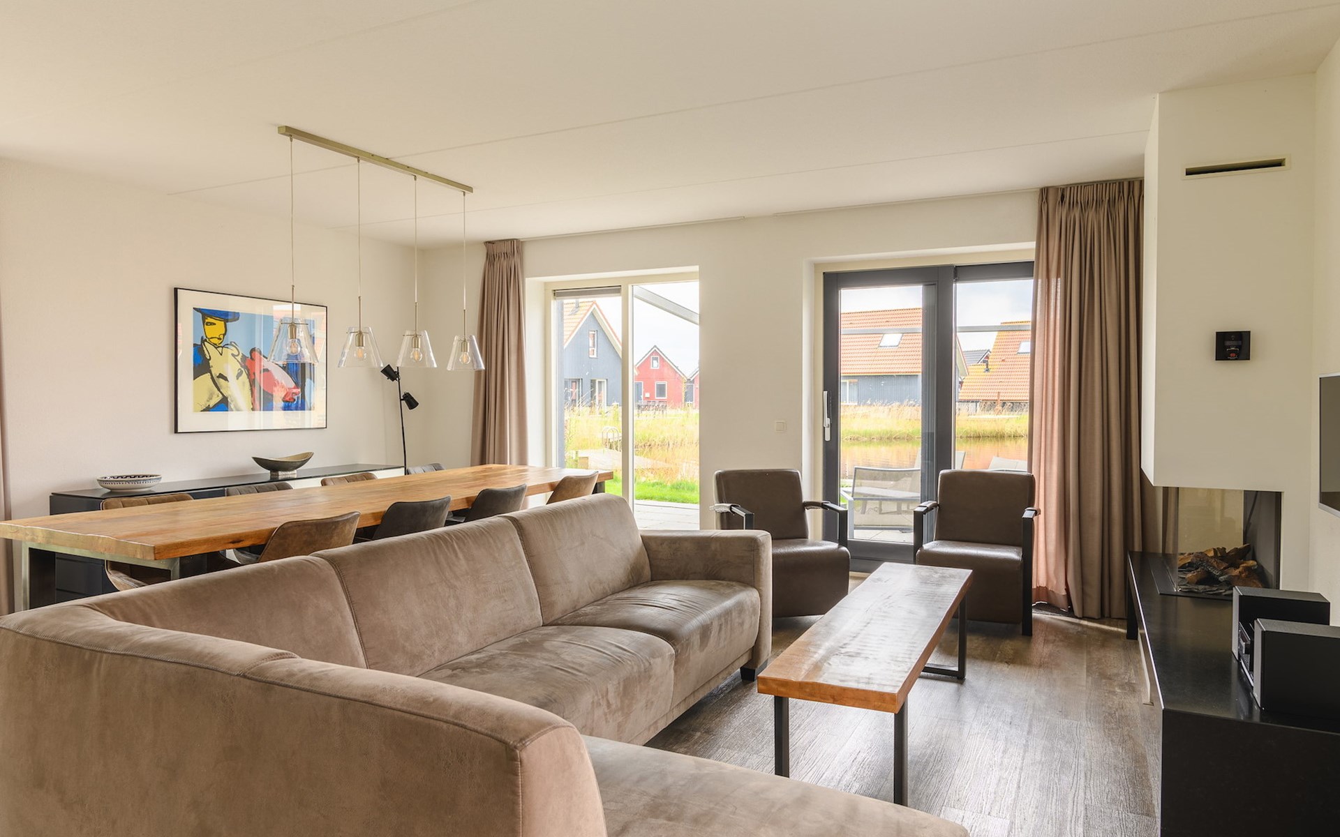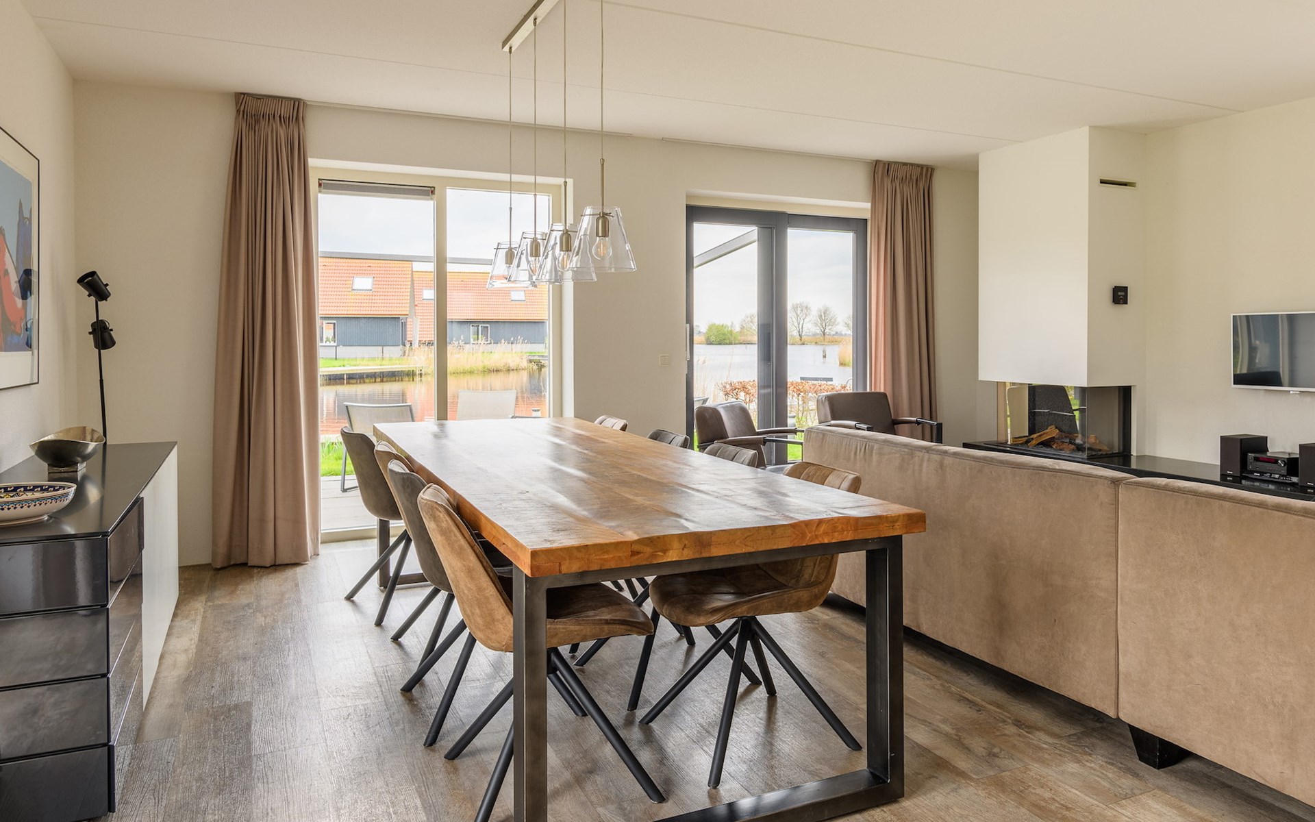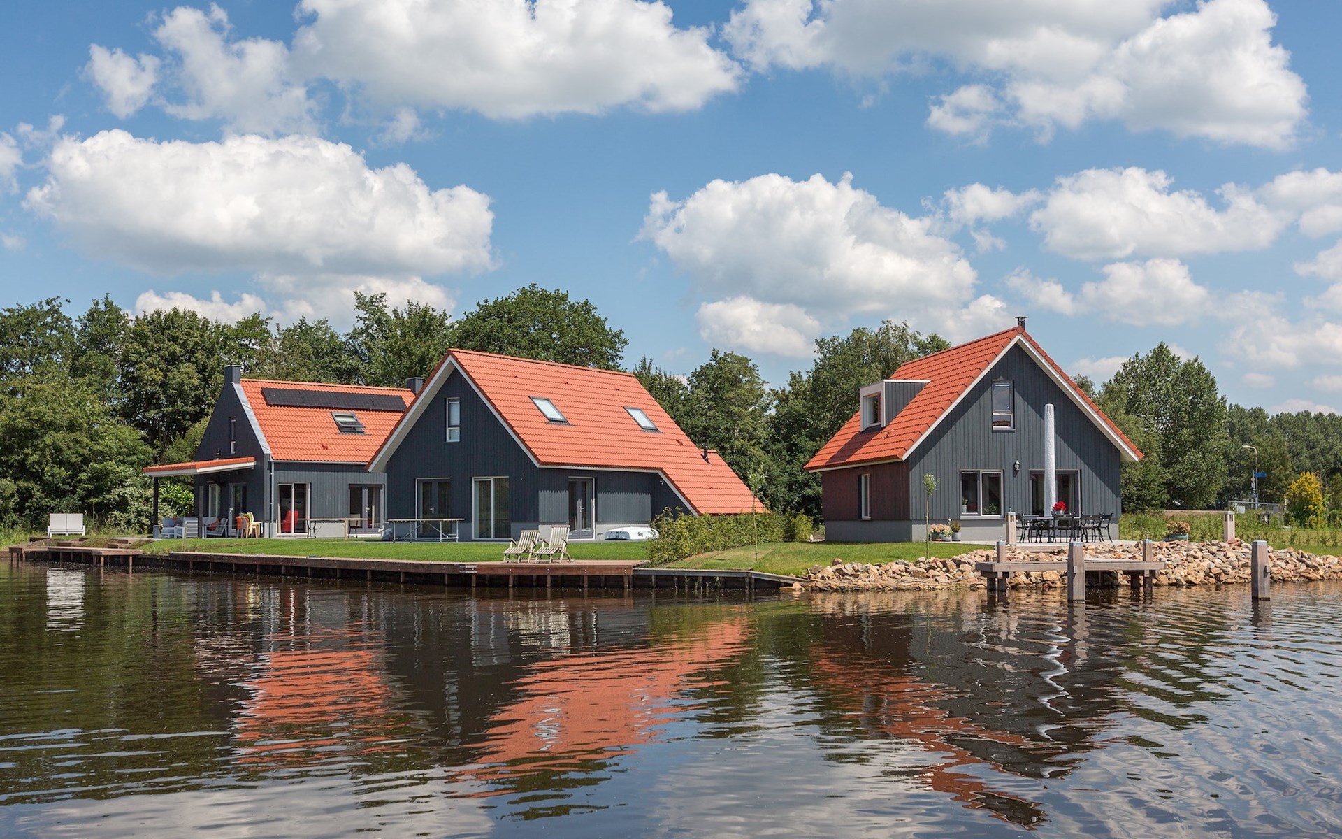 Via de openslaande tuindeuren in de woonkamer bereik je de tuin op het zuiden met een comfortabele loungeset. Vanuit je tuin heb je een prachtig uitzicht over het water. Ook heb je de beschikking over een privé steiger waar je een kleine boot kunt meren of kunt vissen in het visrijke meer.