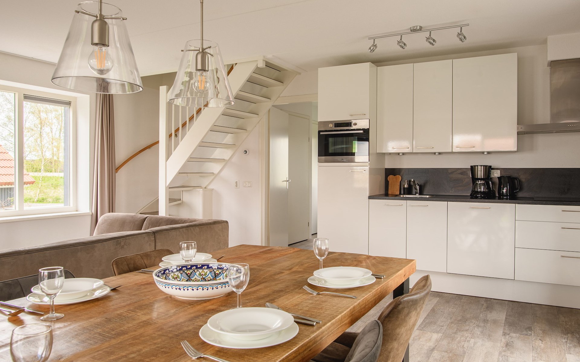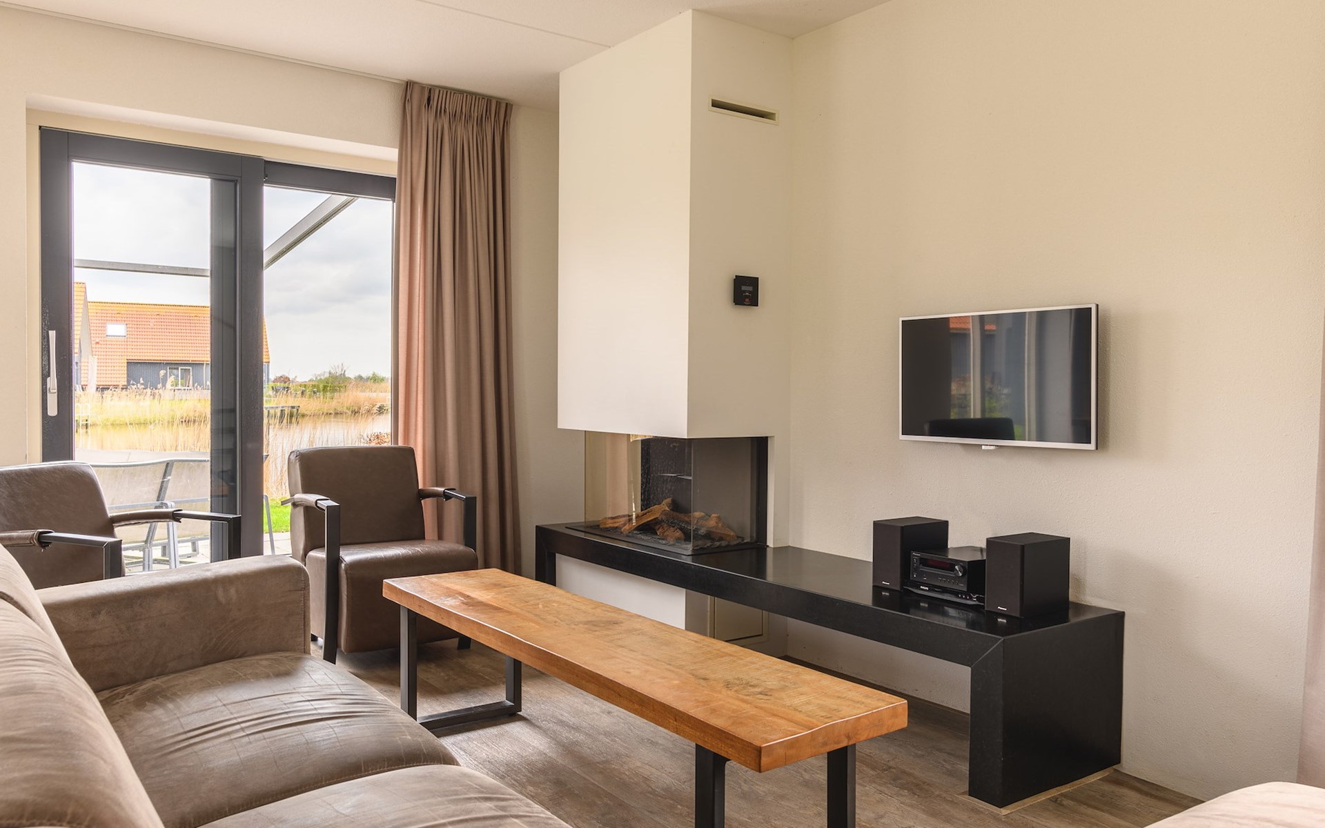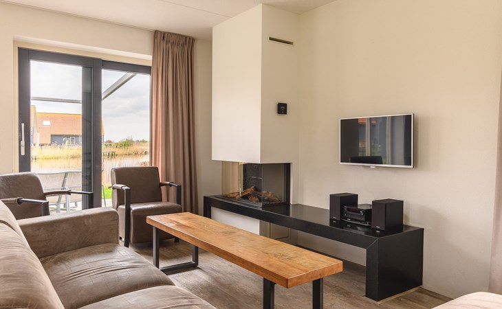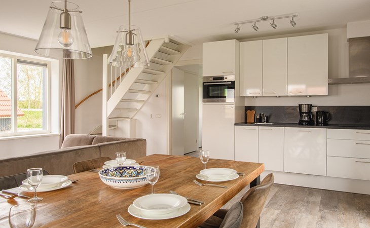 De woonkamer is voorzien van vloerverwarming en een comfortabele zithoek met een smart-tv en een sfeerhaard. Daarnaast is er een eethoek waar je met het hele gezelschap heerlijk kunt tafelen. De open keuken is van alle gemakken voorzien met onder andere een combi-oven, vaatwasser, koffiezetapparaat en een Senseo apparaat. Verder beschikt de woning over een separaat toilet, wasmachine, wasdroger en een berging die via een buitendeur te bereiken is.