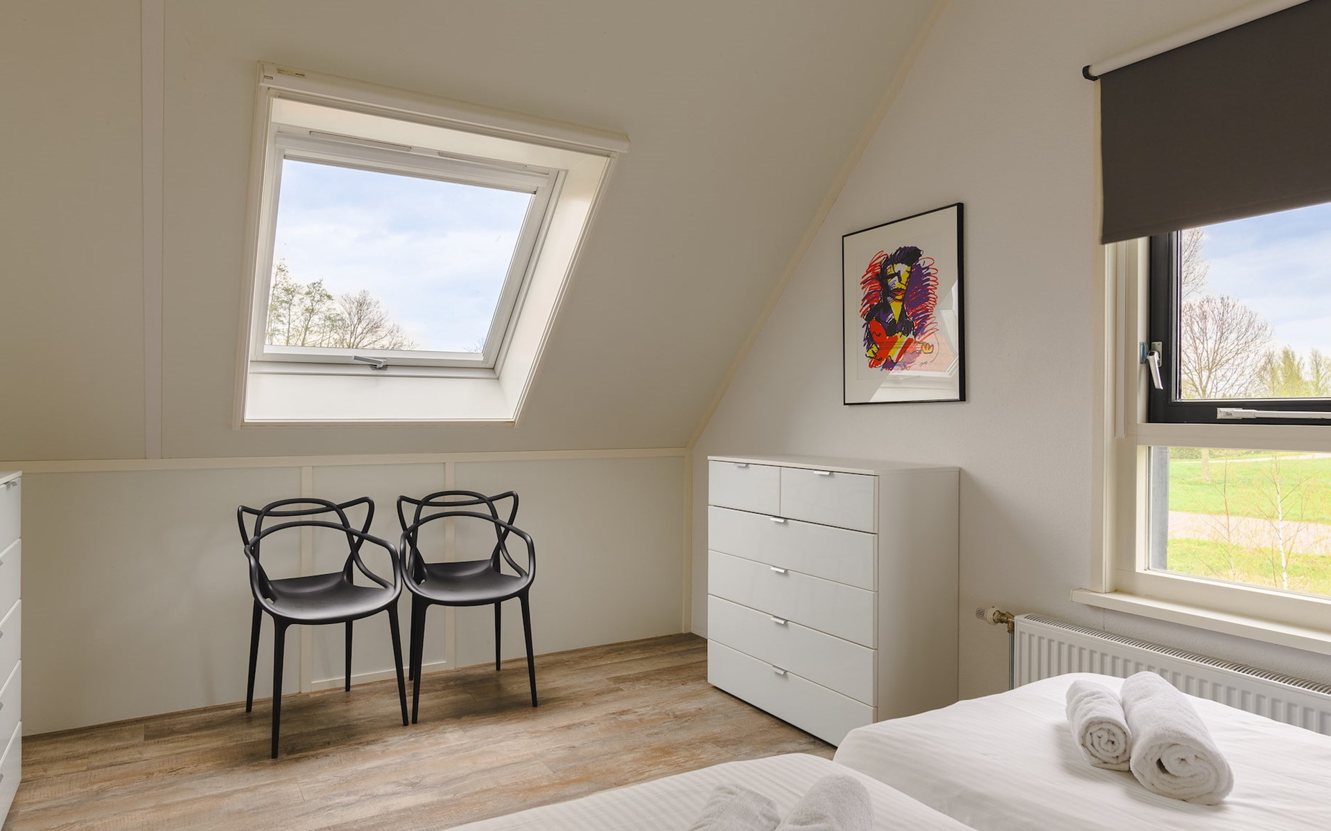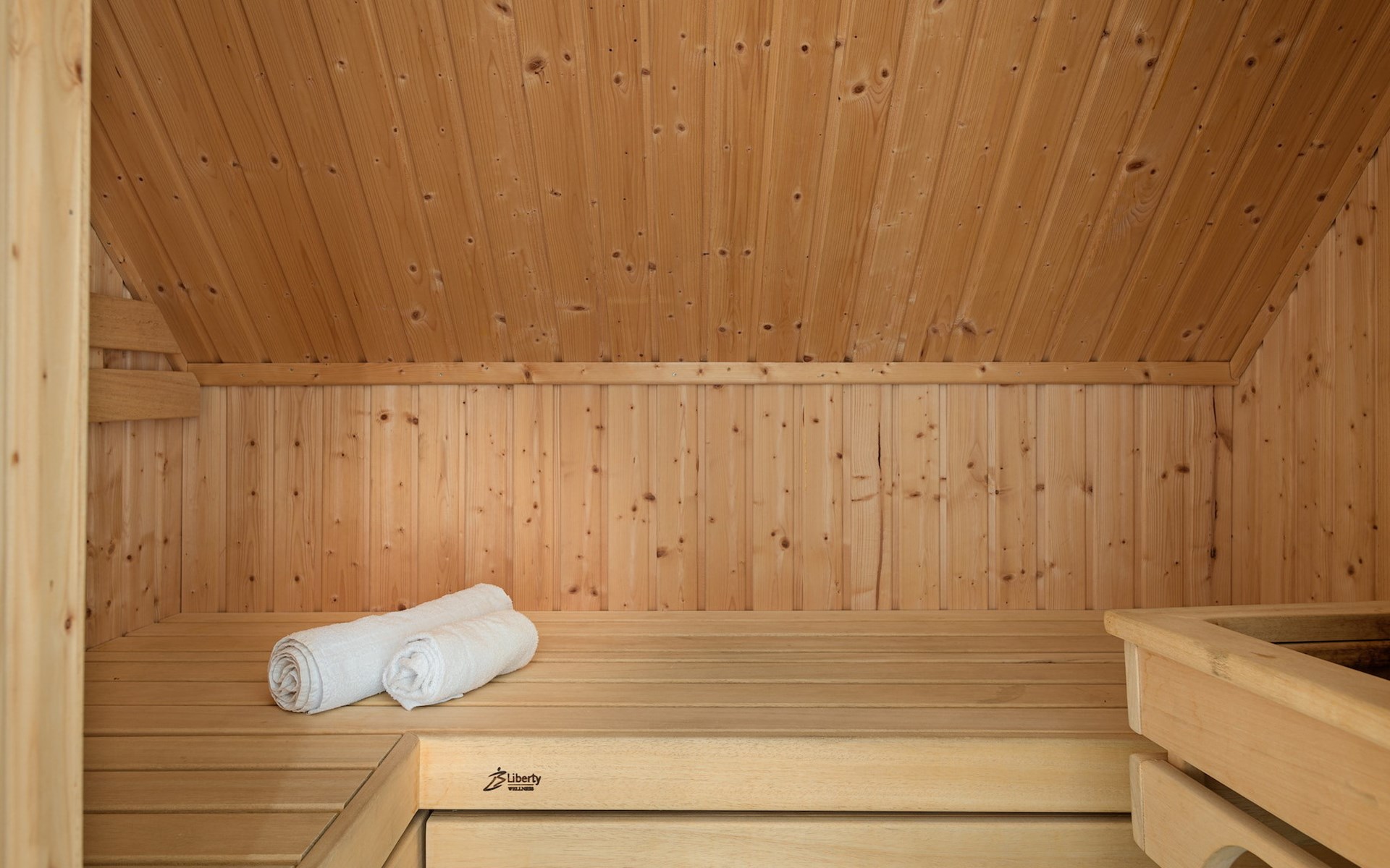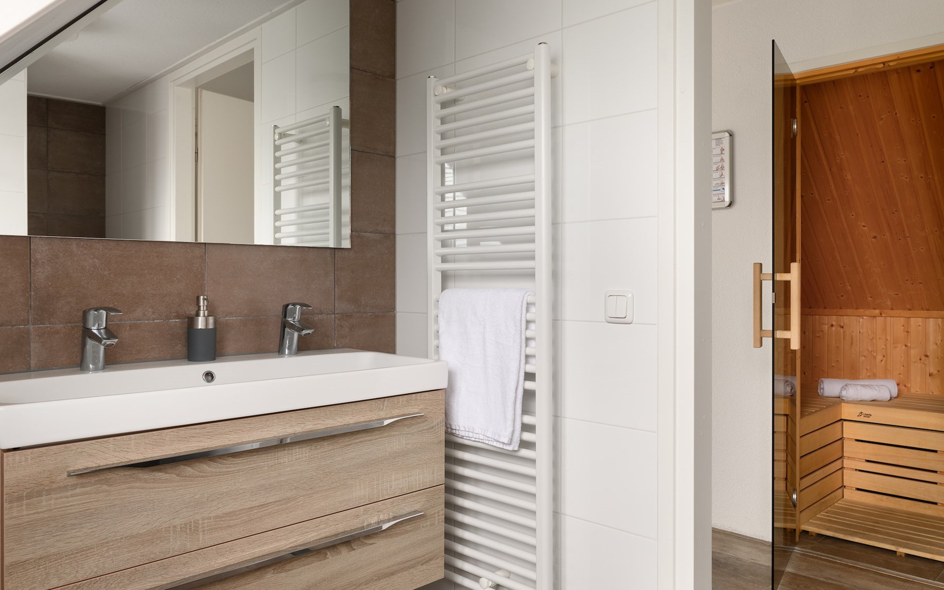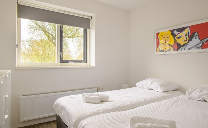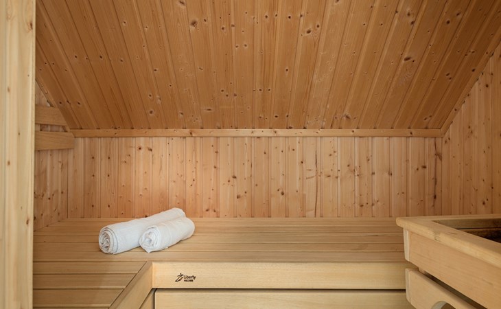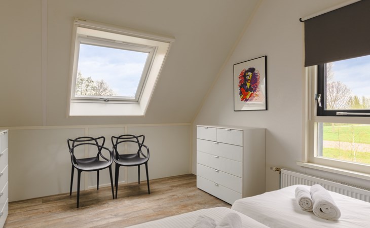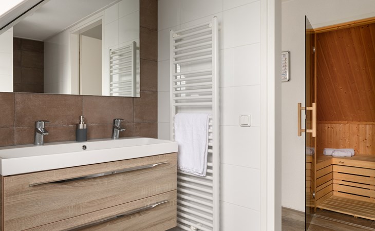 Op de begane grond bevindt zich 1 slaapkamer met 2 éénpersoons boxsprings en 1 badkamer met vloerverwarming, een inloopdouche, wastafel en een toilet. Ook is er een privé sauna in de badkamer voor het ultieme vakantiegevoel!