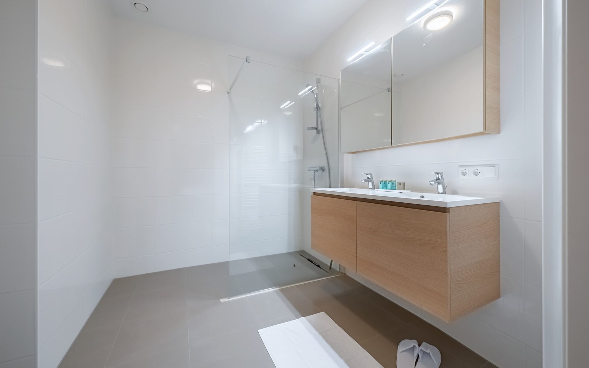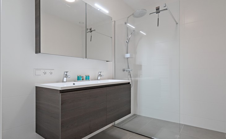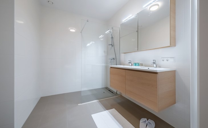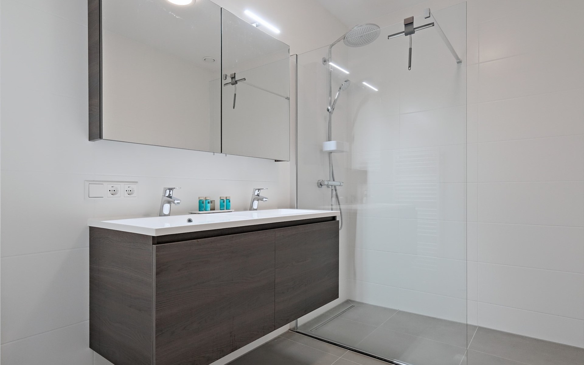 Het royale appartement heeft 3 slaapkamers met elk een 2-persoonsbed. Eén slaapkamer heeft een en-suite badkamer die is voorzien van een inloopdouche, dubbele wastafel en toilet. De tweede badkamer is bereikbaar via de hal en beschikt over een douche en dubbele wastafel. Daarnaast is er een separaat toilet aanwezig.