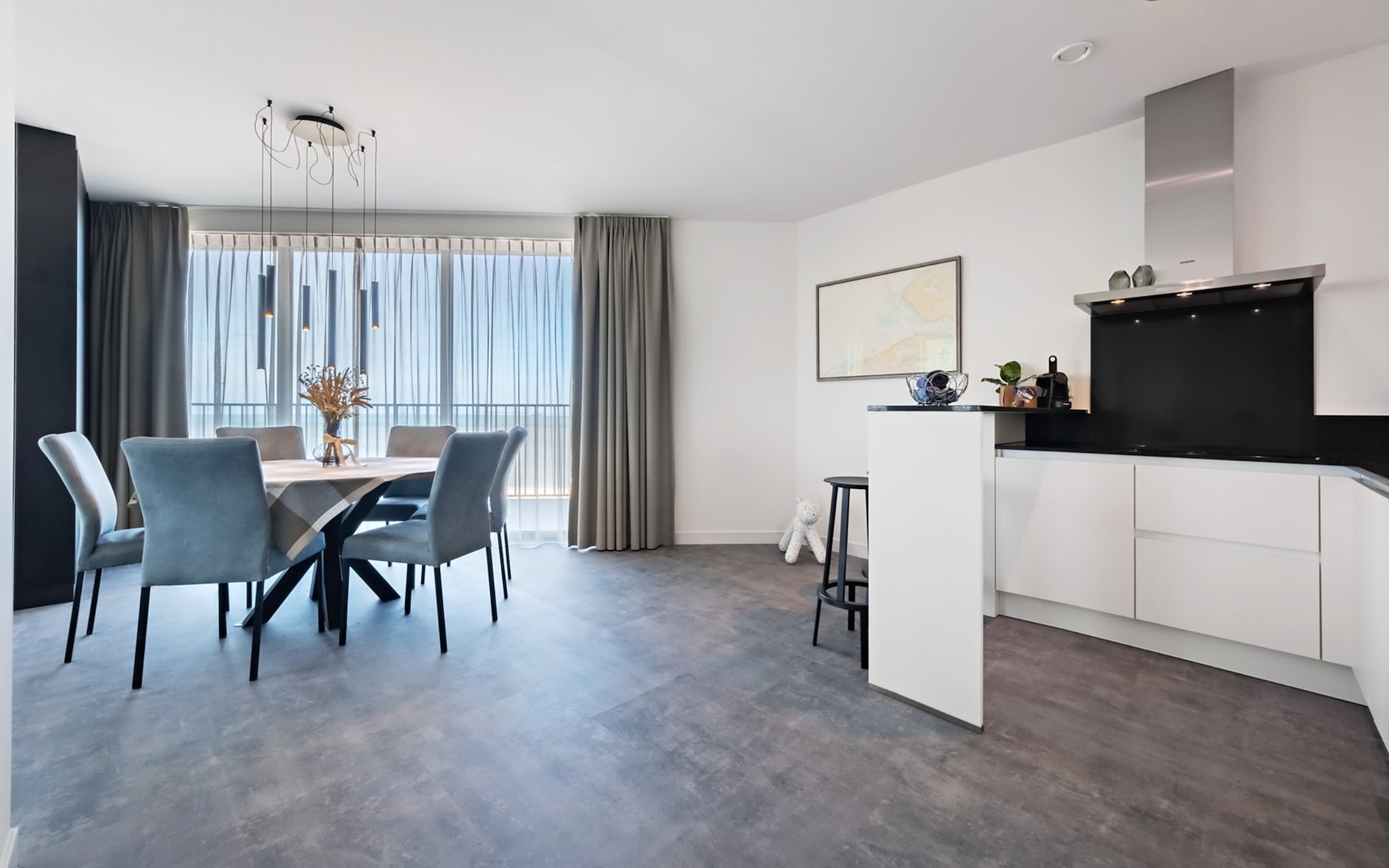 De royale woonkamer van appartement Pharos Sea Breeze Panorama is voorzien van een sfeervolle zithoek met voldoende ruimte voor het hele gezelschap en een smart-tv met streaming mogelijkheid. Daarnaast is er een eetgedeelte en een open keuken die van alle gemakken is voorzien, waaronder een koel-vriescombinatie, combi-oven, Nespresso apparaat en vaatwasser.