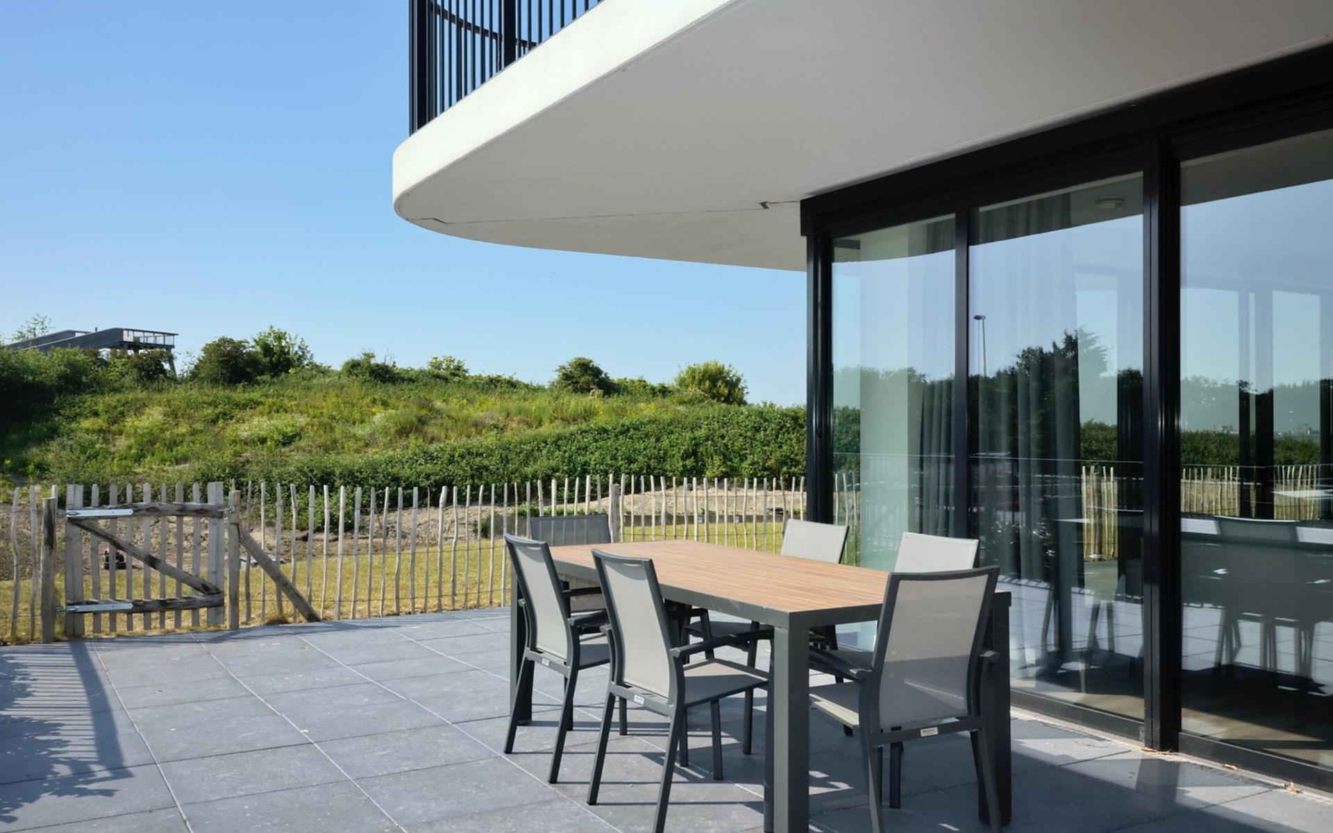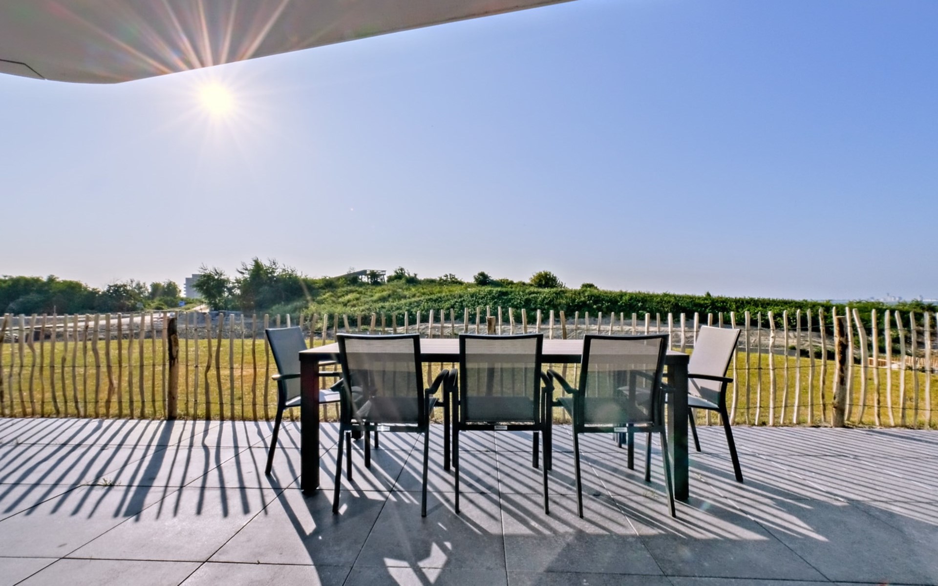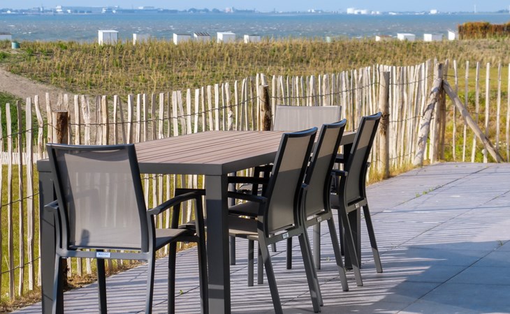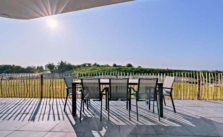 Het ruime, gemeubileerde terras bevindt zich rondom het appartement en biedt je uitzicht op de duinen. Je kunt het terras bereiken via de woonkamer en alle slaapkamers. Zo kun je direct genieten van de gezonde zeelucht als je wakker wordt en de deur opent. Een goed begin van de dag!